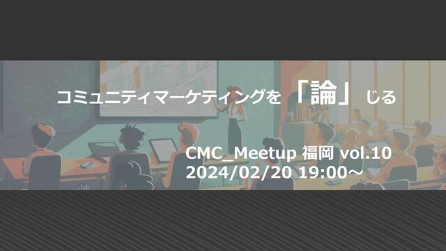 2024/02/20開催 CMC_Meetup 福岡 vol.10 のオープニング進行スライドです。 当日の登壇者: ・コミュニティマーケティング推進協会 フェロー 長橋さん ・福岡大学 商学部 太宰教授 ・ヌーラボ 坂本さん ・九州医事新報社 小川さん ・再春館製薬所 田中さん ・アビスパ福岡 平田さん ・ファンベースカンパニー 津田さん