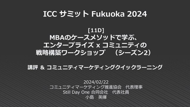 2024/02/22開催 ICCサミット福岡 2024での、コミュニティマーケティングワークショップでの講評&コミュニティマーケティングクイックラーニング、の資料です。
