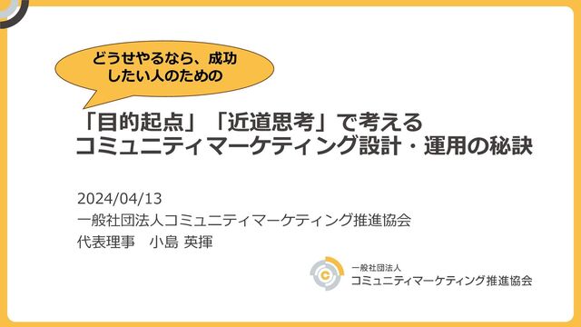 「目的起点」「近道思考」で考える コミュニティマーケティング設計・運用の秘訣 2024/04/13 一般社団法人コミュニティマーケティング推進協会 代表理事 小島 英揮 どうせやるなら、成功 したい人のための