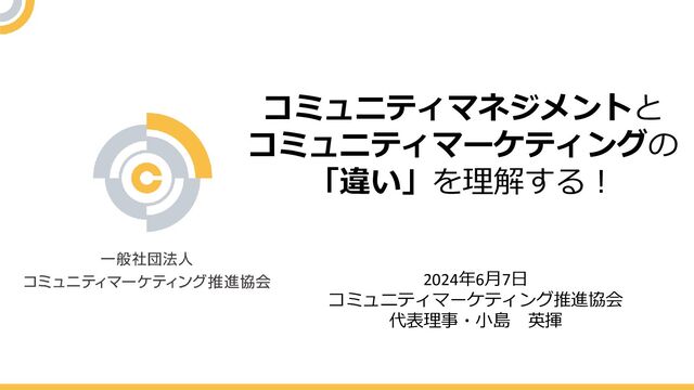 コミュニティマネジメントと コミュニティマーケティングの 「違い」を理解する! 2024年6月7日 コミュニティマーケティング推進協会 代表理事・小島 英揮