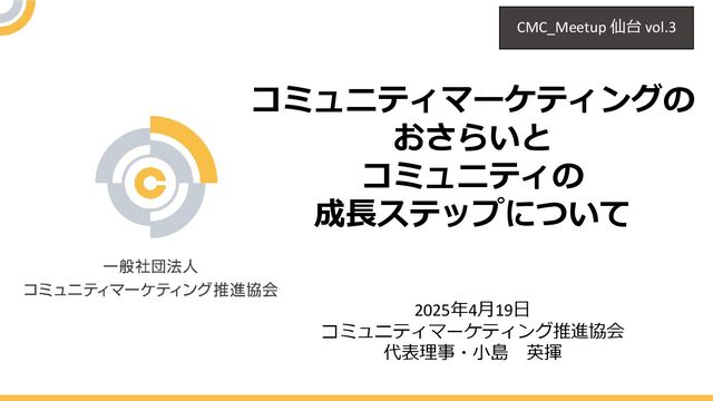2025/04/19開催 CMC_Meetup 仙台 vol.3 のオープニングセッション「コミュニティマーケティングのおさらいとコミュニティの成長ステップについて」のスライドです。 https://eventregist.com/e/CMC_SDJ3