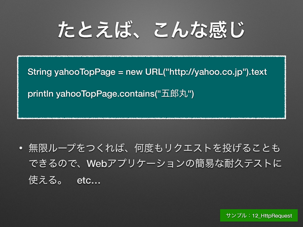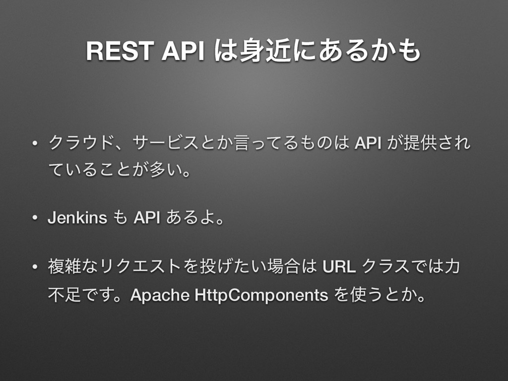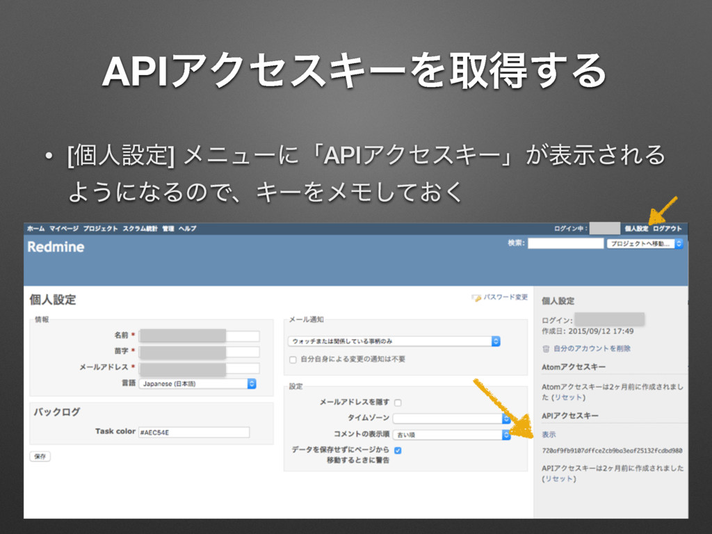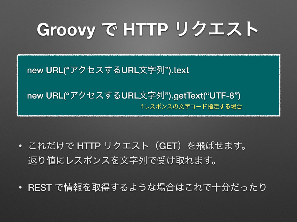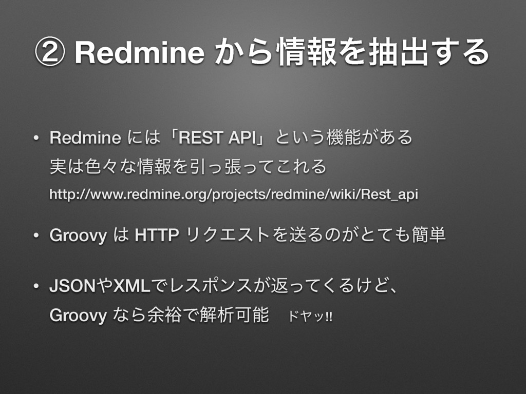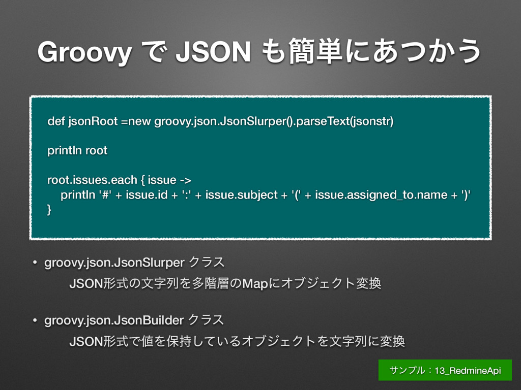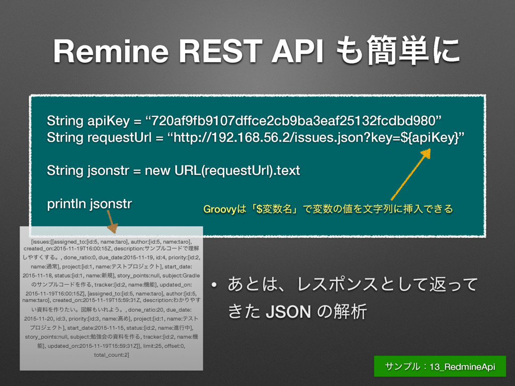 apiKey = “720af9fb9107dffce2cb9ba3eaf25132fcdbd980” String requestUrl = “http://192.168.56.2/issues.json?key=${apiKey}” String jsonstr = new URL(requestUrl).text println jsonstr Groovyʮ$ม໊ʯͰมͷΛจࣈྻʹૠೖͰ͖Δ [issues:[[assigned_to:[id:5, name:taro], author:[id:5, name:taro], created_on:2015-11-19T16:00:15Z, description:αϯϓϧίʔυͰཧղ ͘͢͢͠Δɻ, done_ratio:0, due_date:2015-11-19, id:4, priority:[id:2, name:௨ৗ], project:[id:1, name:ςετϓϩδΣΫτ], start_date: 2015-11-18, status:[id:1, name:৽ن], story_points:null, subject:Gradle ͷαϯϓϧίʔυΛ࡞Δ, tracker:[id:2, name:ػೳ], updated_on: 2015-11-19T16:00:15Z], [assigned_to:[id:5, name:taro], author:[id:5, name:taro], created_on:2015-11-19T15:59:31Z, description:Θ͔Γ͢ ͍ࢿྉΛ࡞Γ͍ͨɻਤղ͍ΕΑ͏ɻ, done_ratio:20, due_date: 2015-11-20, id:3, priority:[id:3, name:ߴΊ], project:[id:1, name:ςετ ϓϩδΣΫτ], start_date:2015-11-15, status:[id:2, name:ਐߦத], story_points:null, subject:ษڧձͷࢿྉΛ࡞Δ, tracker:[id:2, name:ػ ೳ], updated_on:2015-11-19T15:59:31Z]], limit:25, offset:0, total_count:2] αϯϓϧɿ13_RedmineApi