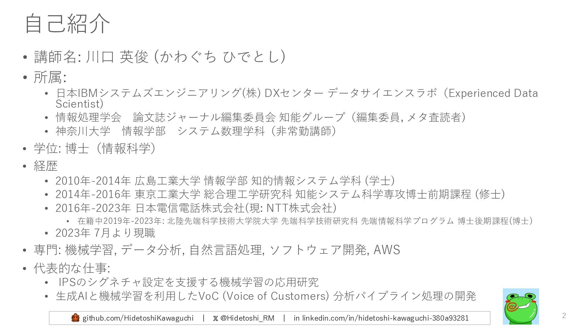 日本IBMシステムズエンジニアリング(株) DXセンター データサイエンスラボ(Experienced Data Scientist) • 情報処理学会 論文誌ジャーナル編集委員会 知能グループ(編集委員, メタ査読者) • 神奈川大学 情報学部 システム数理学科(非常勤講師) • 学位: 博士(情報科学) • 経歴 • 2010年-2014年 広島工業大学 情報学部 知的情報システム学科 (学士) • 2014年-2016年 東京工業大学 総合理工学研究科 知能システム科学専攻博士前期課程 (修士) • 2016年-2023年 日本電信電話株式会社(現: NTT株式会社) • 在籍中2019年-2023年: 北陸先端科学技術大学院大学 先端科学技術研究科 先端情報科学プログラム 博士後期課程(博士) • 2023年 7月より現職 • 専門: 機械学習, データ分析, 自然言語処理, ソフトウェア開発, AWS • 代表的な仕事: • IPSのシグネチャ設定を支援する機械学習の応用研究 • 生成AIと機械学習を利用したVoC (Voice of Customers) 分析パイプライン処理の開発 2 github.com/HidetoshiKawaguchi | 𝕏 @Hidetoshi_RM | in linkedin.com/in/hidetoshi-kawaguchi-380a93281
