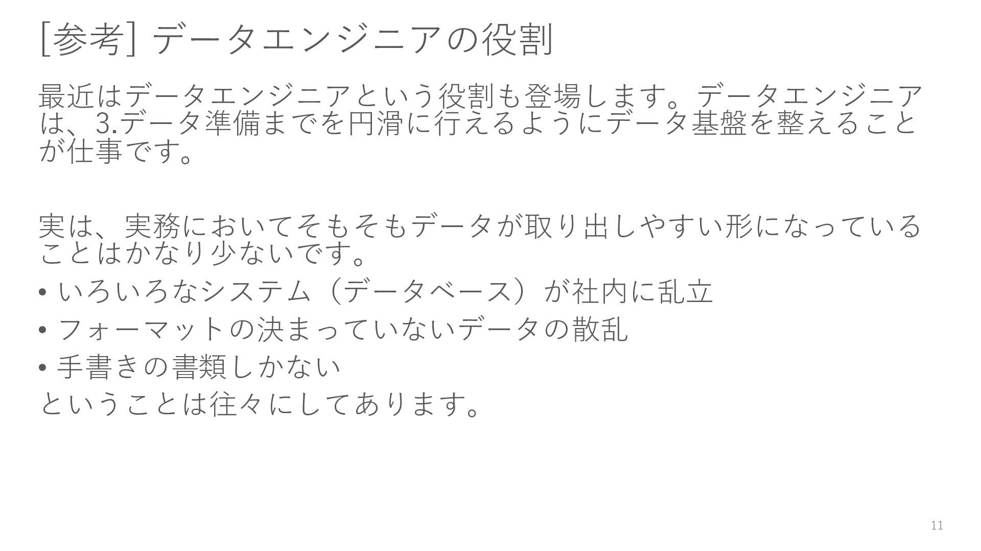 10. EDAの管理ルール(2) • ビギナーのうちは自分がやったことを全部説明したくなる → 身近な先輩であれば良いかもですが、お客さんに説明するときは 我慢して、伝えるべきことを厳選しましょう • Notebook はレビューが難しい →