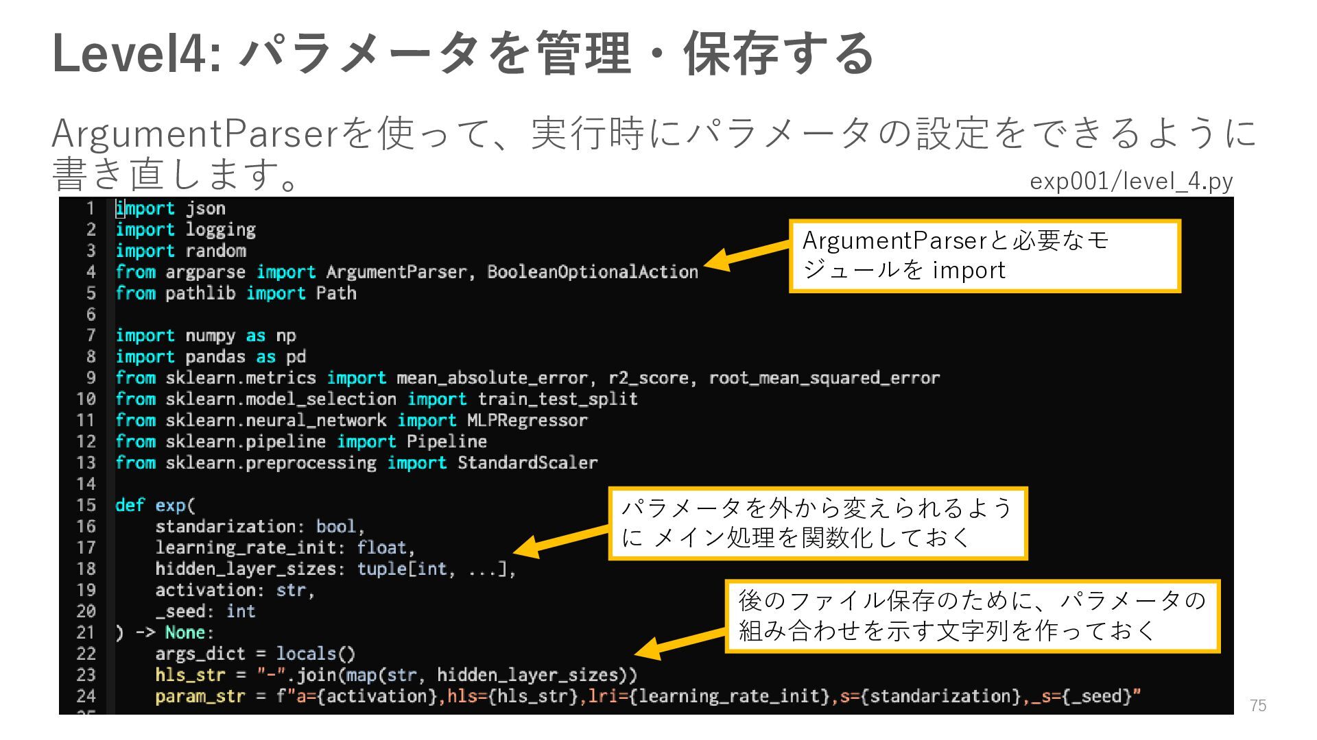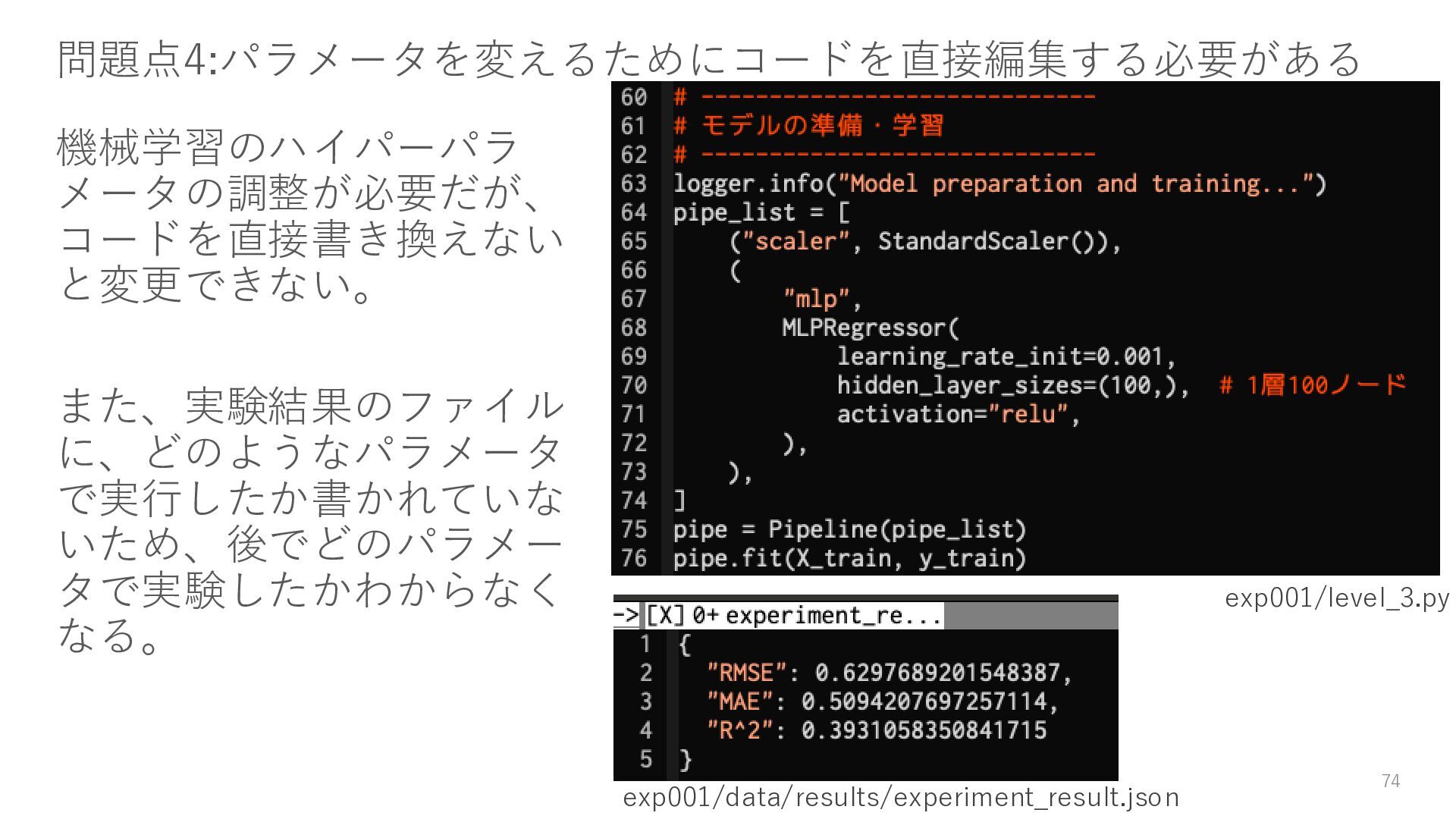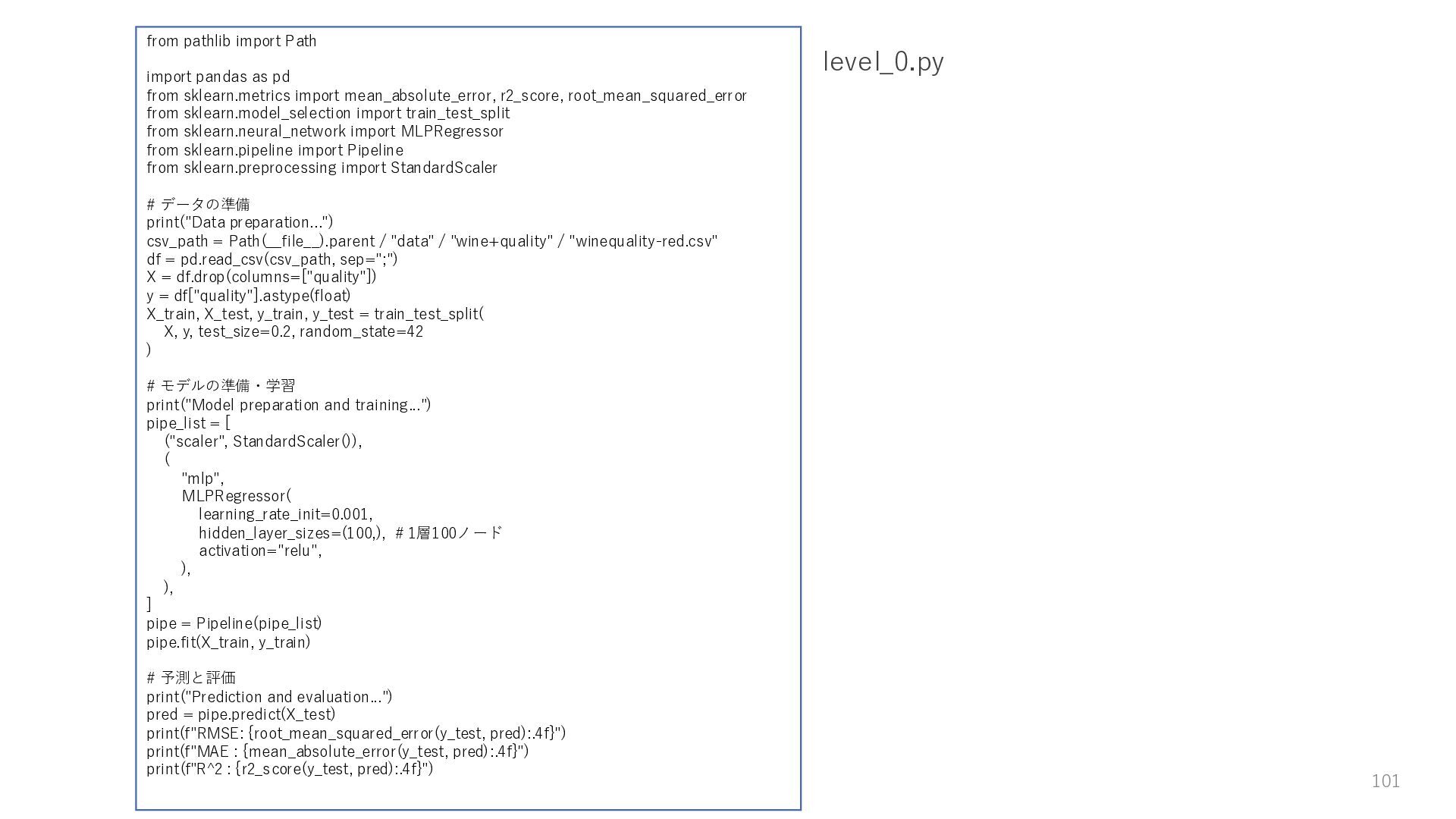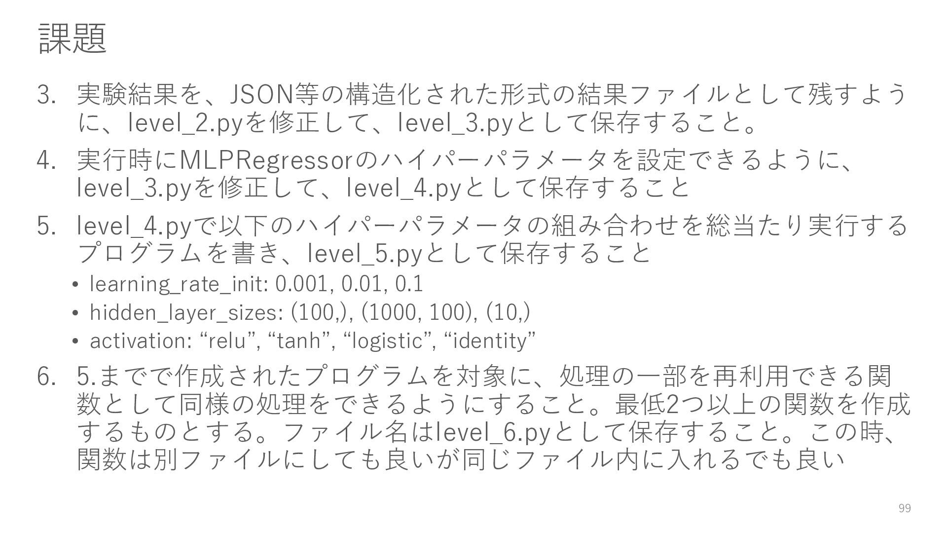 20. 課題 3. 実験結果を、JSON等の構造化された形式の結果ファイルとして残すよう に、level_2.pyを修正して、level_3.pyとして保存すること。 4. 実行時にMLPRegressorのハイパーパラメータを設定できるように、 level_3.pyを修正して、level_4.pyとして保存すること 5. level_4.pyで以下のハイパーパラメータの組み合わせを総当たり実行する プログラムを書き、level_5.pyとして保存すること