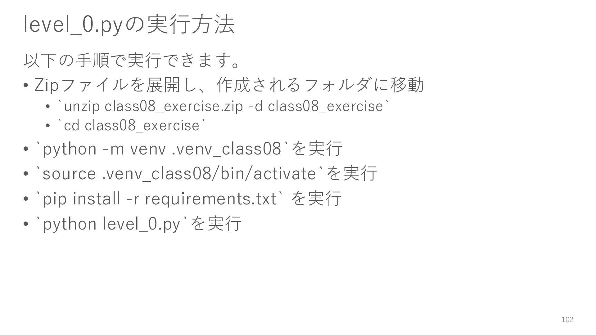 23. level_0.pyの実行方法 以下の手順で実行できます。 • Zipファイルを展開し、作成されるフォルダに移動 • `unzip class08_exercise.zip -d class08_exercise` •