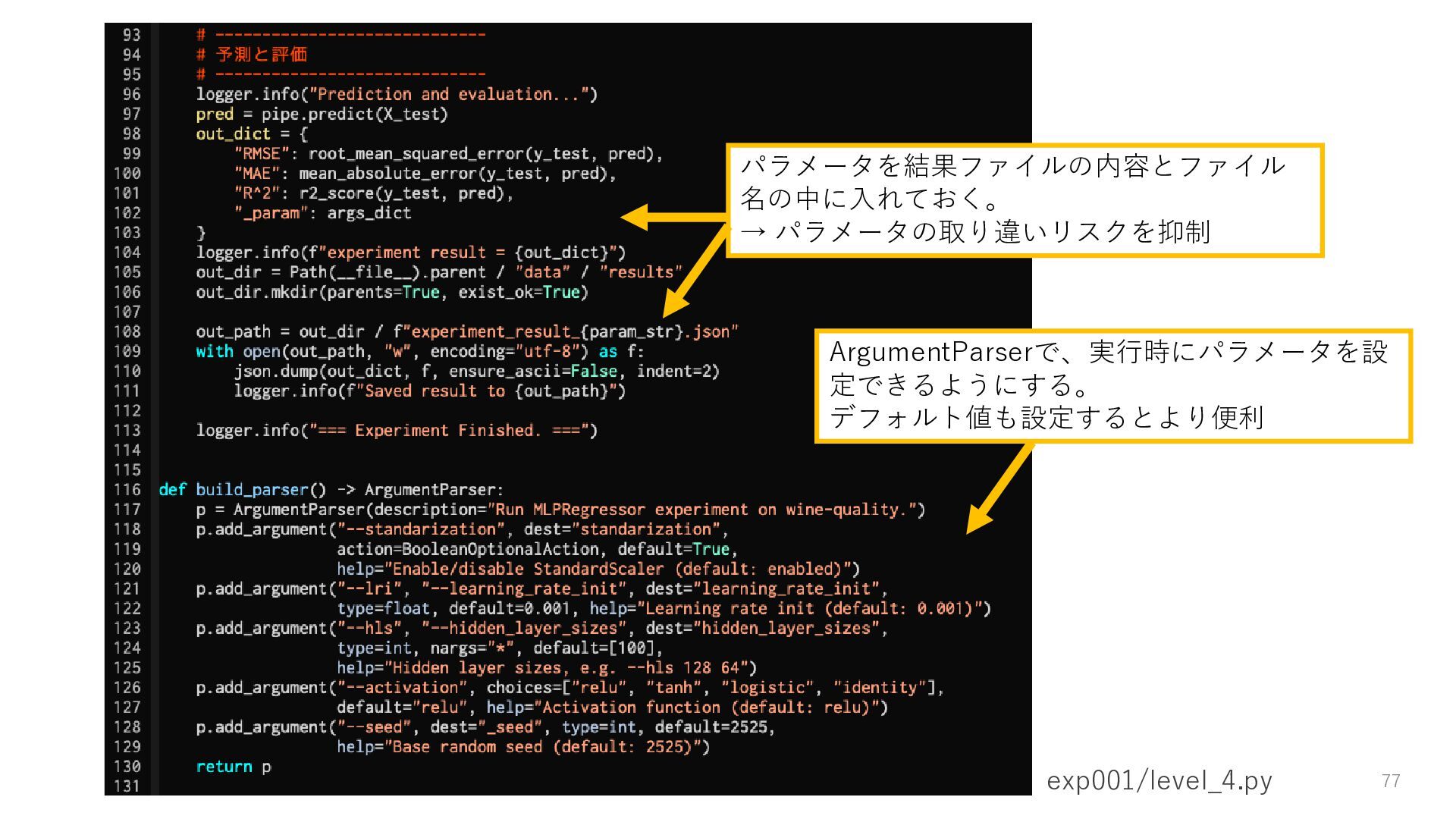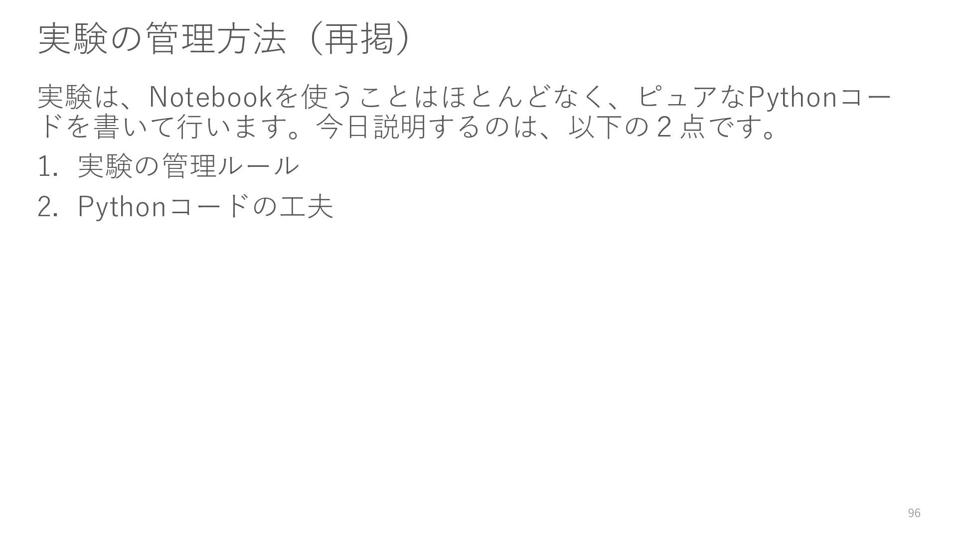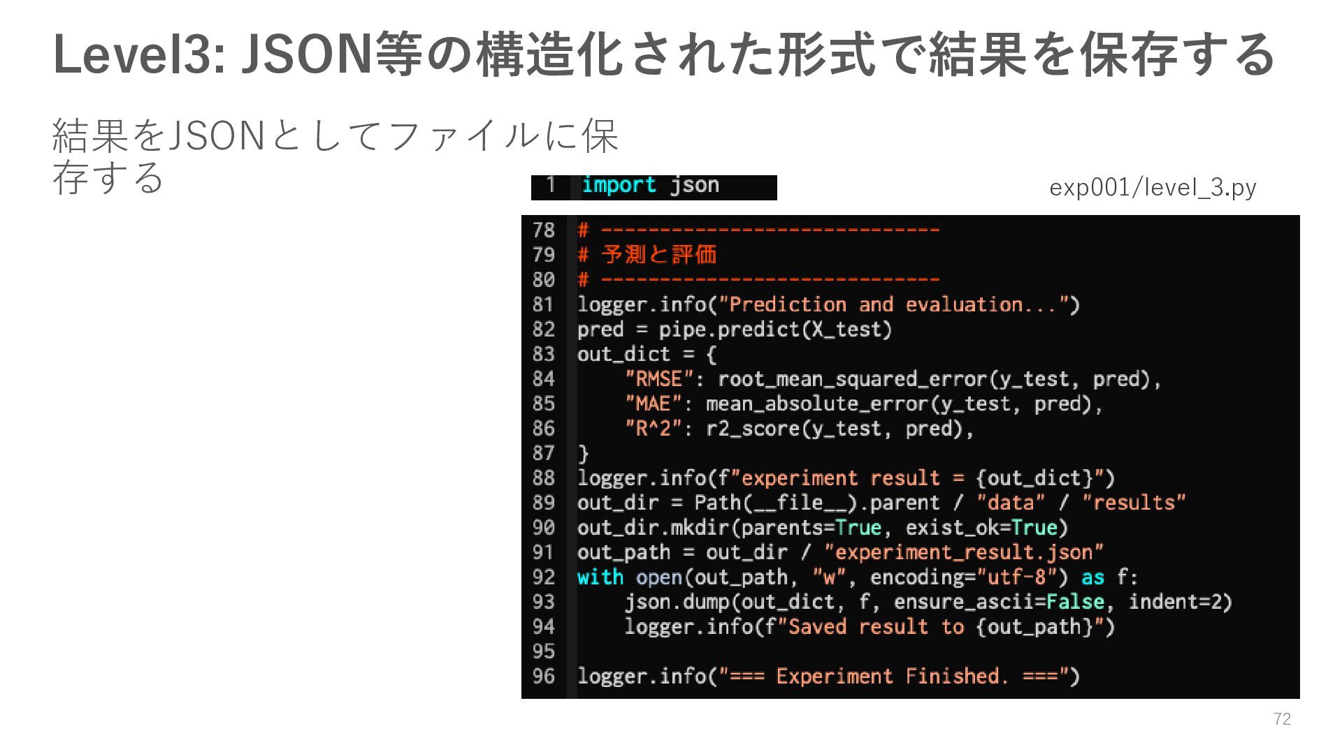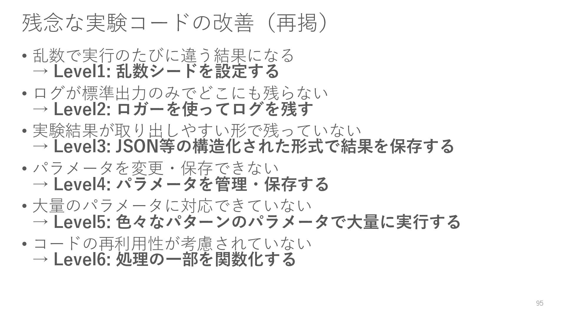 ロガーを使ってログを残す • 実験結果が取り出しやすい形で残っていない → Level3: JSON等の構造化された形式で結果を保存する • パラメータを変更・保存できない → Level4: パラメータを管理・保存する • 大量のパラメータに対応できていない → Level5: 色々なパターンのパラメータで大量に実行する • コードの再利用性が考慮されていない → Level6: 処理の一部を関数化する 95