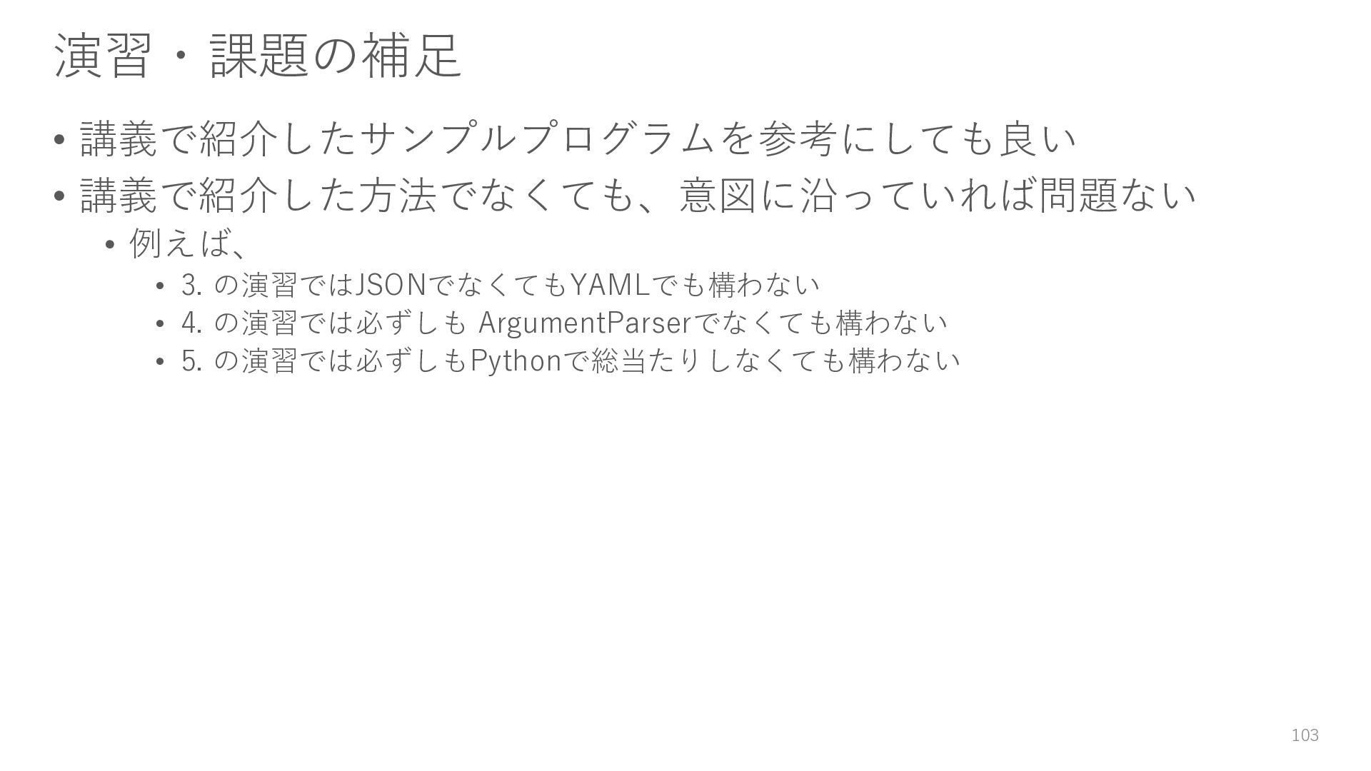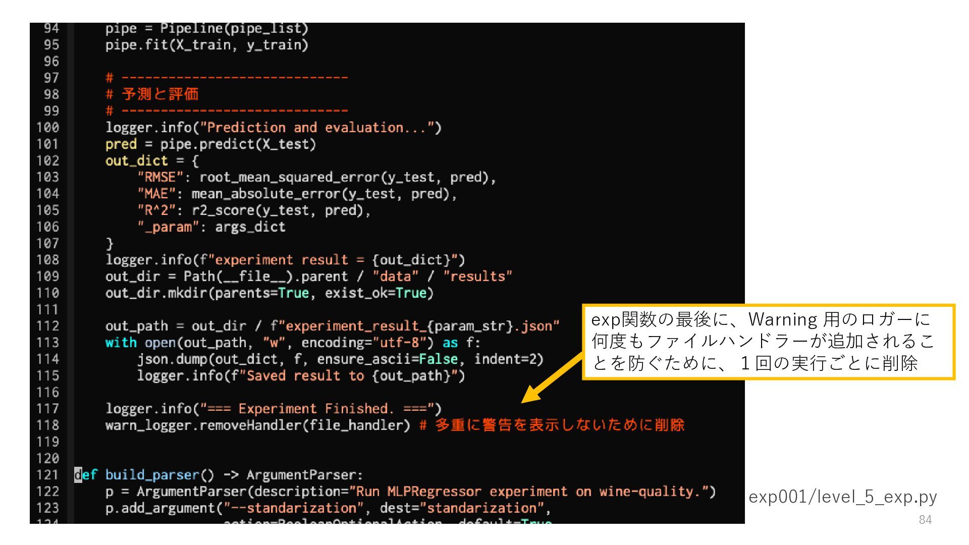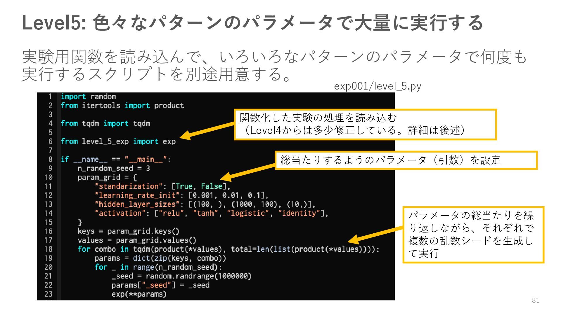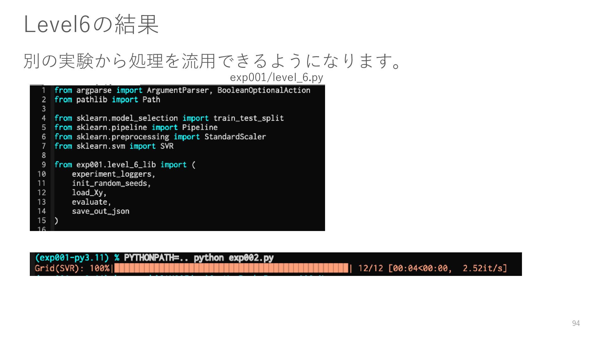 ロガーを使ってログを残す • 実験結果が取り出しやすい形で残っていない → Level3: JSON等の構造化された形式で結果を保存する • パラメータを変更・保存できない → Level4: パラメータを管理・保存する • 大量のパラメータに対応できていない → Level5: 色々なパターンのパラメータで大量に実行する • コードの再利用性が考慮されていない → Level6: 処理の一部を関数化する 95