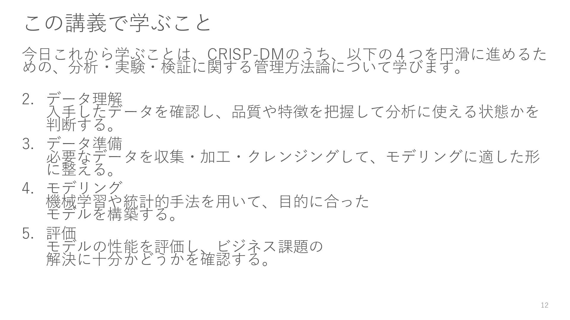 3. CRISP-DMとは (2): 各フェーズの説明 1. ビジネス理解 解決すべき課題や目的を整理し、データ分析のゴールを明確にする。 2. データ理解 入手したデータを確認し、品質や特徴を把握して分析に使える状態かを判 断する。