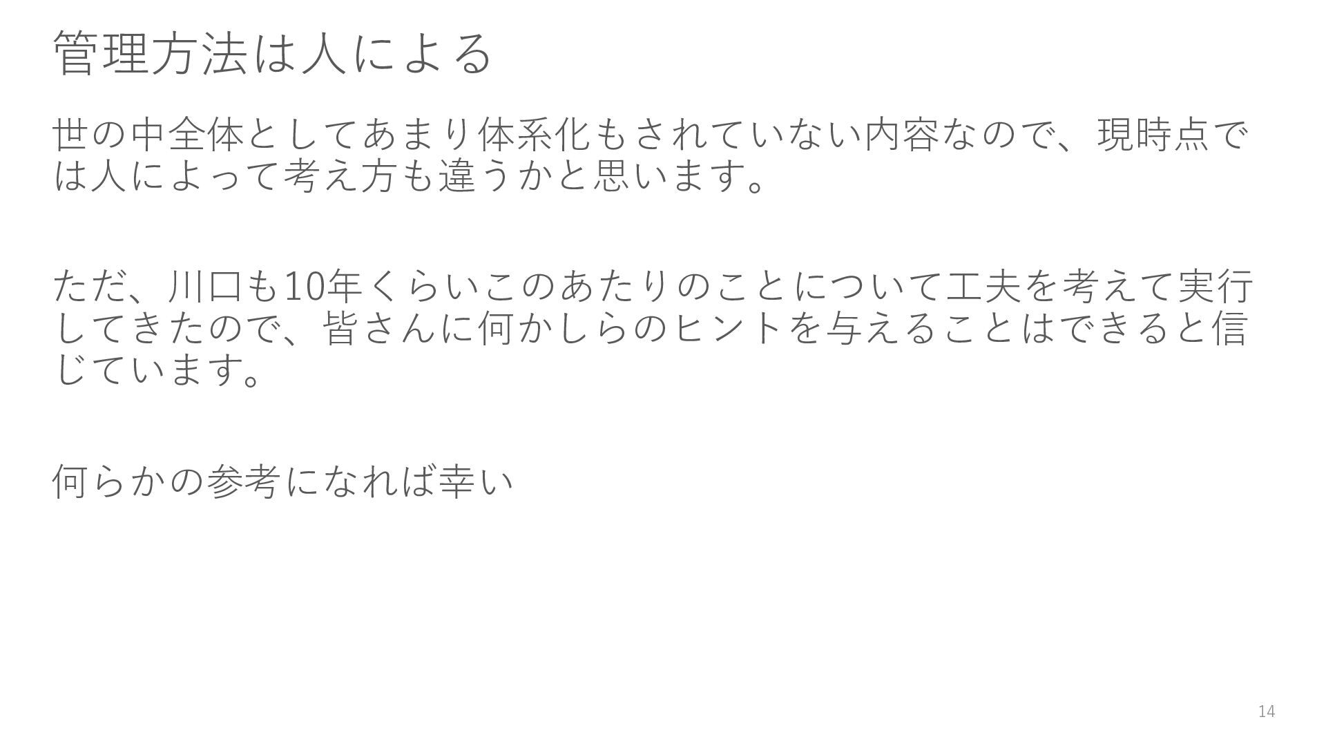13. 実験の管理ルール ー原則ー 手順に加えて、以下の原則を守ります。 • 順序を守る 実験用のコードを実行したときは、再実行の前に実験結果のファイル をすべて破棄しましょう。違う処理を得た実験結果のファイルを混ぜ ないためです。 • 完了した実験のコード・データは修正しない