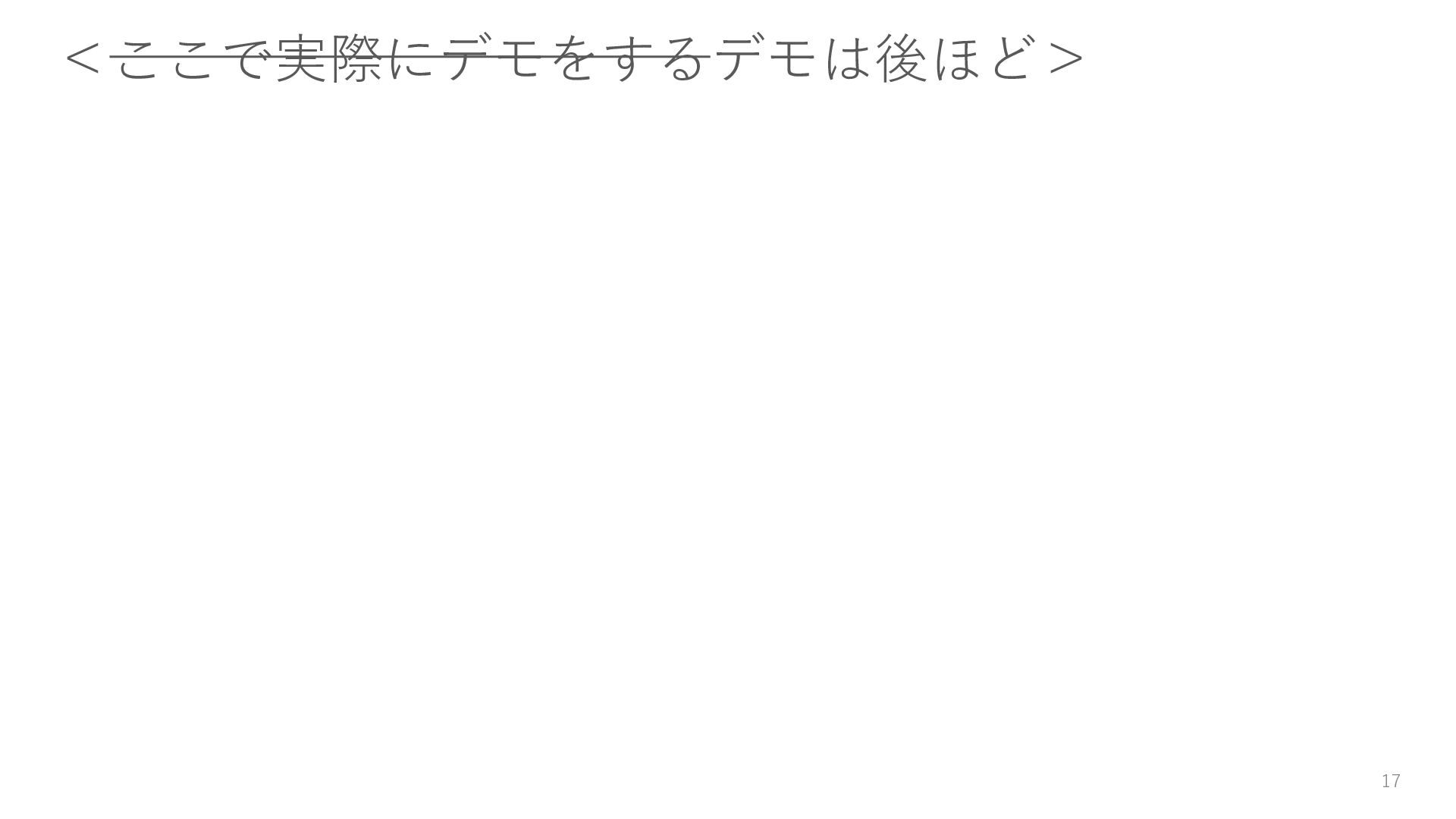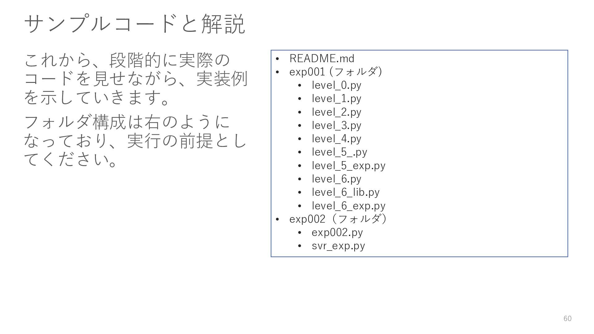 16. サンプルコードと解説 これから、段階的に実際の コードを見せながら、実装例 を示していきます。 フォルダ構成は右のように なっており、実行の前提とし てください。 60 • README.md