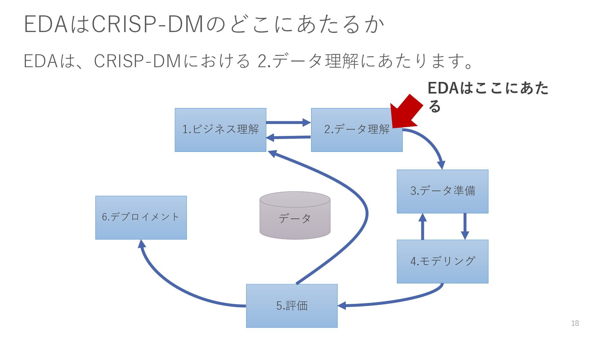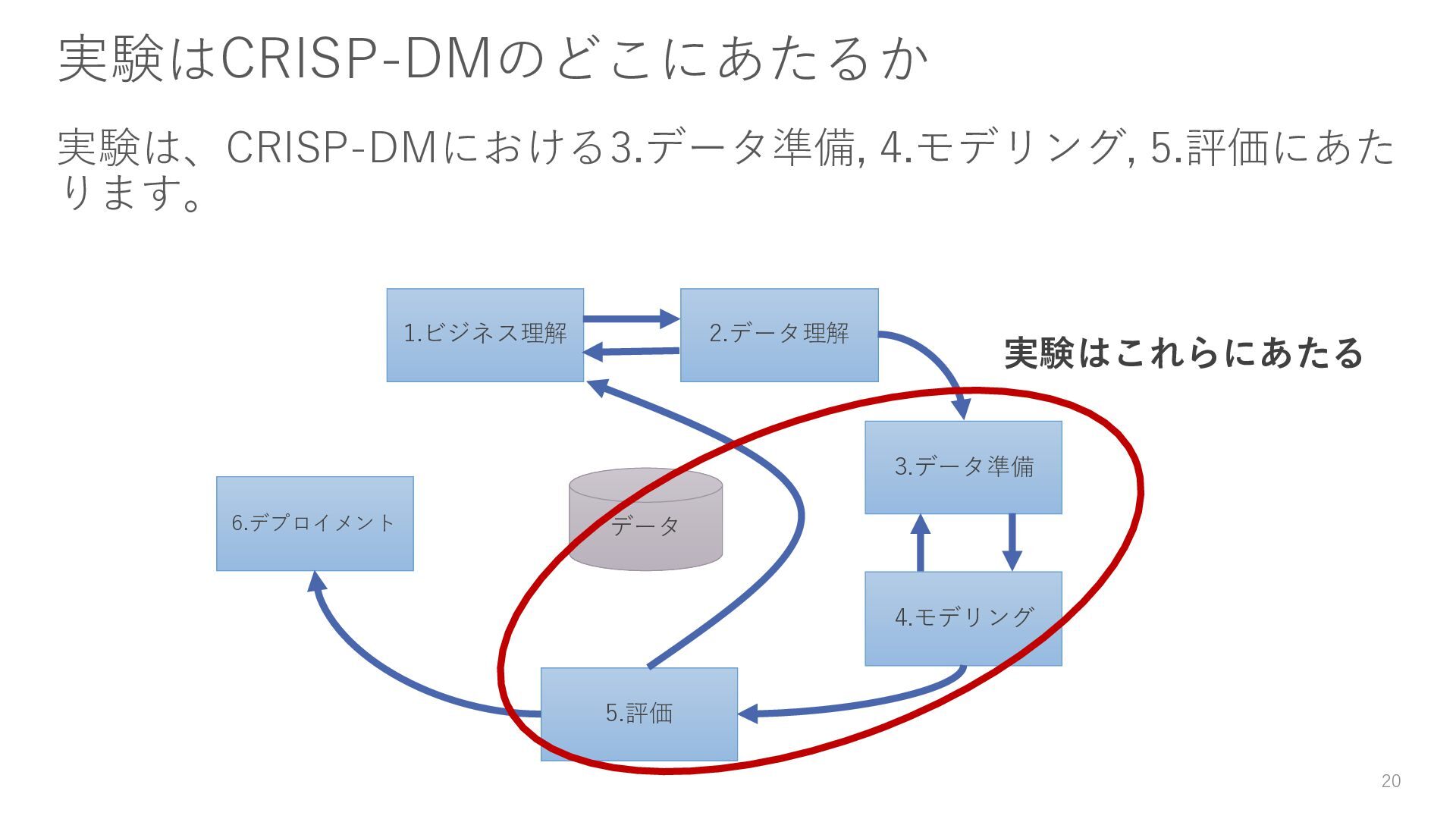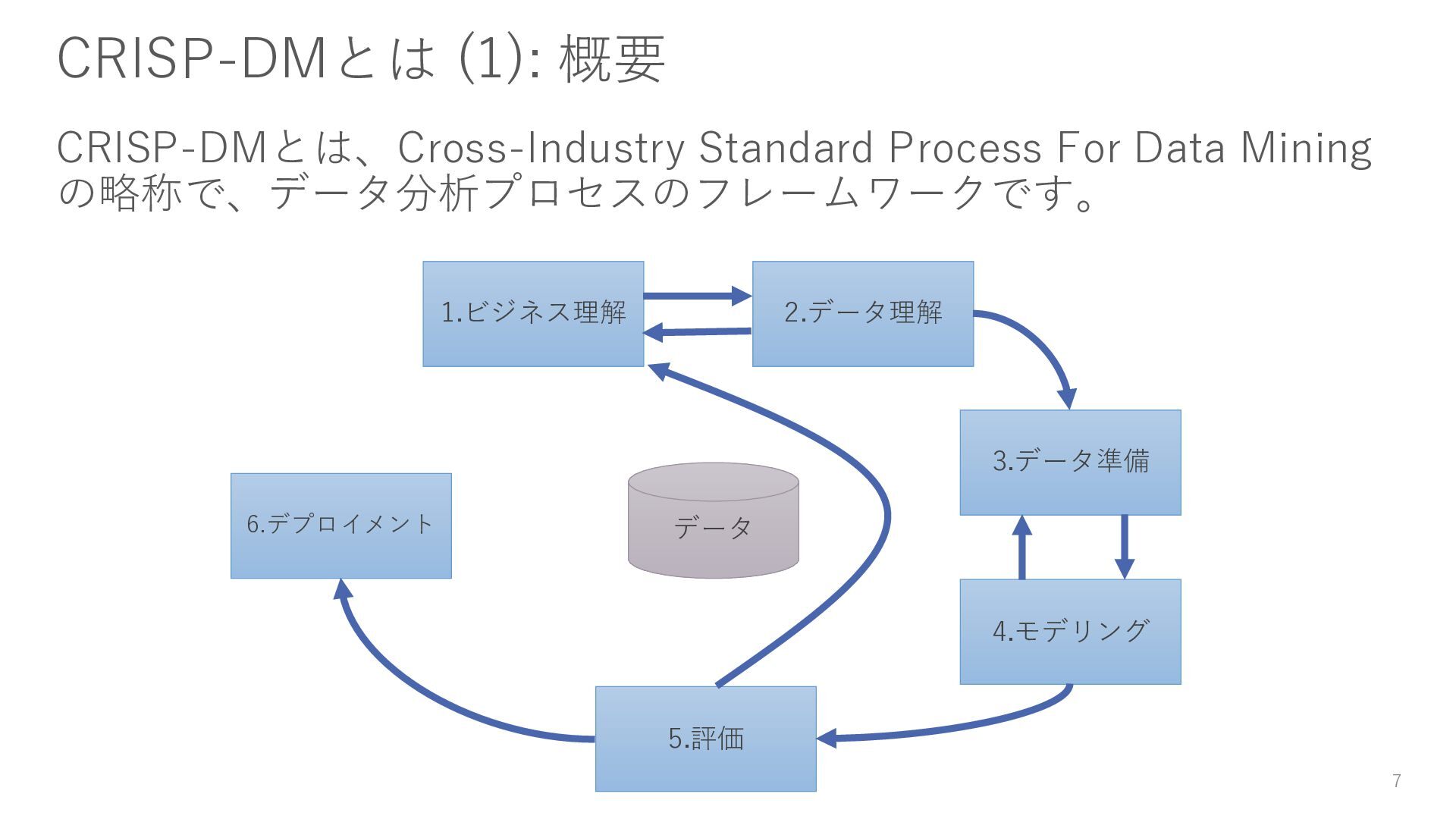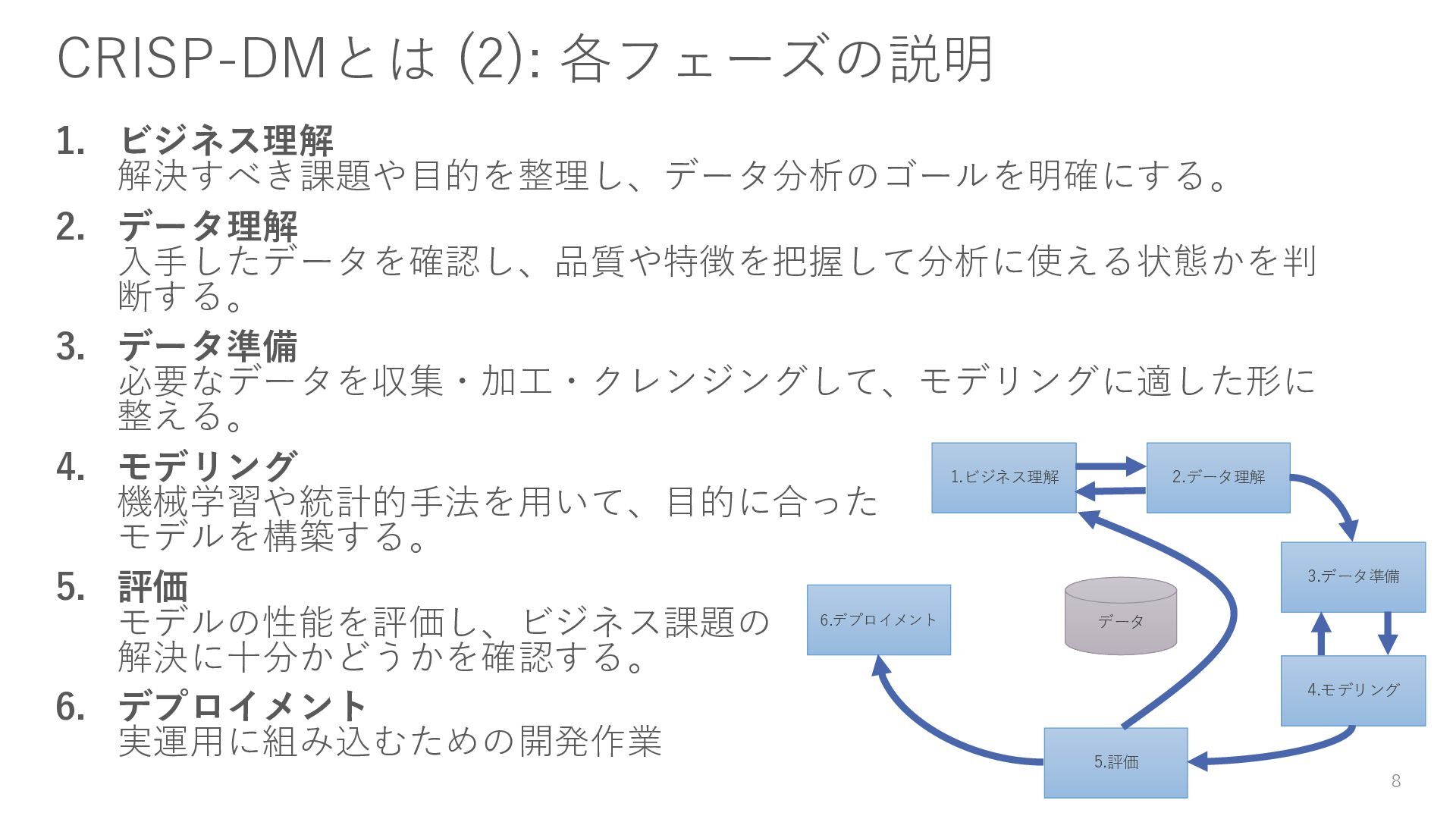 7 1.ビジネス理解 2.データ理解 3.データ準備 4.モデリング 5.評価 6.デプロイメント データ