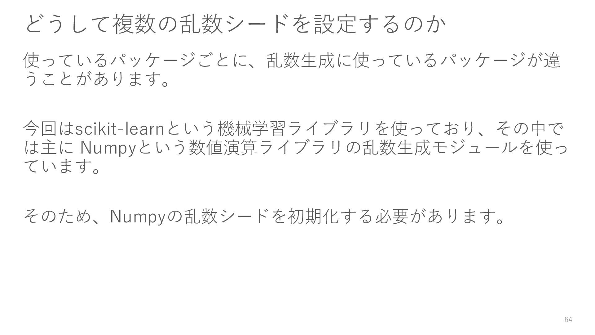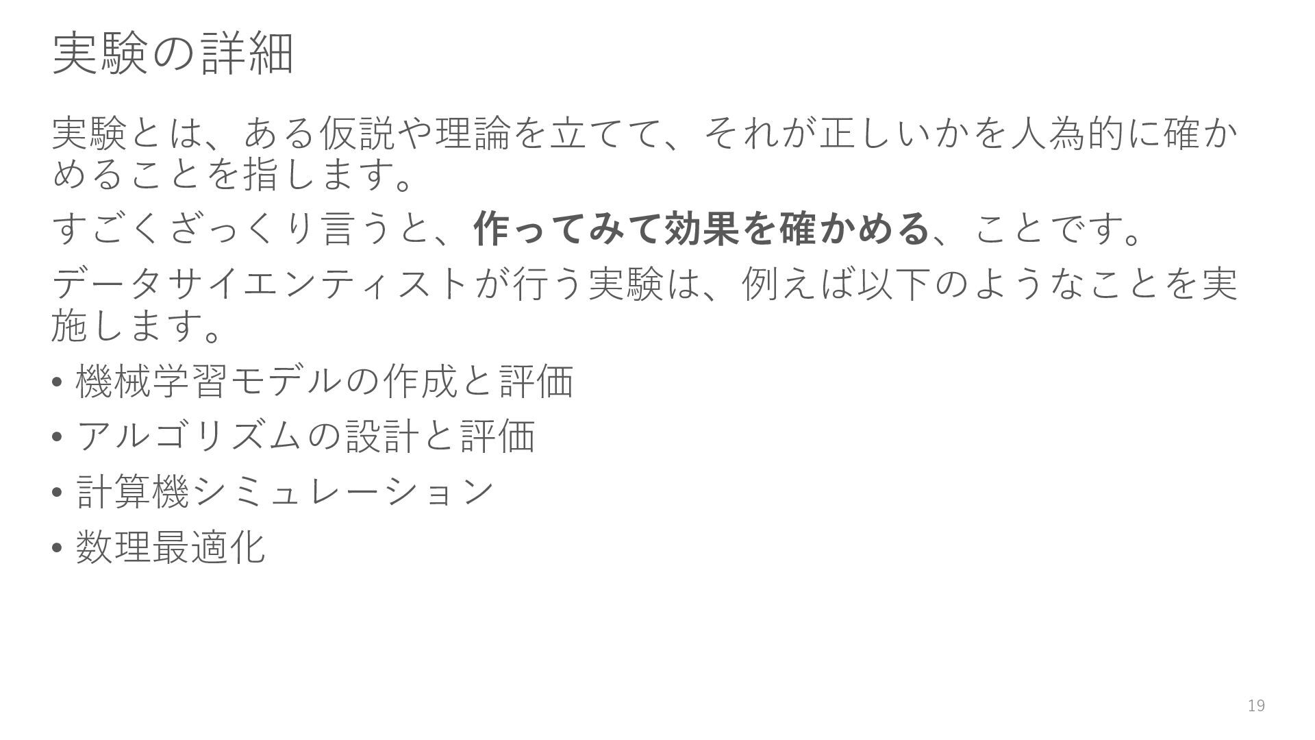 18. 残念な実験コードの改善(再掲) • 乱数で実行のたびに違う結果になる → Level1: 乱数シードを設定する • ログが標準出力のみでどこにも残らない → Level2: