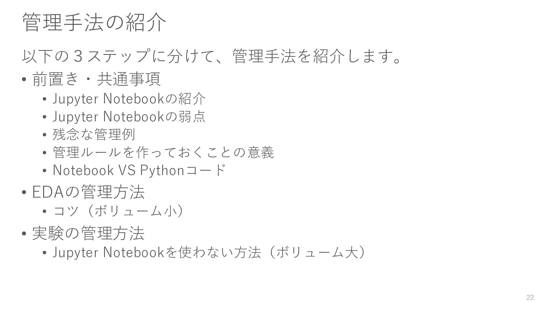 • 残念な管理例 • 管理ルールを作っておくことの意義 • Notebook VS Pythonコード • EDAの管理方法 • コツ(ボリューム小) • 実験の管理方法 • Jupyter Notebookを使わない方法(ボリューム大) 22