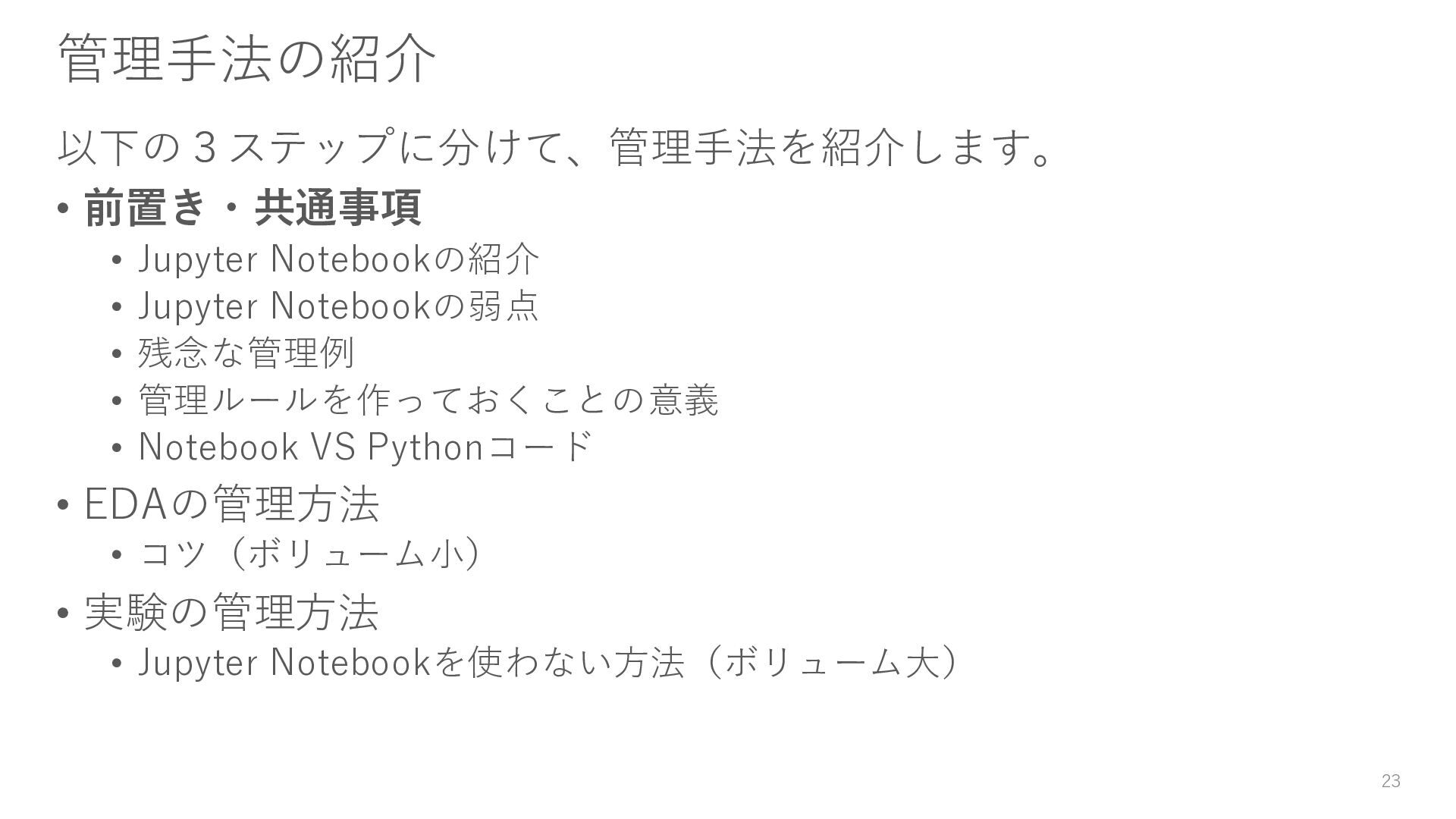 • 残念な管理例 • 管理ルールを作っておくことの意義 • Notebook VS Pythonコード • EDAの管理方法 • コツ(ボリューム小) • 実験の管理方法 • Jupyter Notebookを使わない方法(ボリューム大) 23