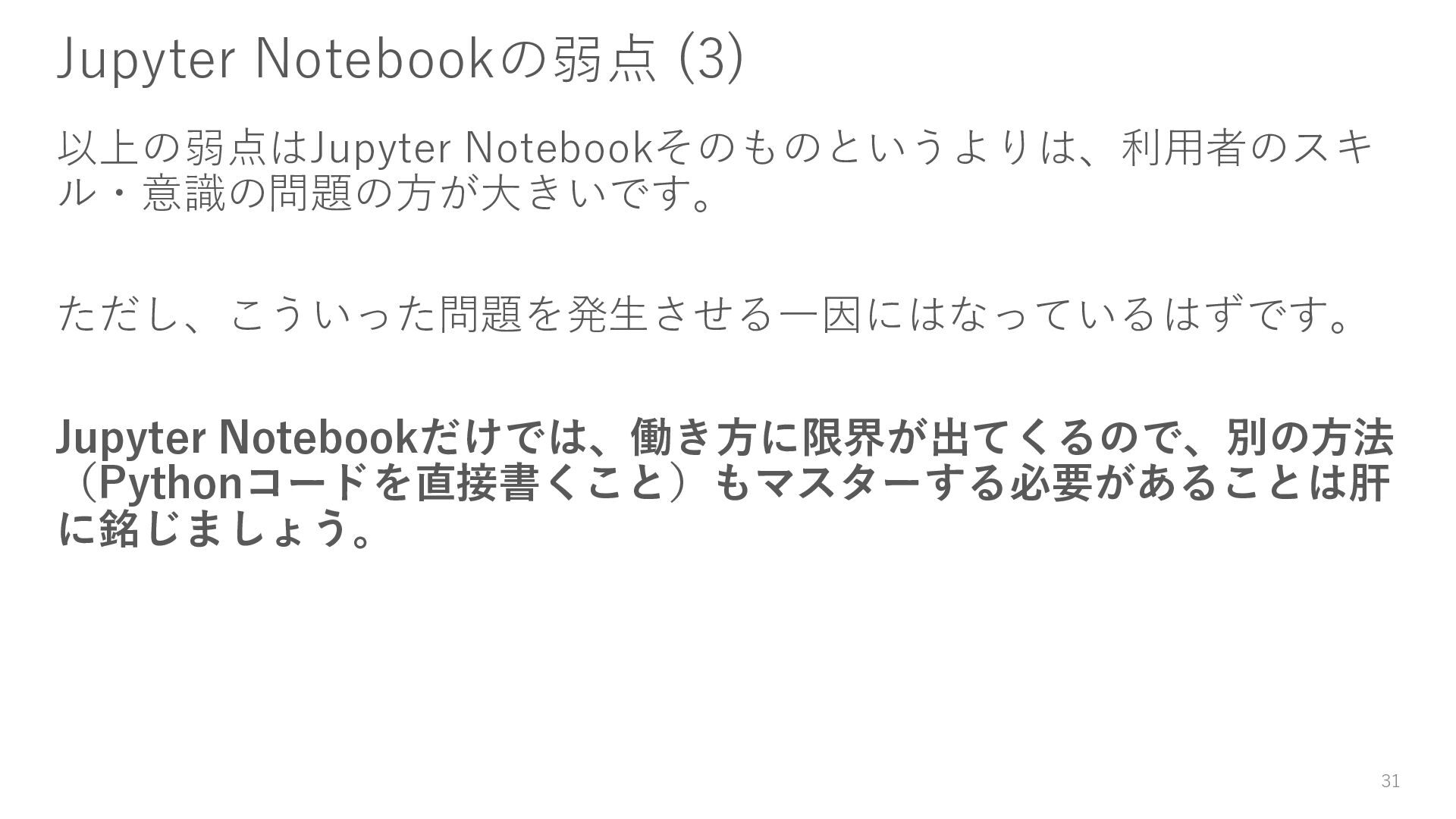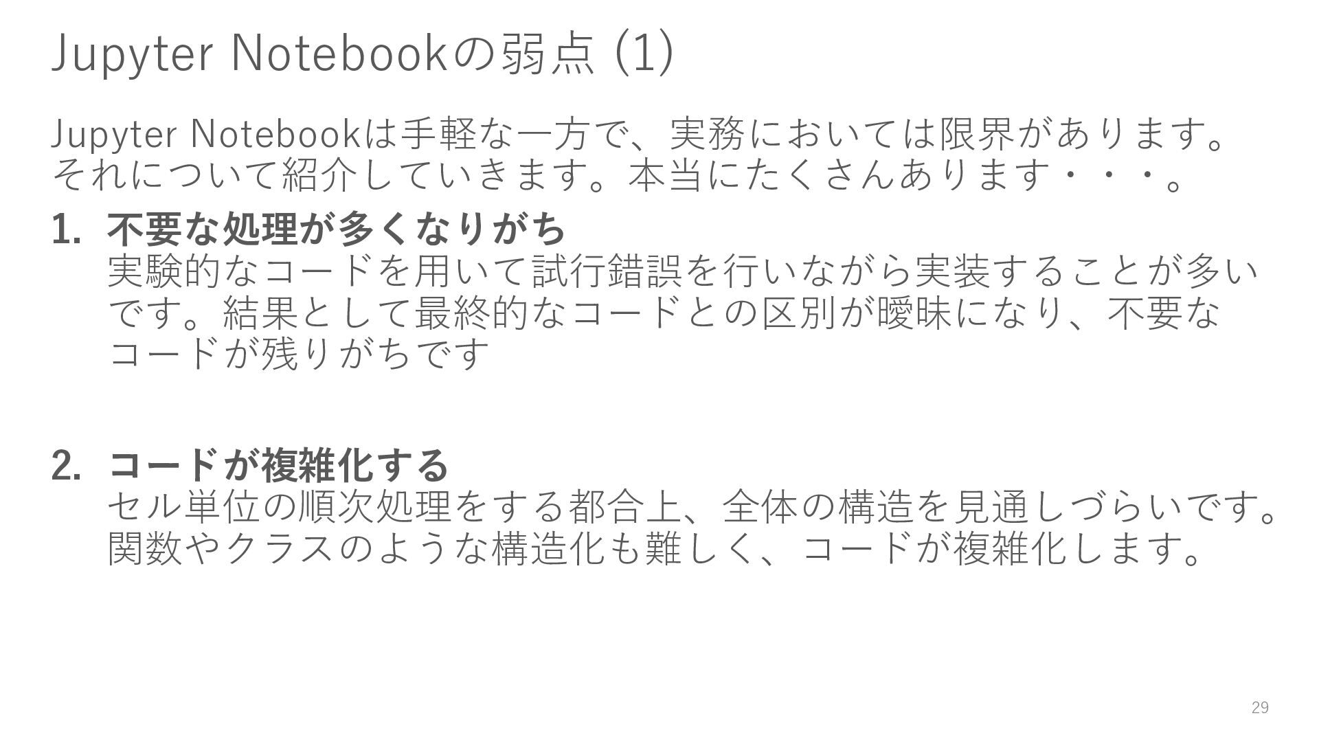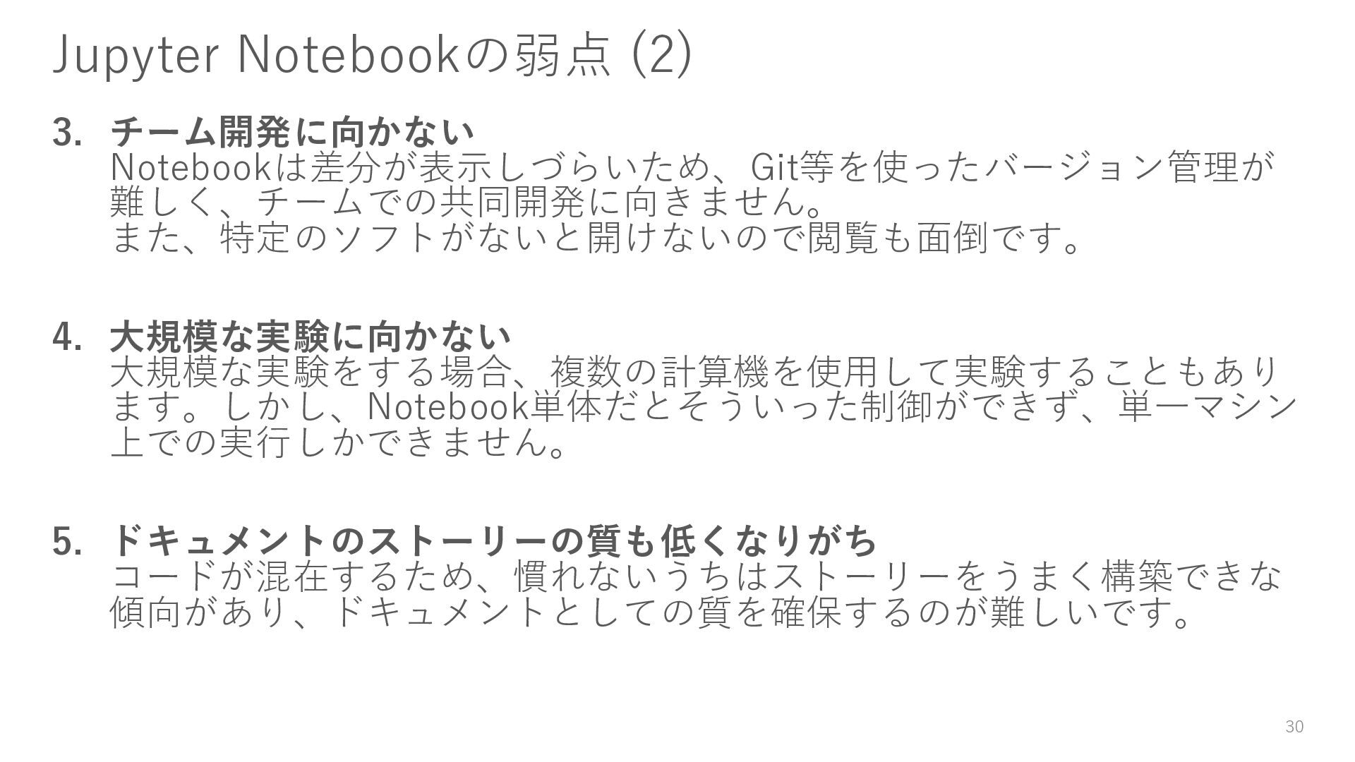 大規模な実験をする場合、複数の計算機を使用して実験することもあり ます。しかし、Notebook単体だとそういった制御ができず、単一マシン 上での実行しかできません。 5. ドキュメントのストーリーの質も低くなりがち コードが混在するため、慣れないうちはストーリーをうまく構築できな 傾向があり、ドキュメントとしての質を確保するのが難しいです。 30