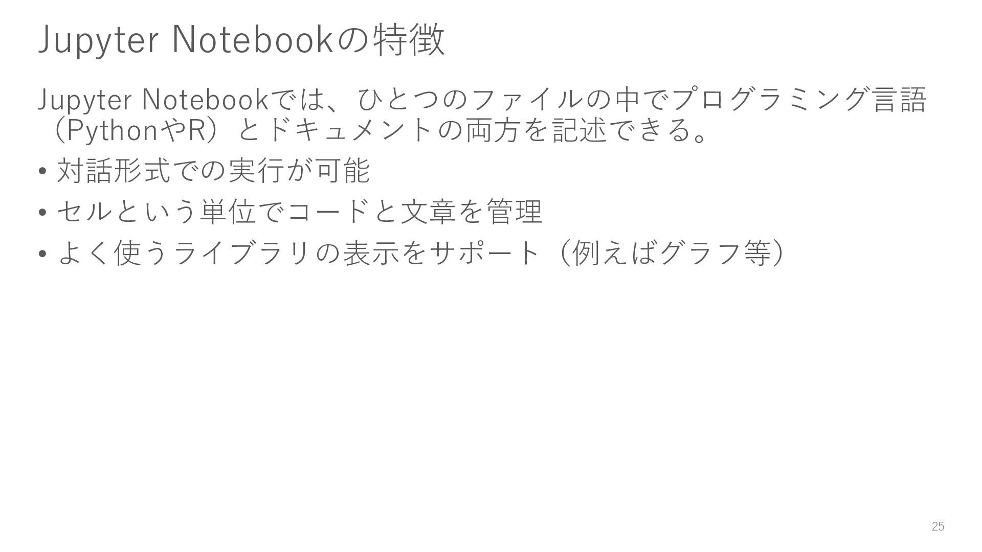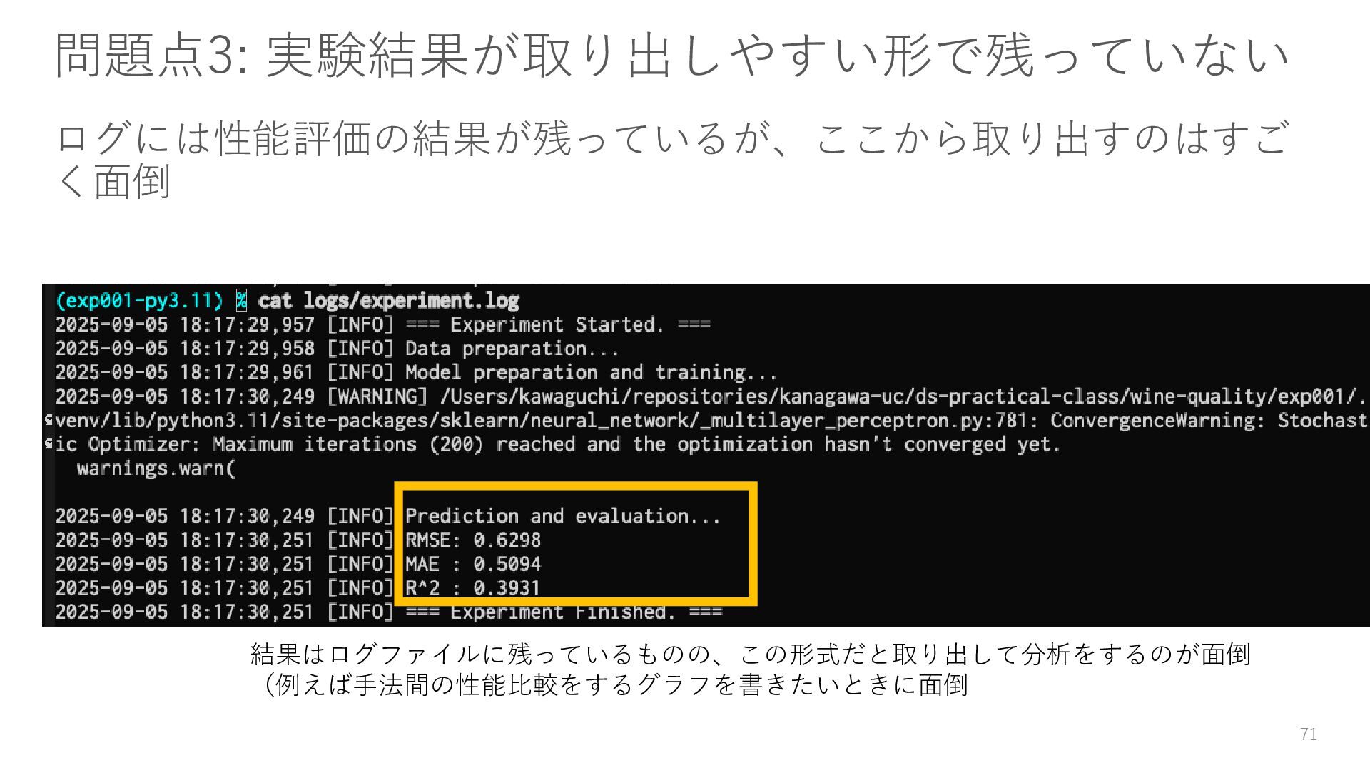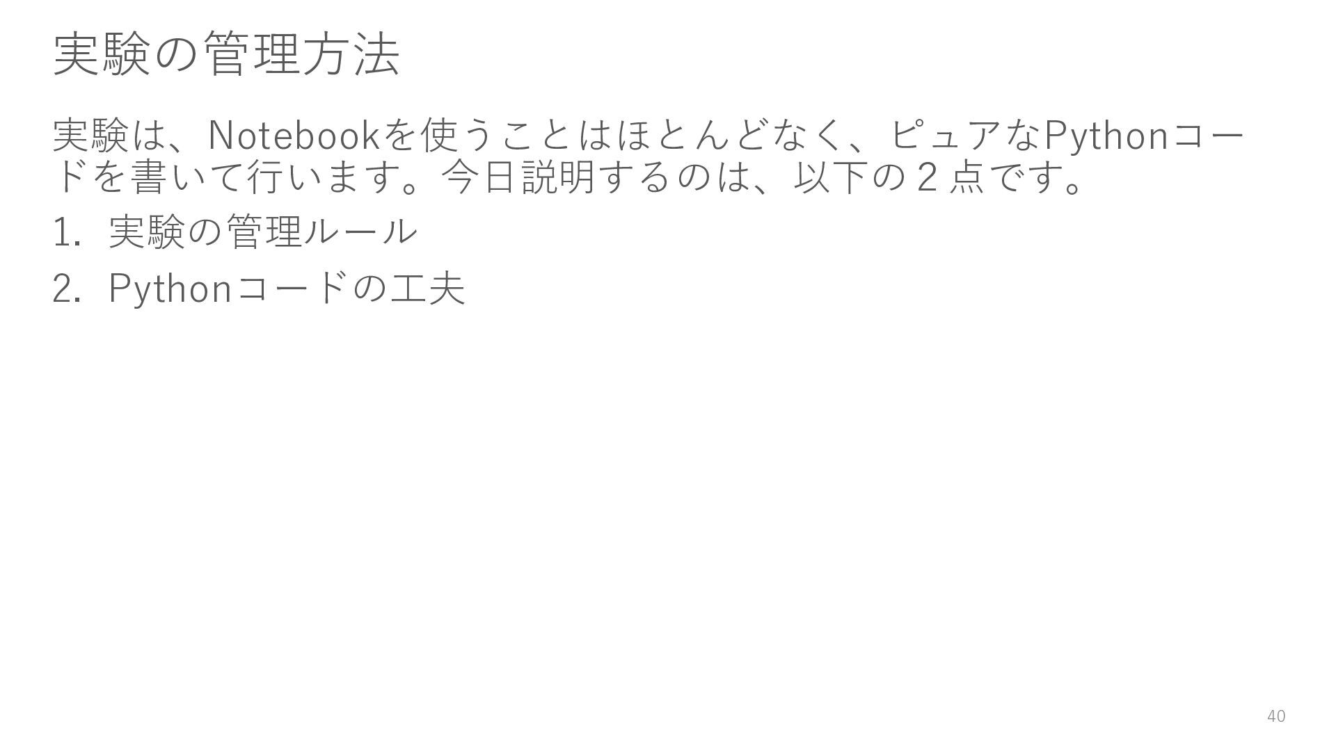 大規模な実験をする場合、複数の計算機を使用して実験することもあり ます。しかし、Notebook単体だとそういった制御ができず、単一マシン 上での実行しかできません。 5. ドキュメントのストーリーの質も低くなりがち コードが混在するため、慣れないうちはストーリーをうまく構築できな 傾向があり、ドキュメントとしての質を確保するのが難しいです。 30