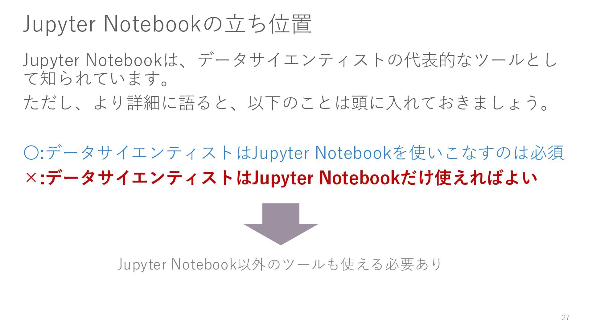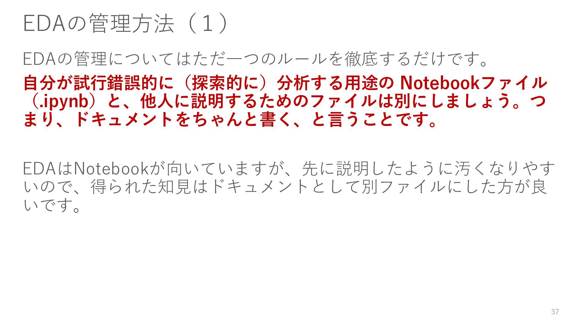 ン管理が難しい 変更点の追跡が容易で、Gitなどのバージョ ン管理システムで管理がしやすい 構造化 関数やクラスをNotebook内に定義することが 多く、コード全体の見通しが悪くなる事が多 い 関数やクラスとして外部ファイルに分割で きるため、コード全体の構造化や再利用が 可能 試行錯誤 インタラクティブな開発が可能で、試行錯誤 を繰り返しやすい スクリプト全体を実行する必要があり、試 行錯誤が難しい(デバッグツールを活用す ることで緩和できる) 適した段階 試行錯誤を繰り返す必要がある初期段階の作 業に適している チームでの開発や継続的なメンテナンスが 求められる最終アウトプットに適している 適した用途 データ探索、データ可視化 データ前処理、機械学習モデルの開発、プ ロトタイプ開発 Notebook VS Pythonコード 36 ※ 書籍『先輩データサイエンティストからの指南書―実務で生き抜くためのエンジニアリングスキル』に記載されている表をかなり参考にしています。
