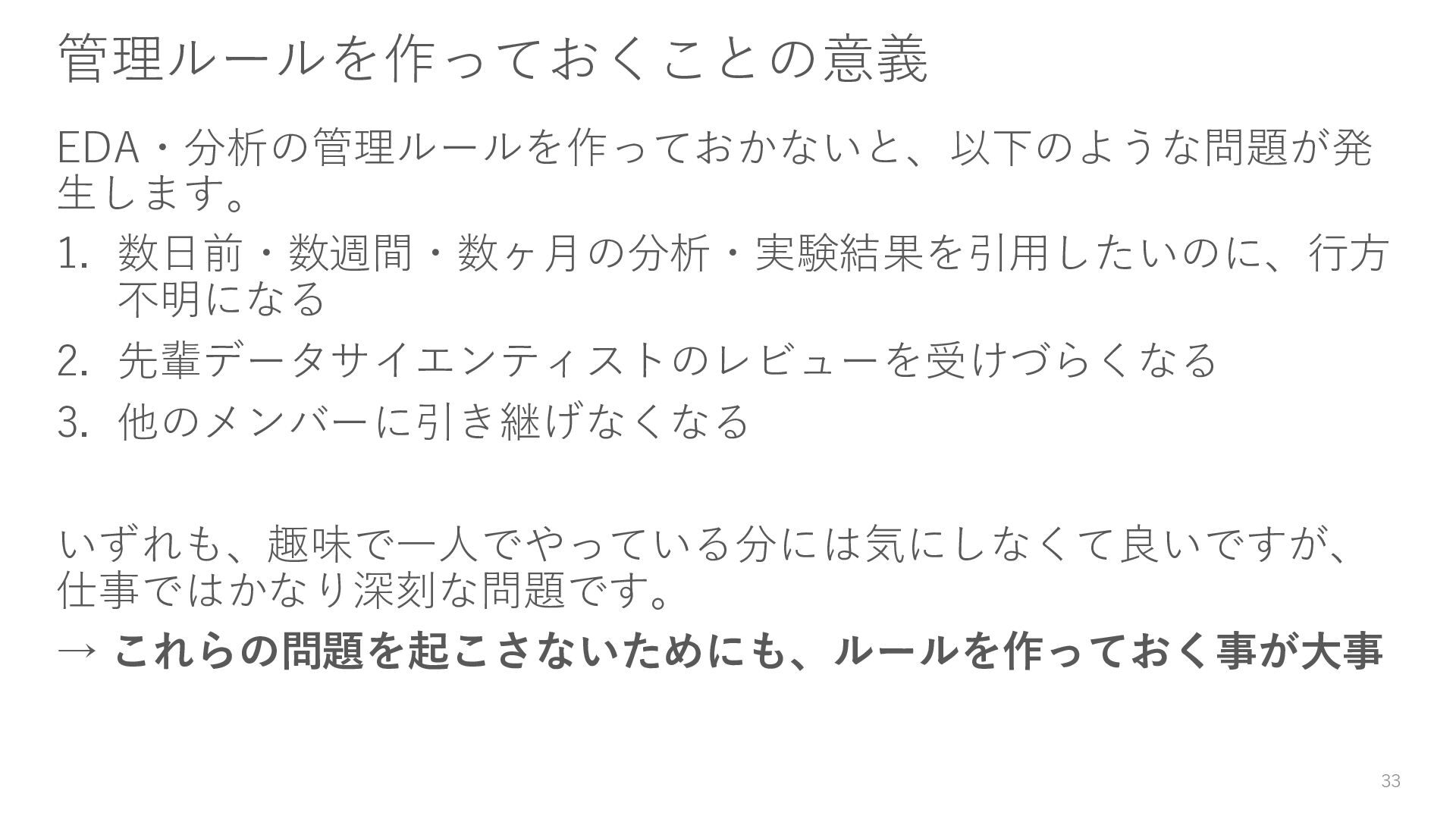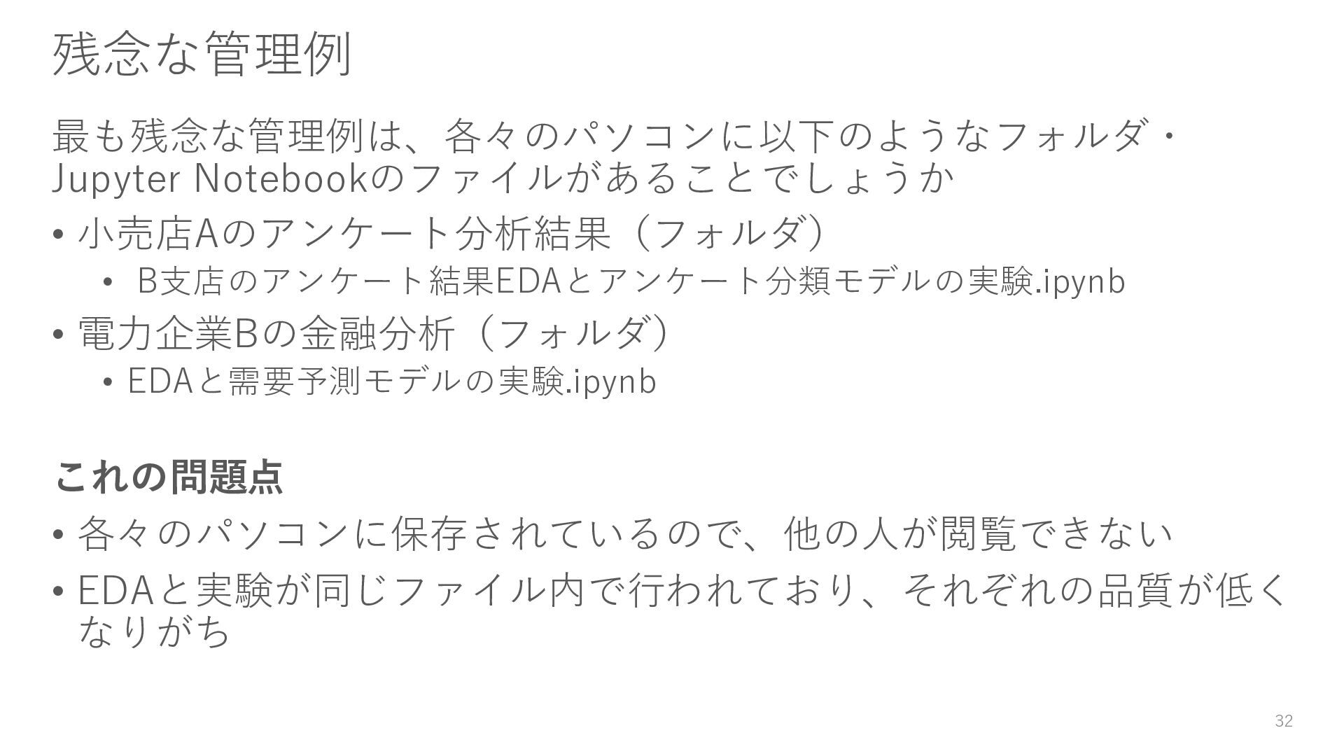 • EDAと需要予測モデルの実験.ipynb これの問題点 • 各々のパソコンに保存されているので、他の人が閲覧できない • EDAと実験が同じファイル内で行われており、それぞれの品質が低く なりがち 32