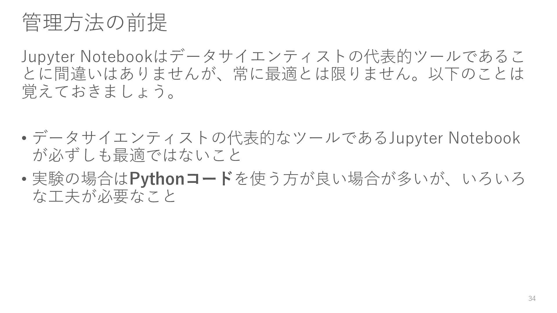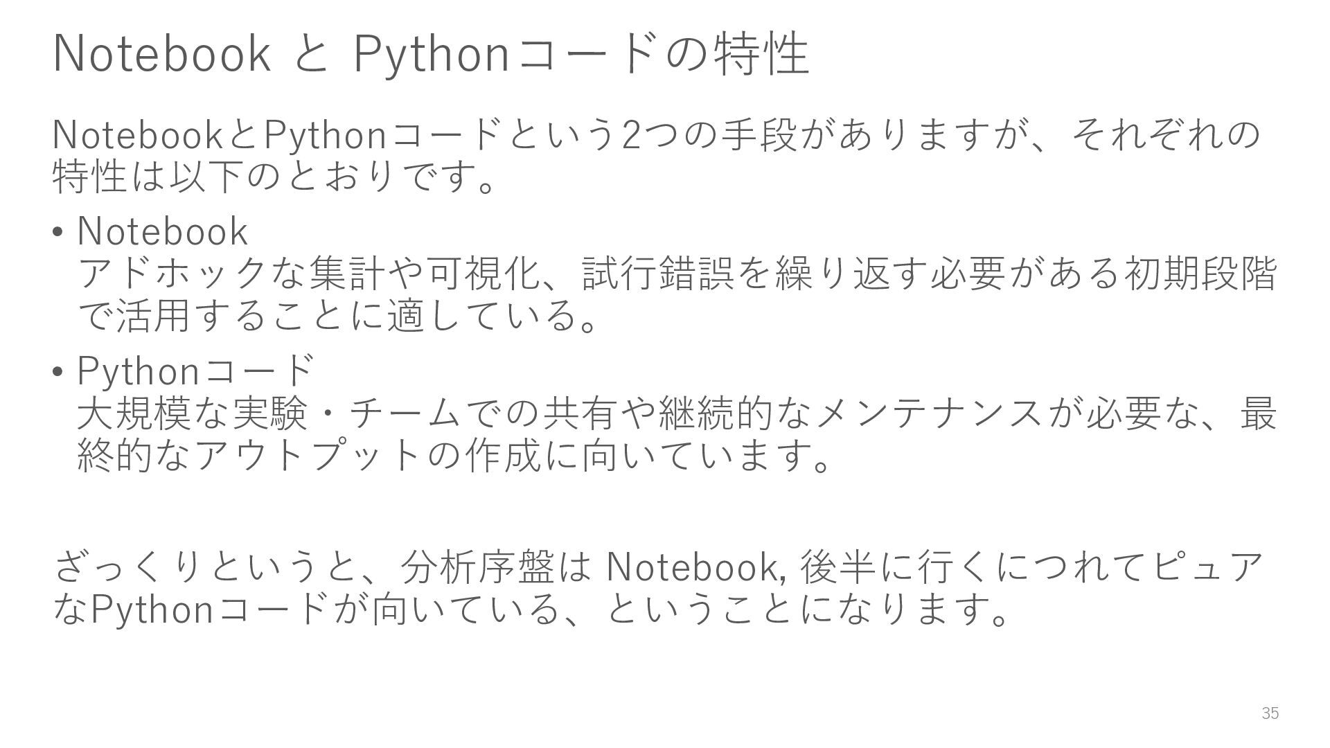 Pythonコード 大規模な実験・チームでの共有や継続的なメンテナンスが必要な、最 終的なアウトプットの作成に向いています。 ざっくりというと、分析序盤は Notebook, 後半に行くにつれてピュア なPythonコードが向いている、ということになります。 35