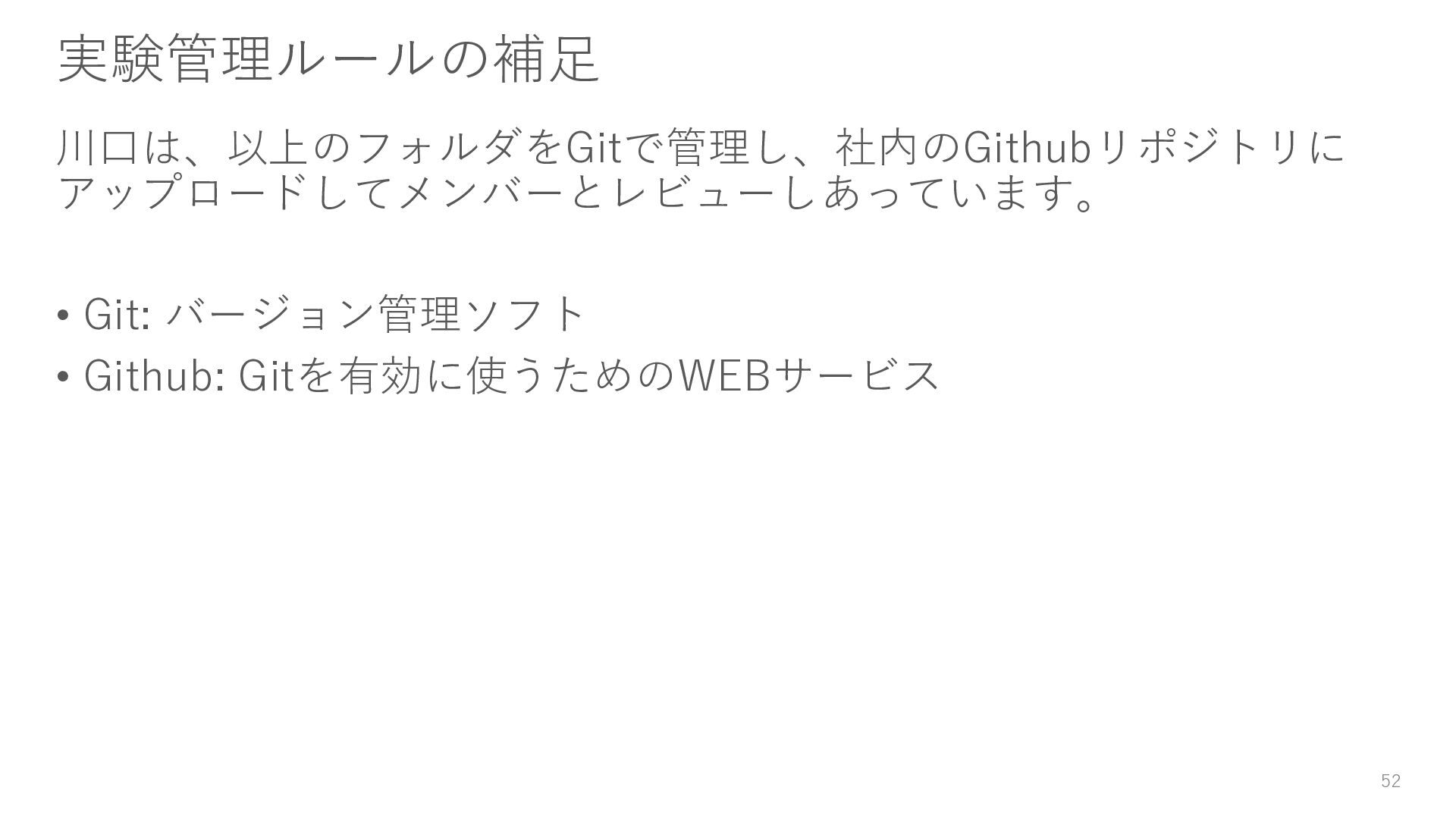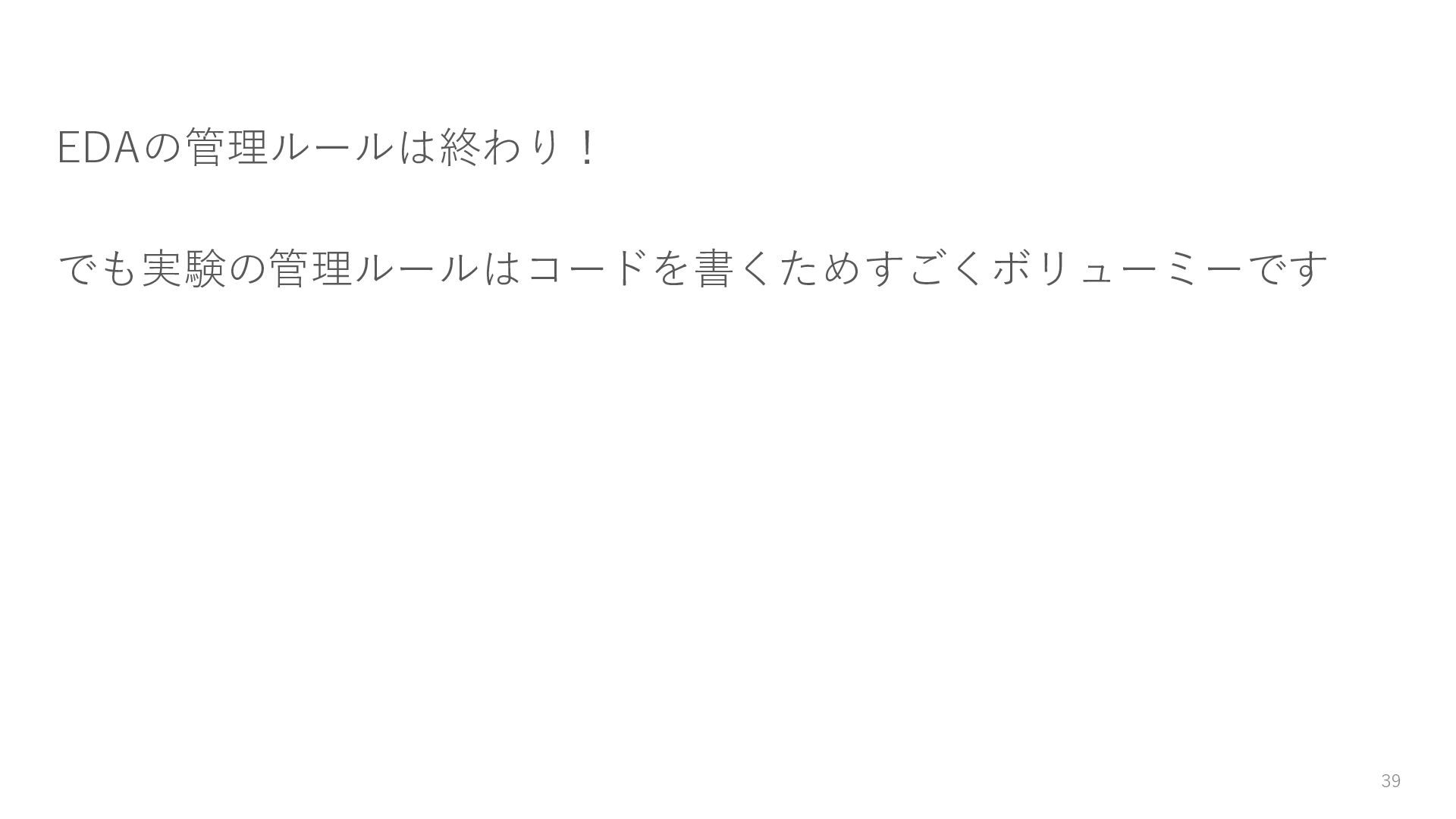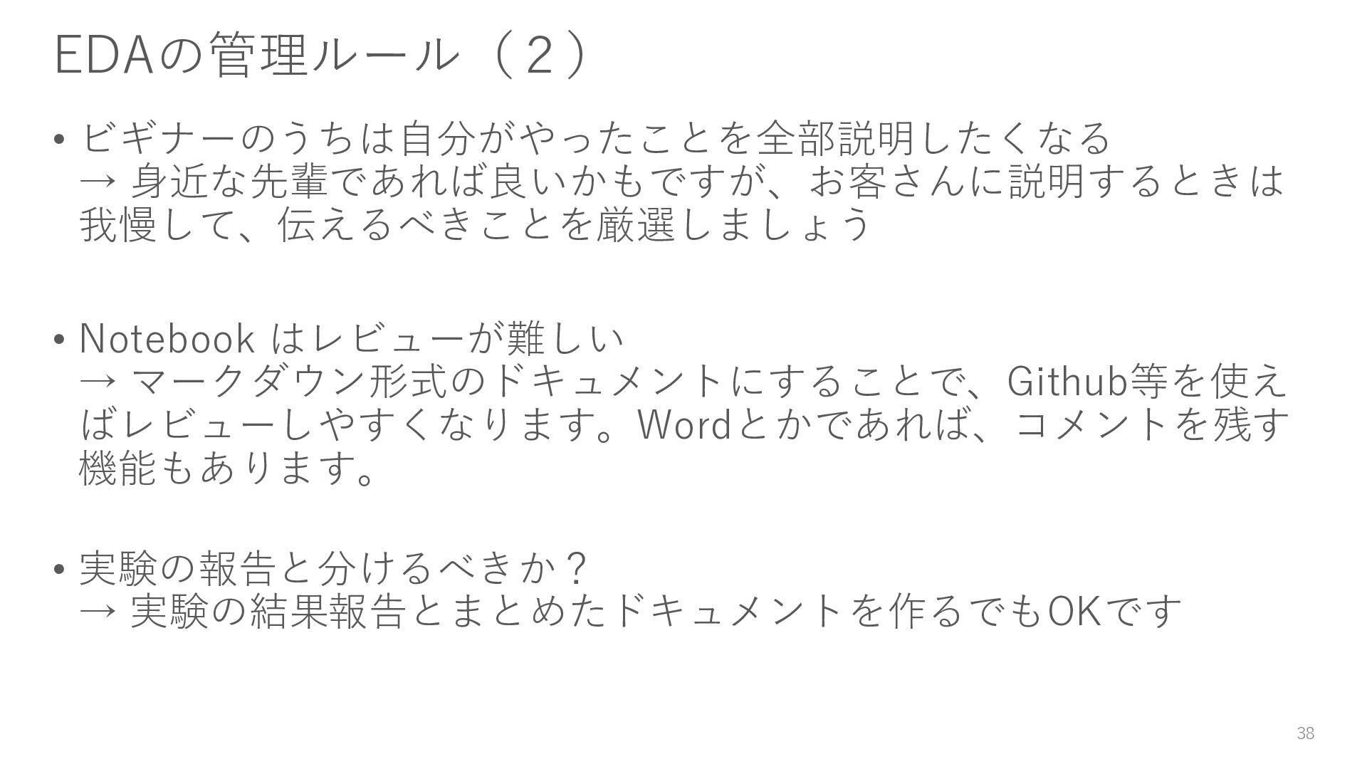 マークダウン形式のドキュメントにすることで、Github等を使え ばレビューしやすくなります。Wordとかであれば、コメントを残す 機能もあります。 • 実験の報告と分けるべきか? → 実験の結果報告とまとめたドキュメントを作るでもOKです 38
