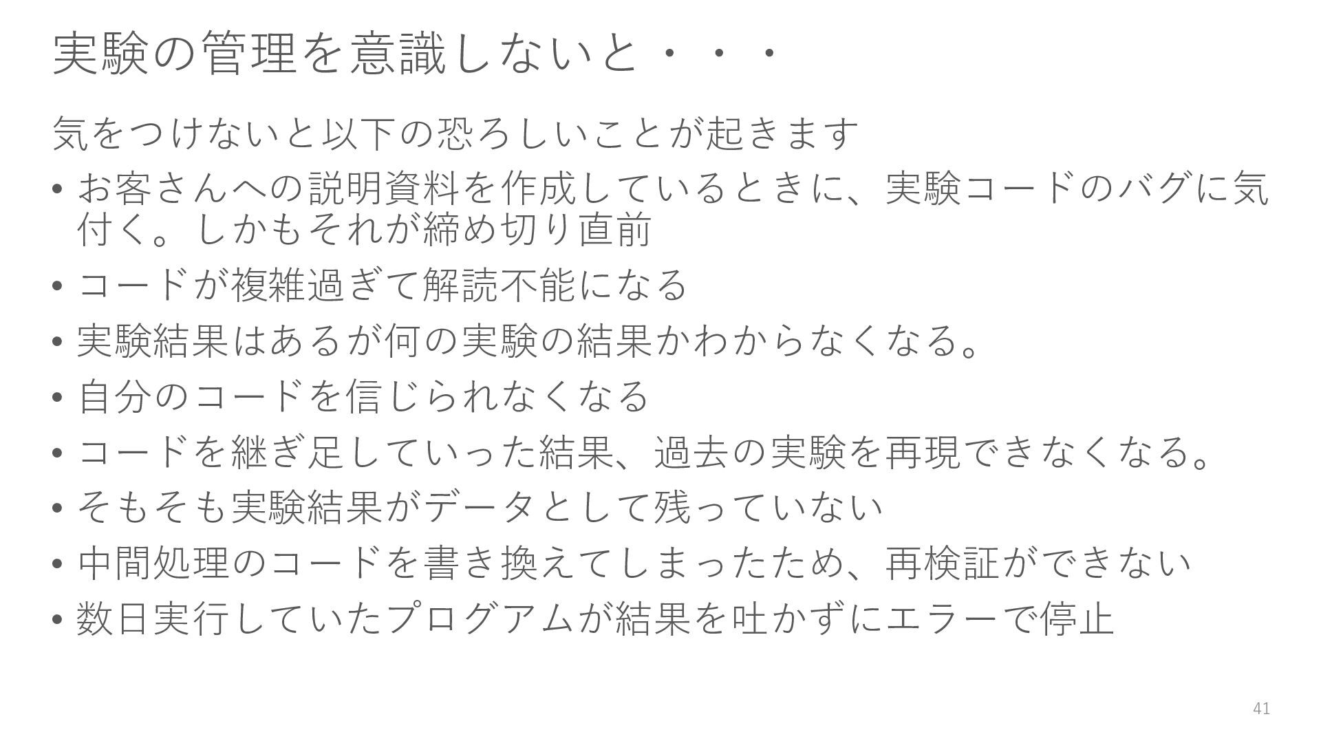 自分のコードを信じられなくなる • コードを継ぎ足していった結果、過去の実験を再現できなくなる。 • そもそも実験結果がデータとして残っていない • 中間処理のコードを書き換えてしまったため、再検証ができない • 数日実行していたプログアムが結果を吐かずにエラーで停止 41