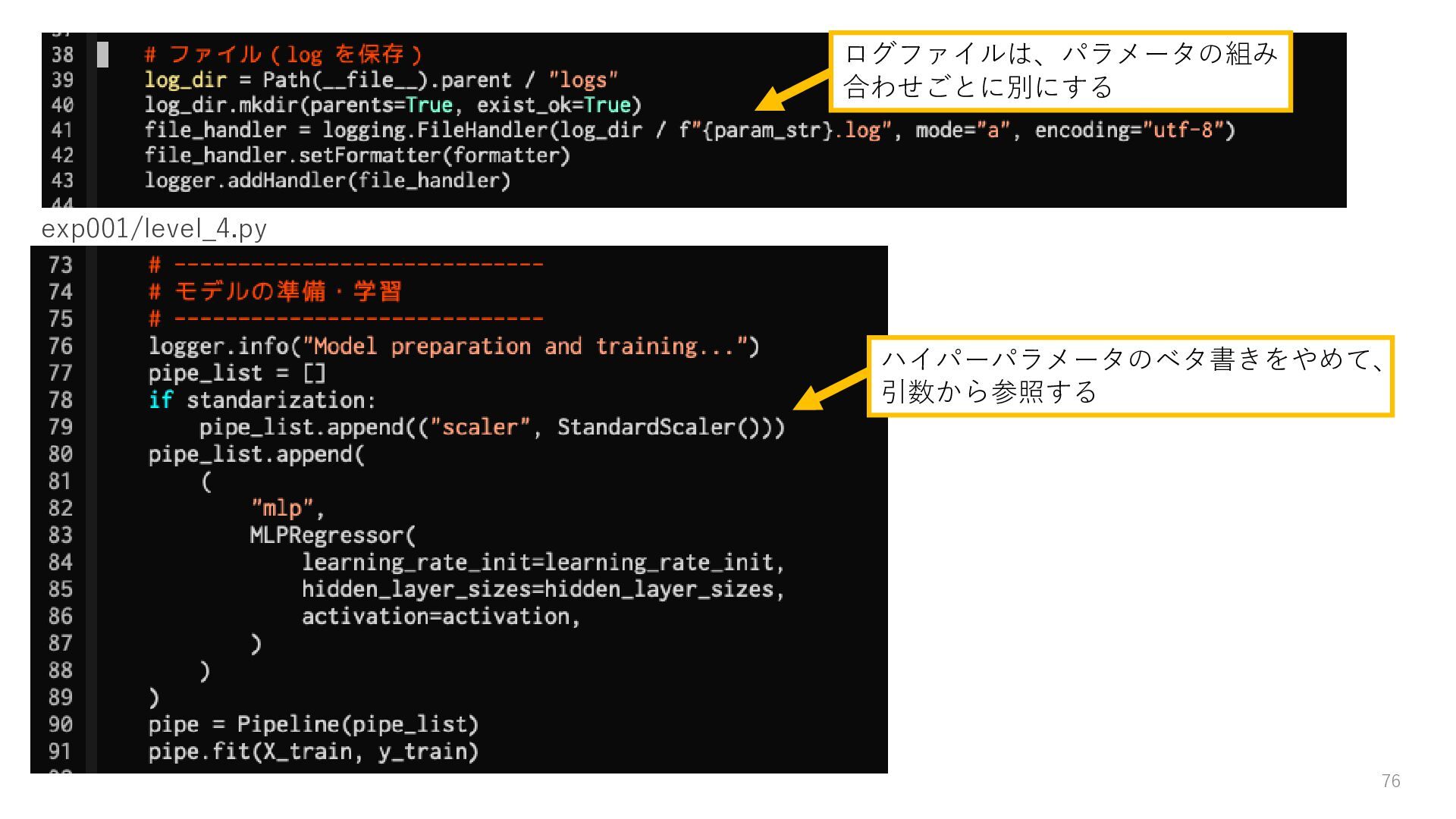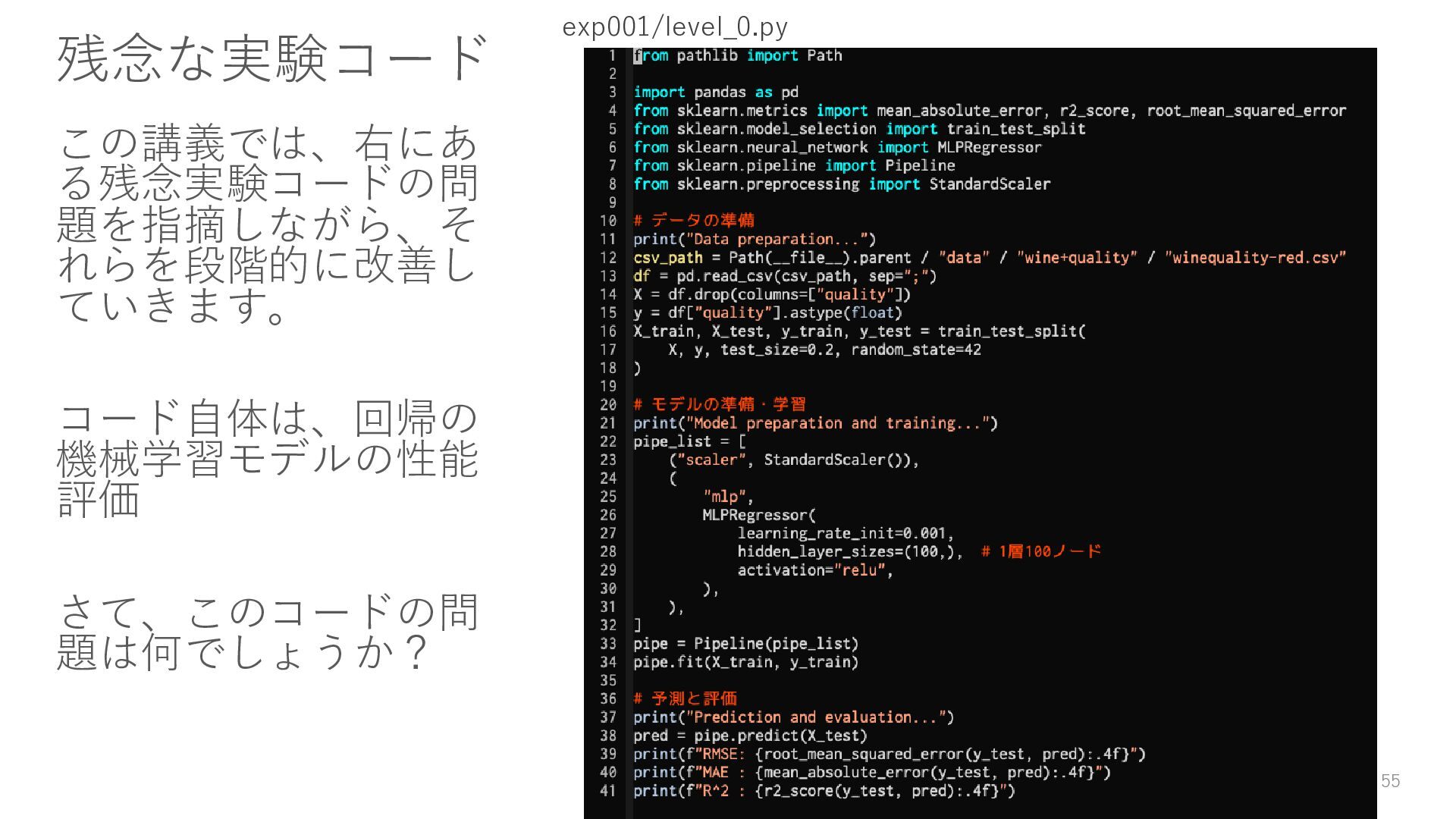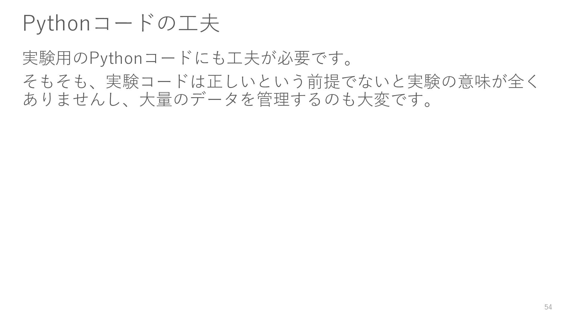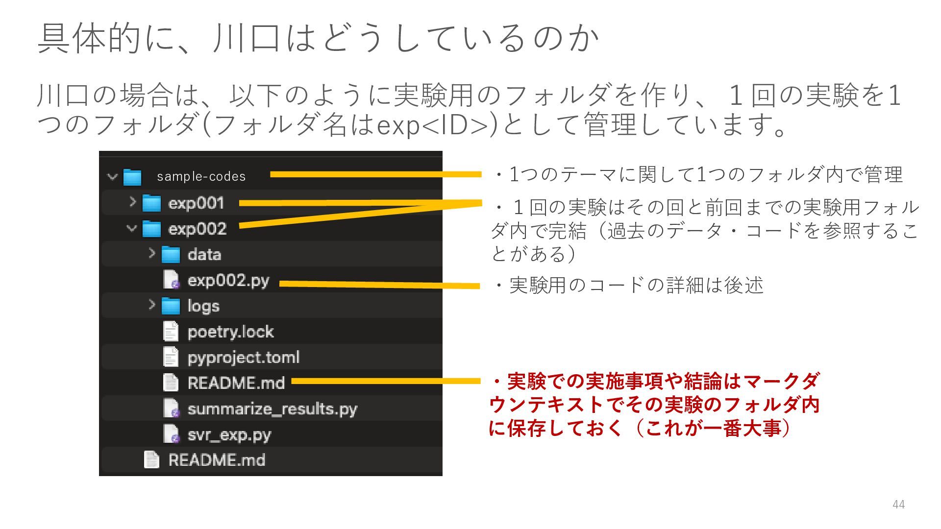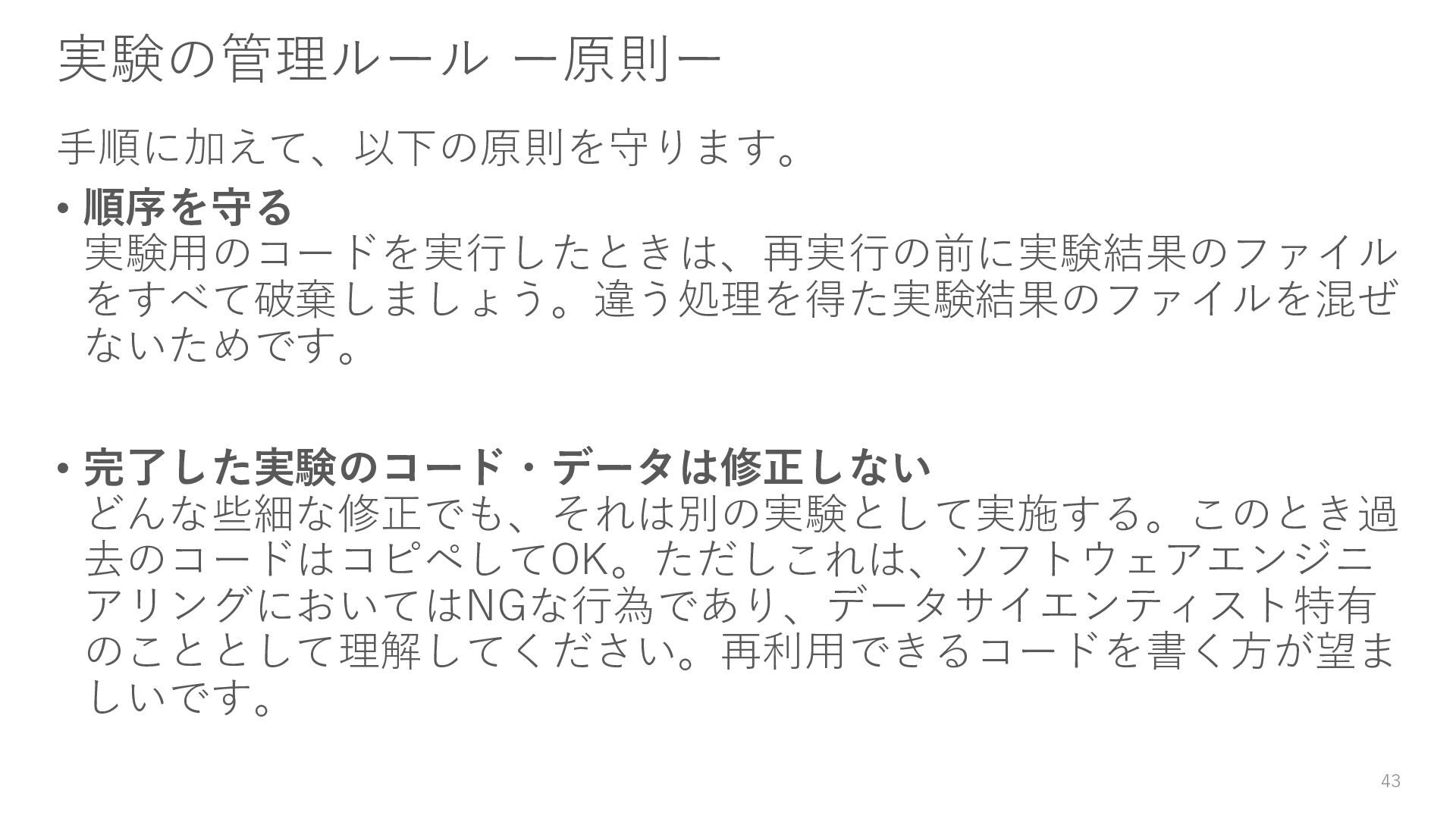 どんな些細な修正でも、それは別の実験として実施する。このとき過 去のコードはコピペしてOK。ただしこれは、ソフトウェアエンジニ アリングにおいてはNGな行為であり、データサイエンティスト特有 のこととして理解してください。再利用できるコードを書く方が望ま しいです。 43