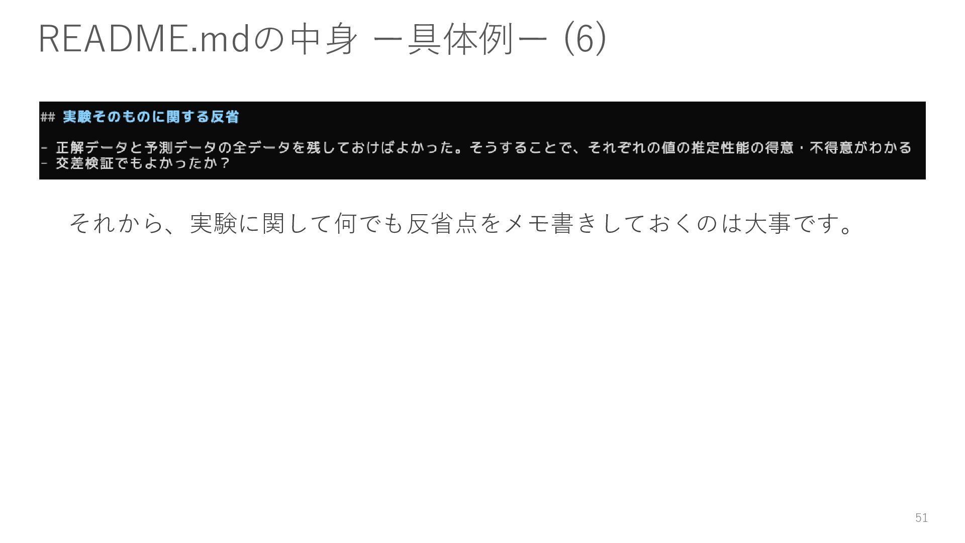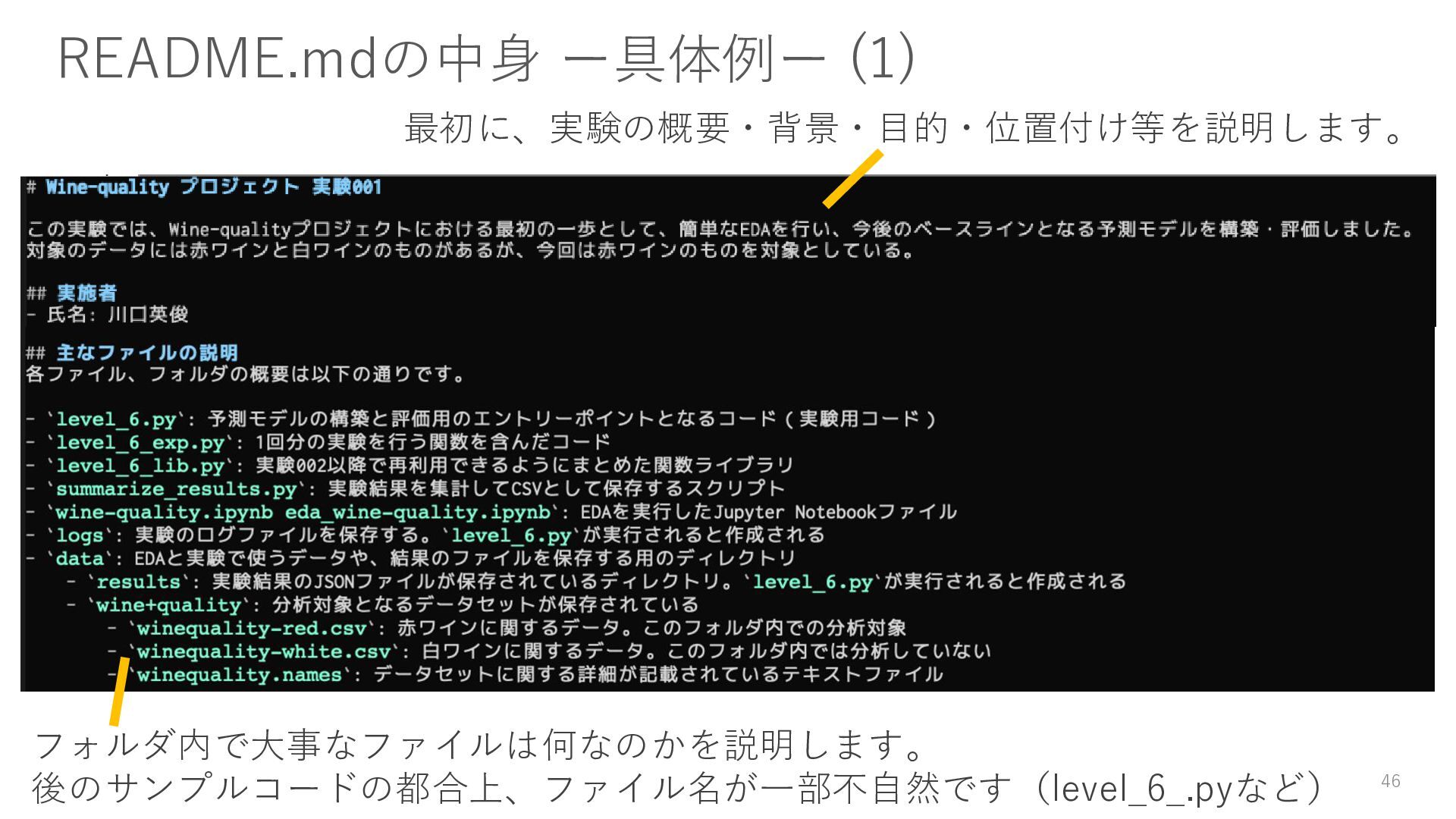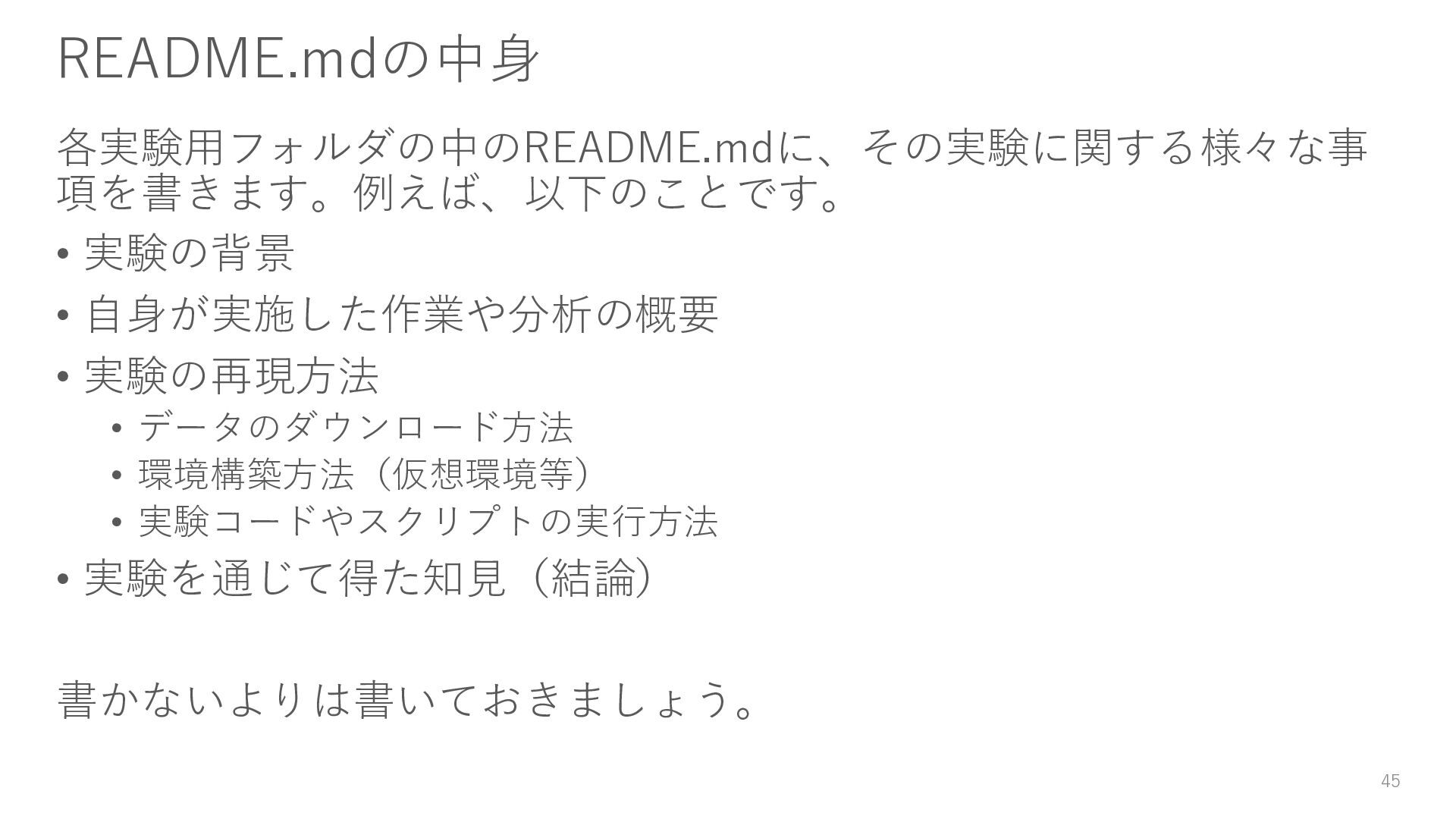 データのダウンロード方法 • 環境構築方法(仮想環境等) • 実験コードやスクリプトの実行方法 • 実験を通じて得た知見(結論) 書かないよりは書いておきましょう。 45