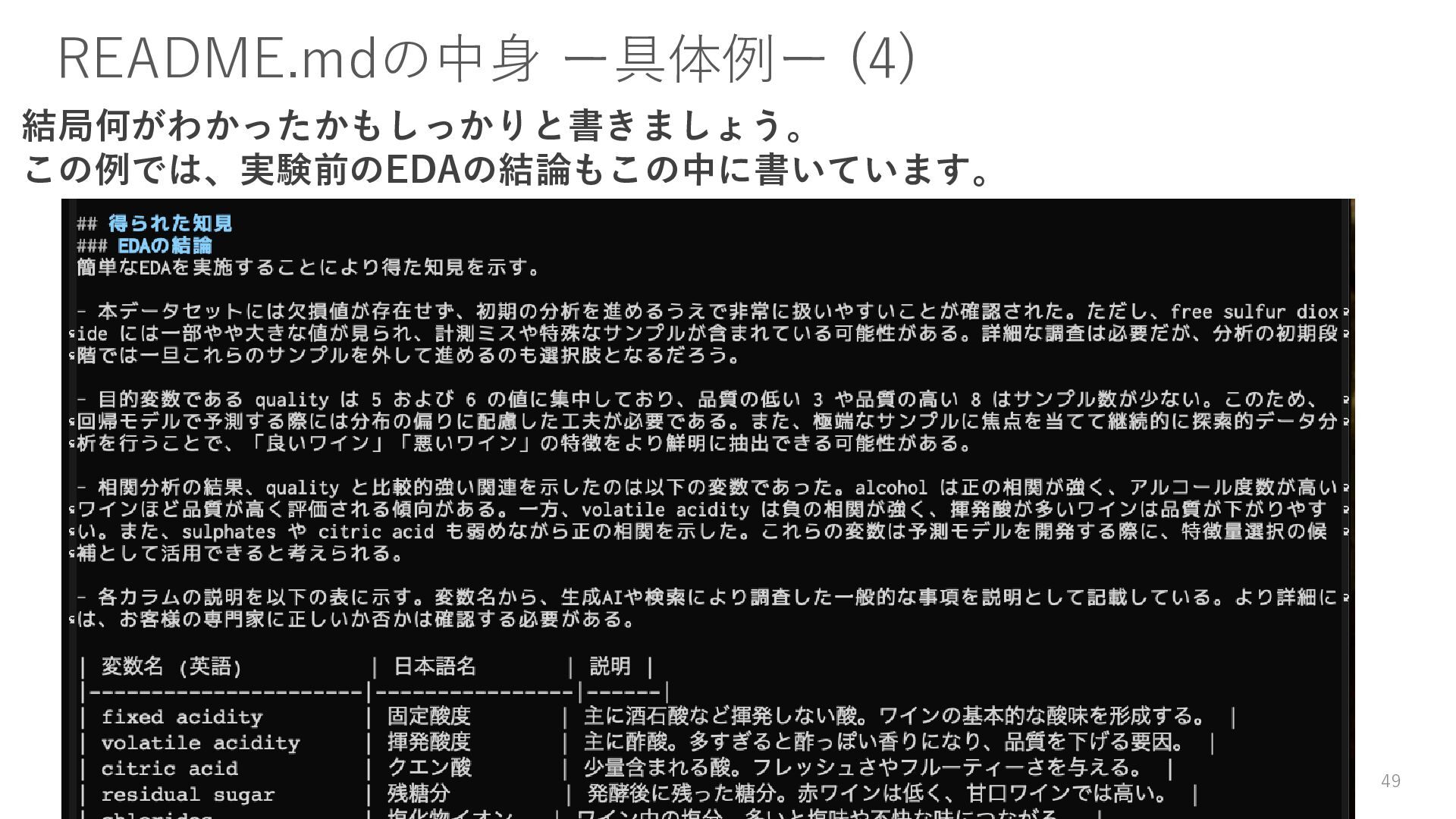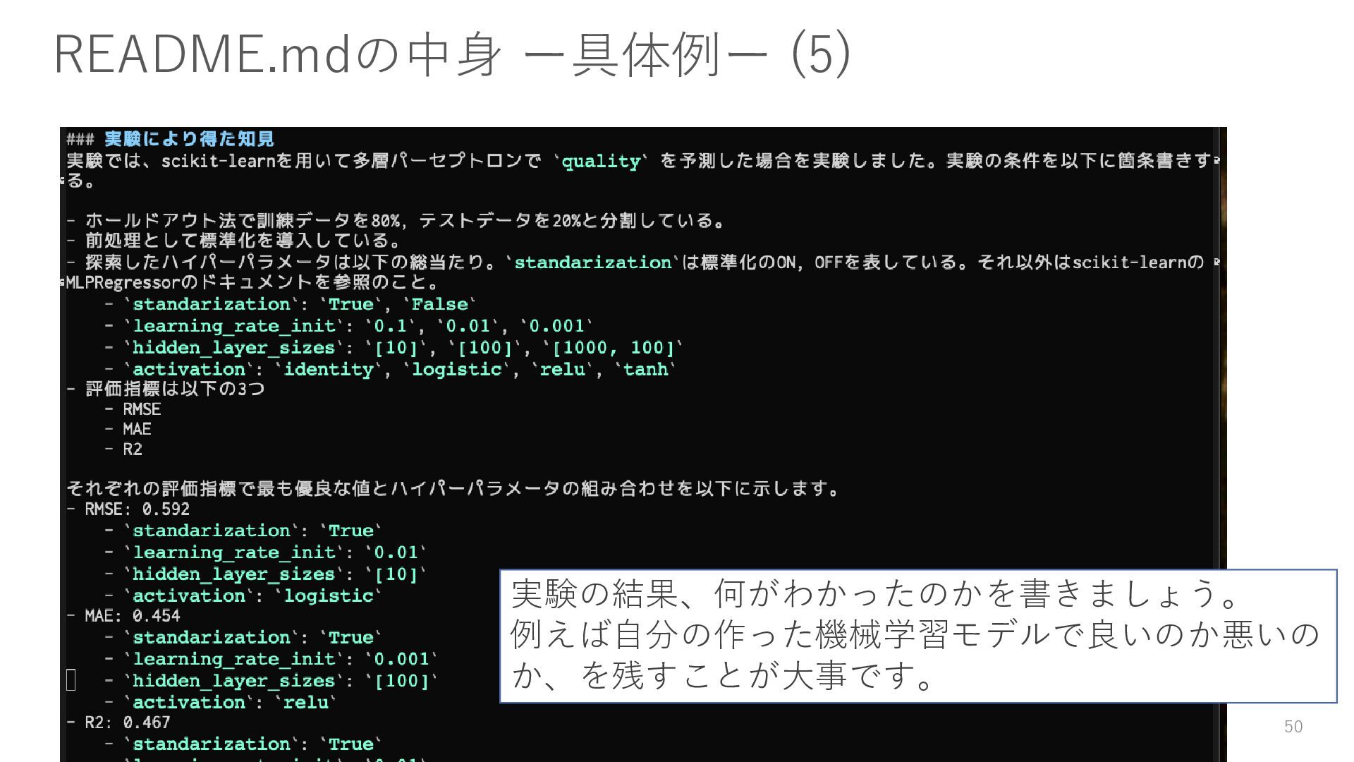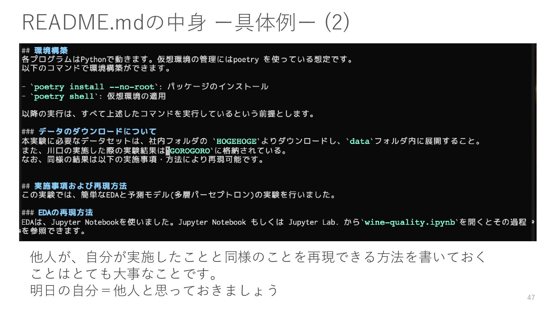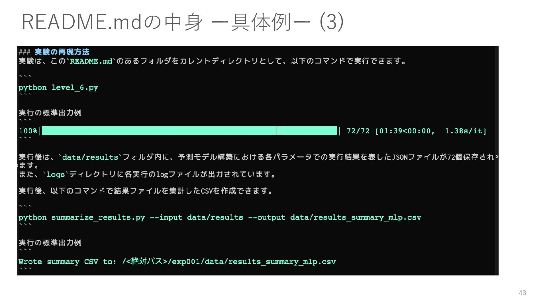データのダウンロード方法 • 環境構築方法(仮想環境等) • 実験コードやスクリプトの実行方法 • 実験を通じて得た知見(結論) 書かないよりは書いておきましょう。 45