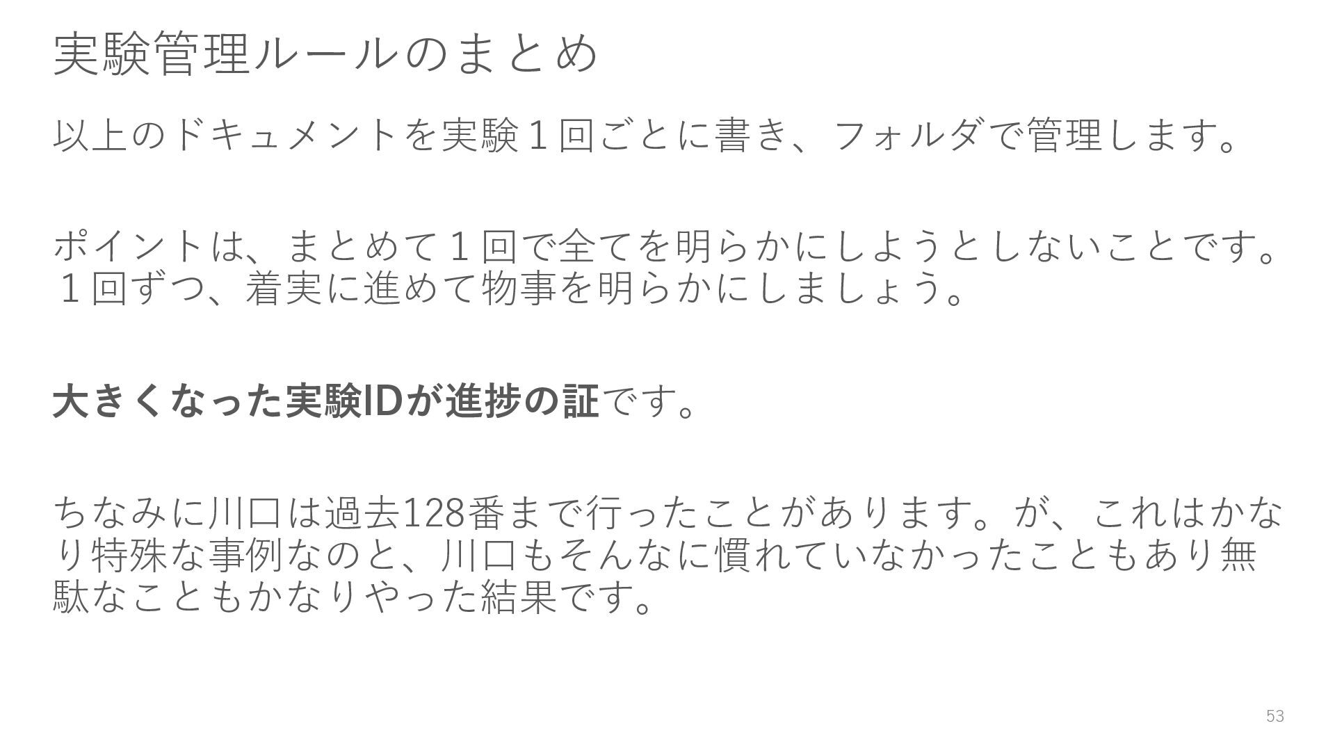 4. 実施事項や実行した結果の考察等、実験に関するすべてのことをテ キストファイルに書く 5. 実験の改善があればそのこともテキストファイルに書く とにかくテキストファイルに書いておくことが大事です。 書いていないことはやらなかった、くらいに思いましょう。 42
