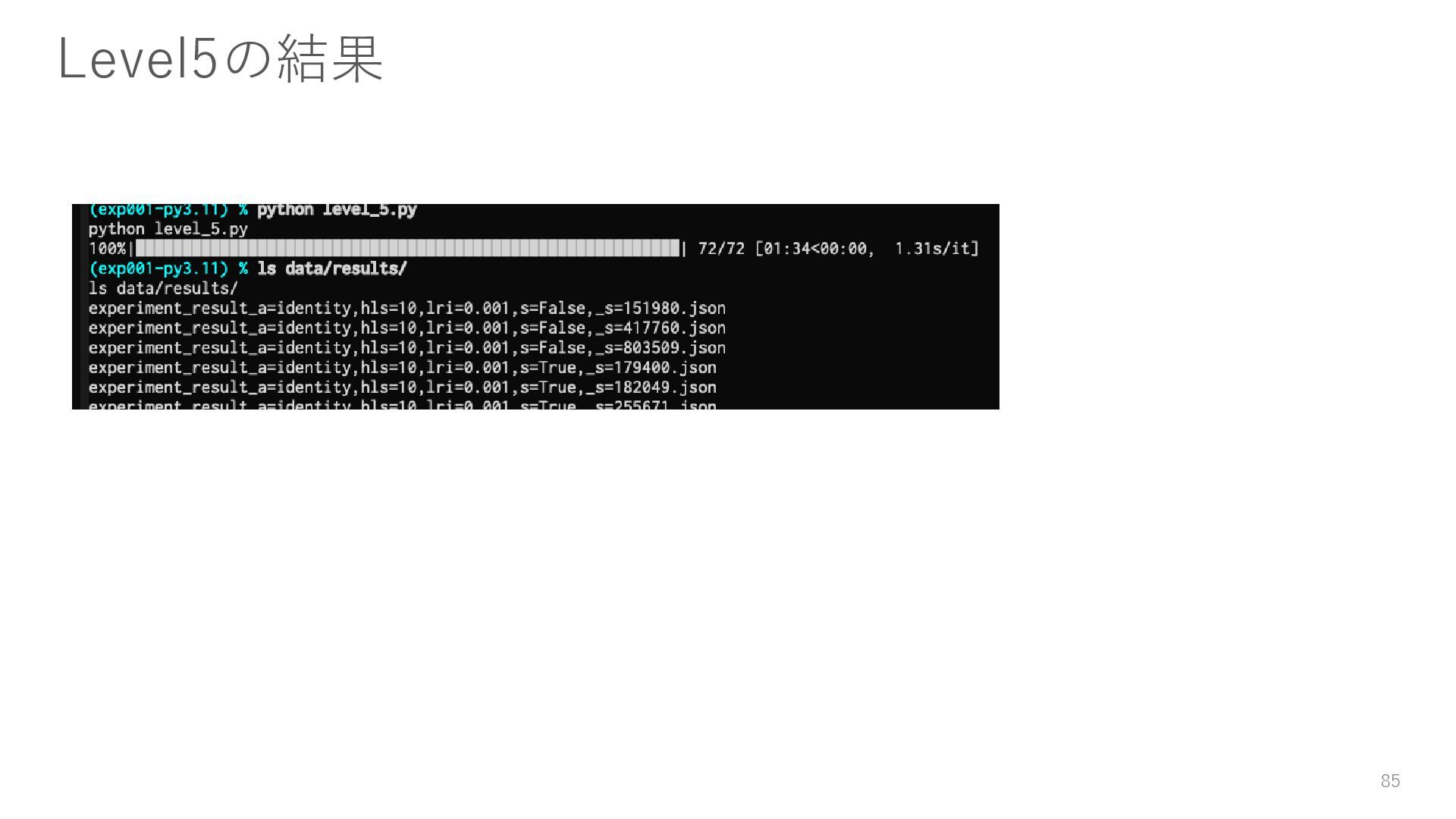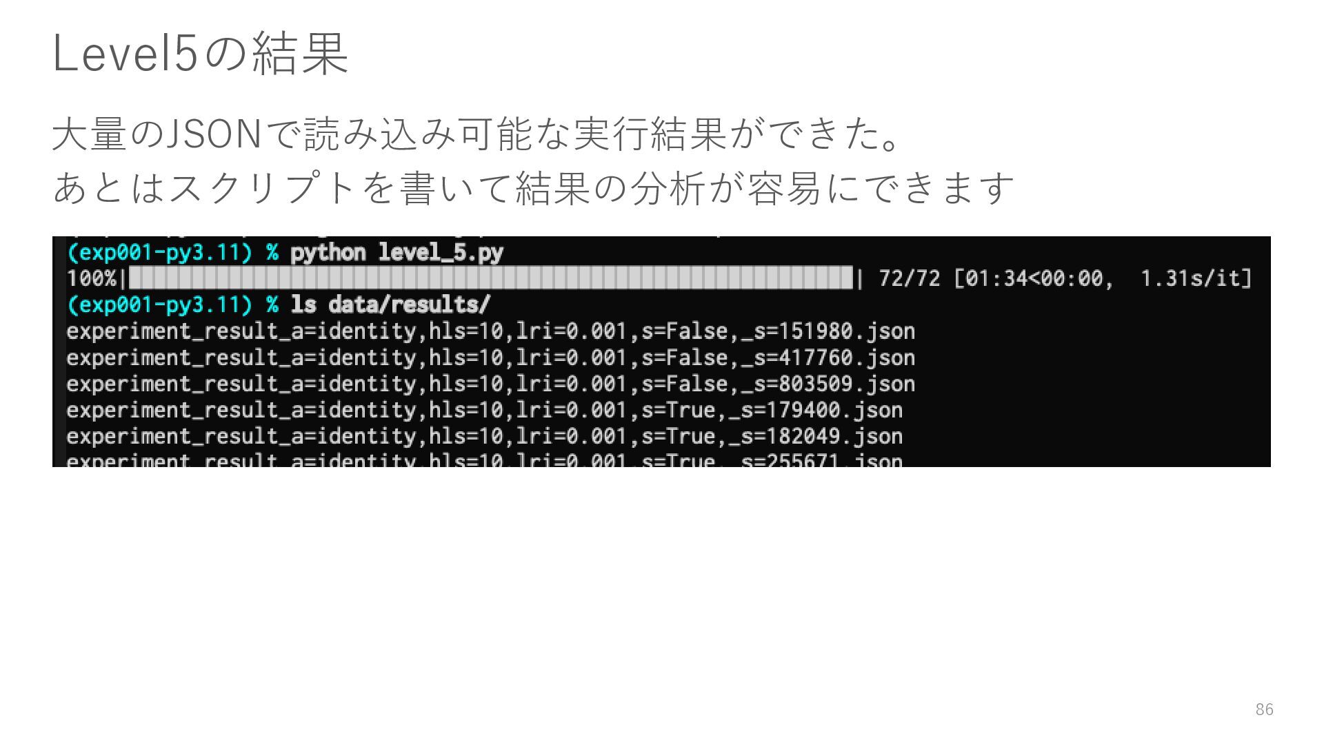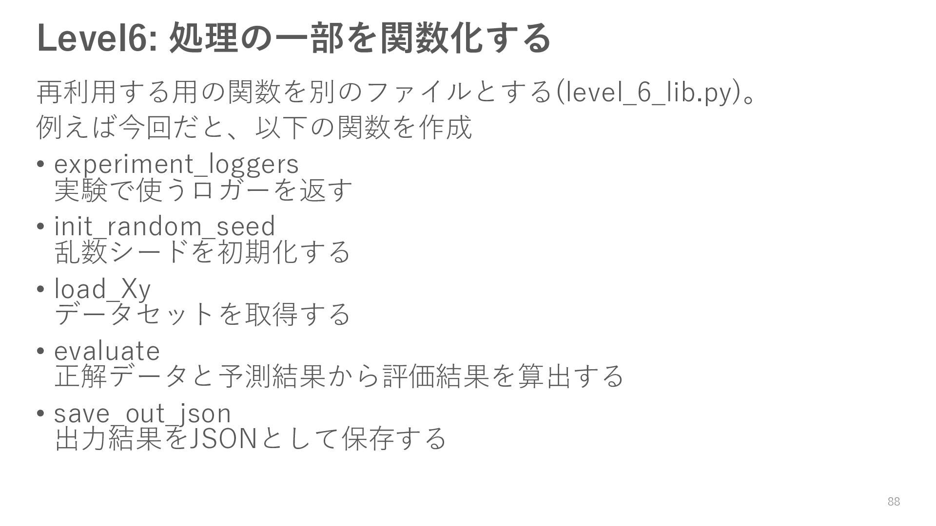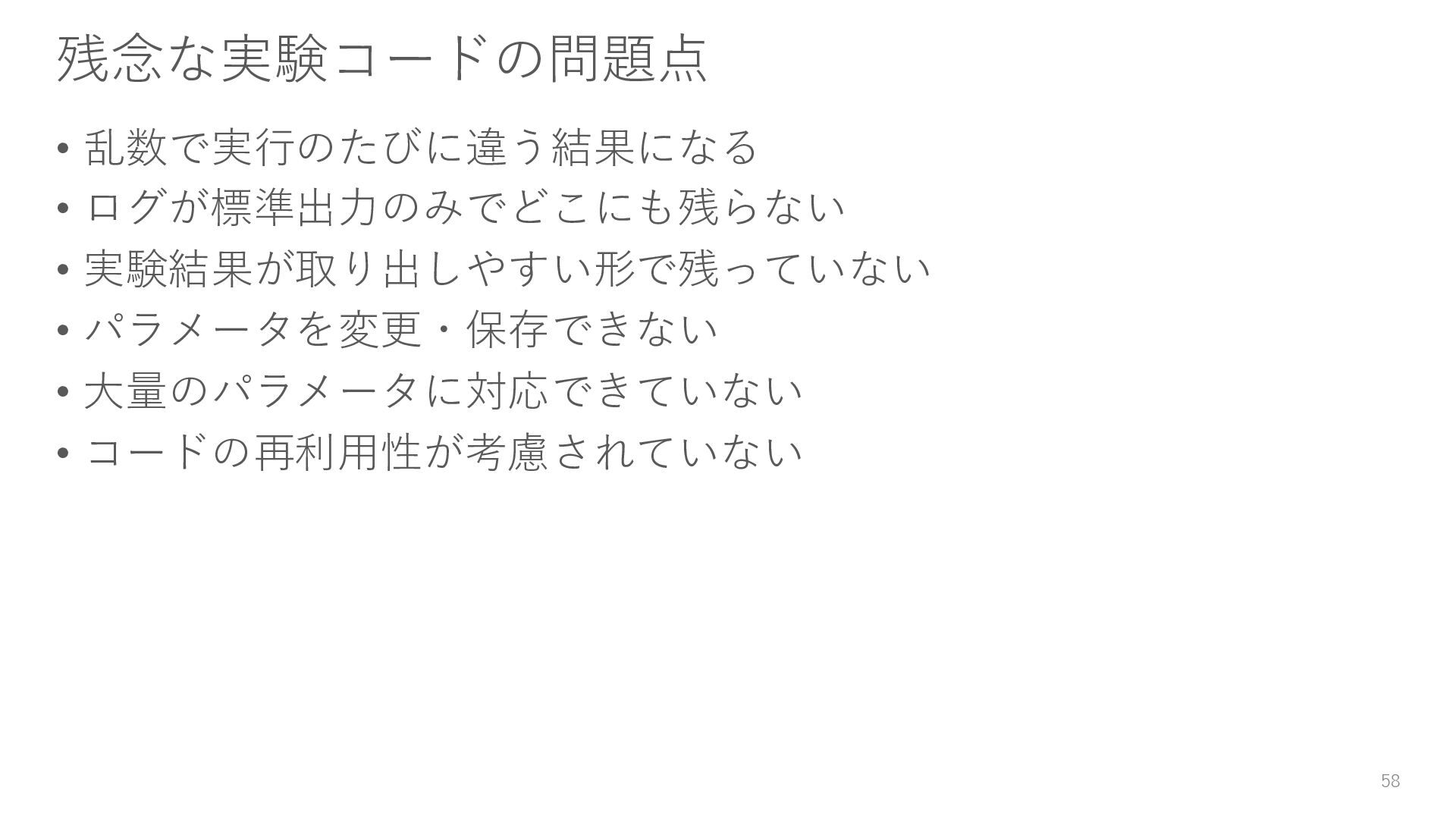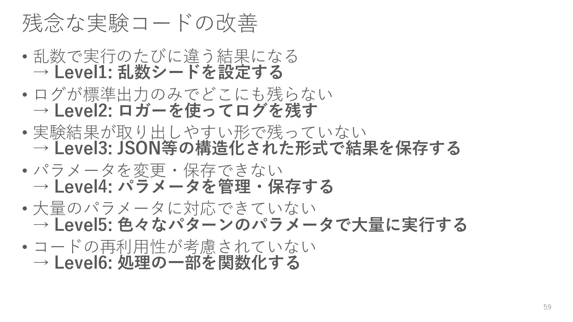 ロガーを使ってログを残す • 実験結果が取り出しやすい形で残っていない → Level3: JSON等の構造化された形式で結果を保存する • パラメータを変更・保存できない → Level4: パラメータを管理・保存する • 大量のパラメータに対応できていない → Level5: 色々なパターンのパラメータで大量に実行する • コードの再利用性が考慮されていない → Level6: 処理の一部を関数化する 59