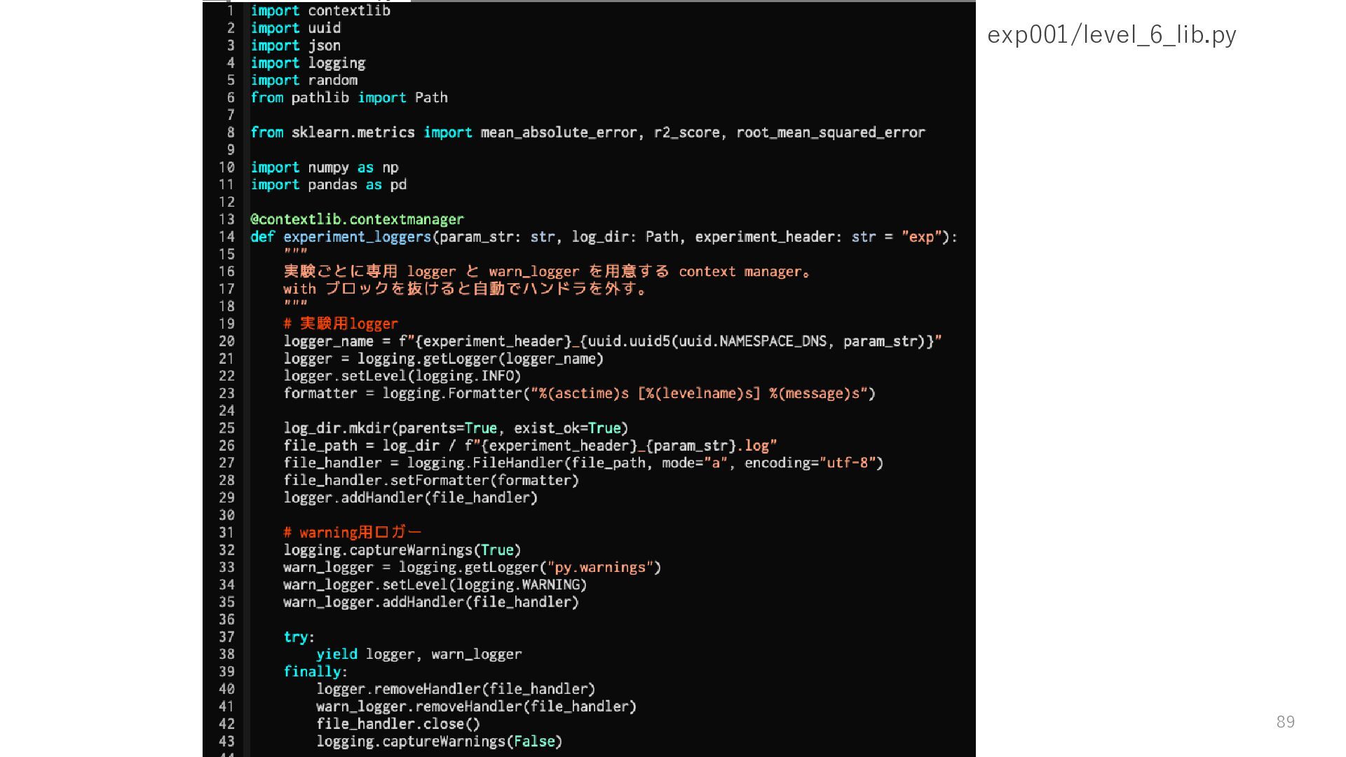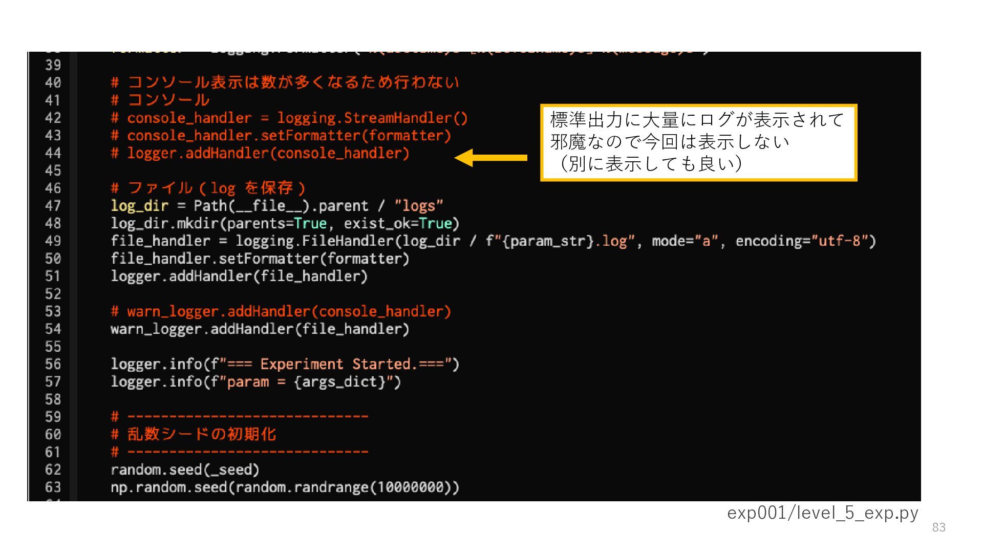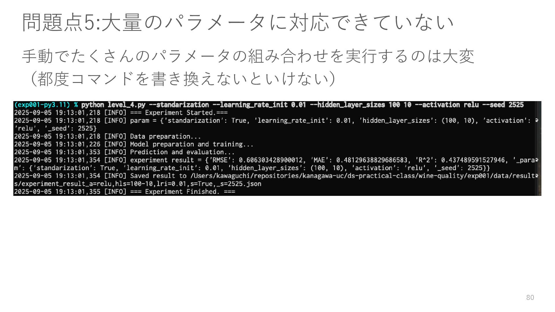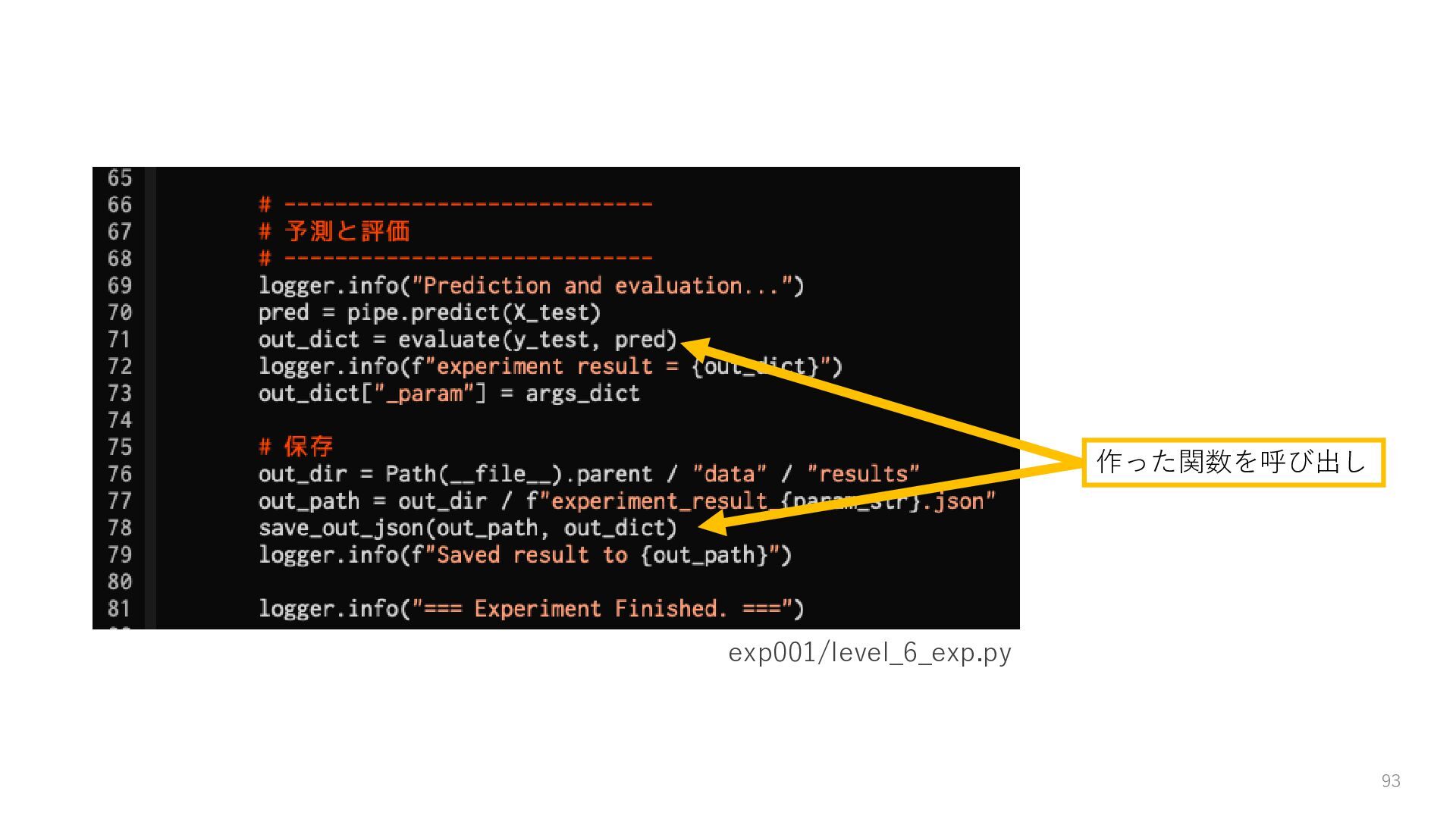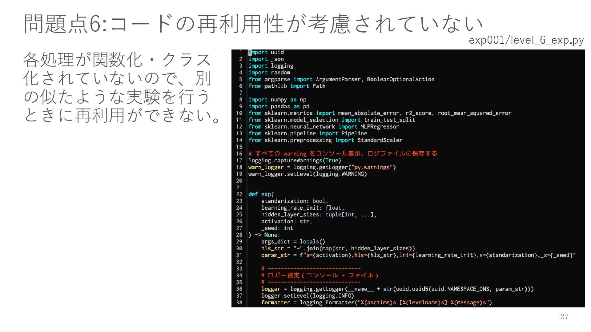 ロガーを使ってログを残す • 実験結果が取り出しやすい形で残っていない → Level3: JSON等の構造化された形式で結果を保存する • パラメータを変更・保存できない → Level4: パラメータを管理・保存する • 大量のパラメータに対応できていない → Level5: 色々なパターンのパラメータで大量に実行する • コードの再利用性が考慮されていない → Level6: 処理の一部を関数化する 59