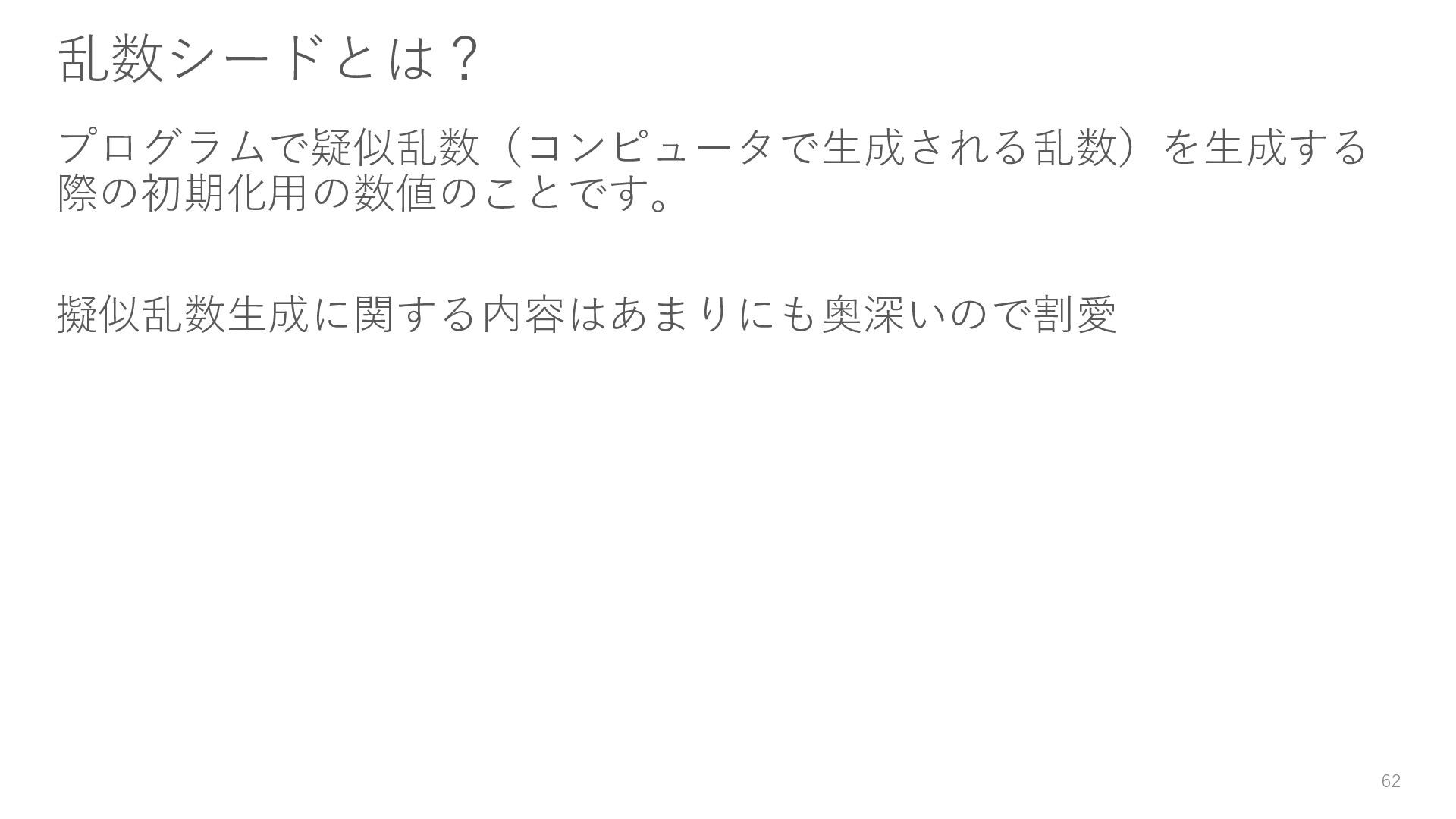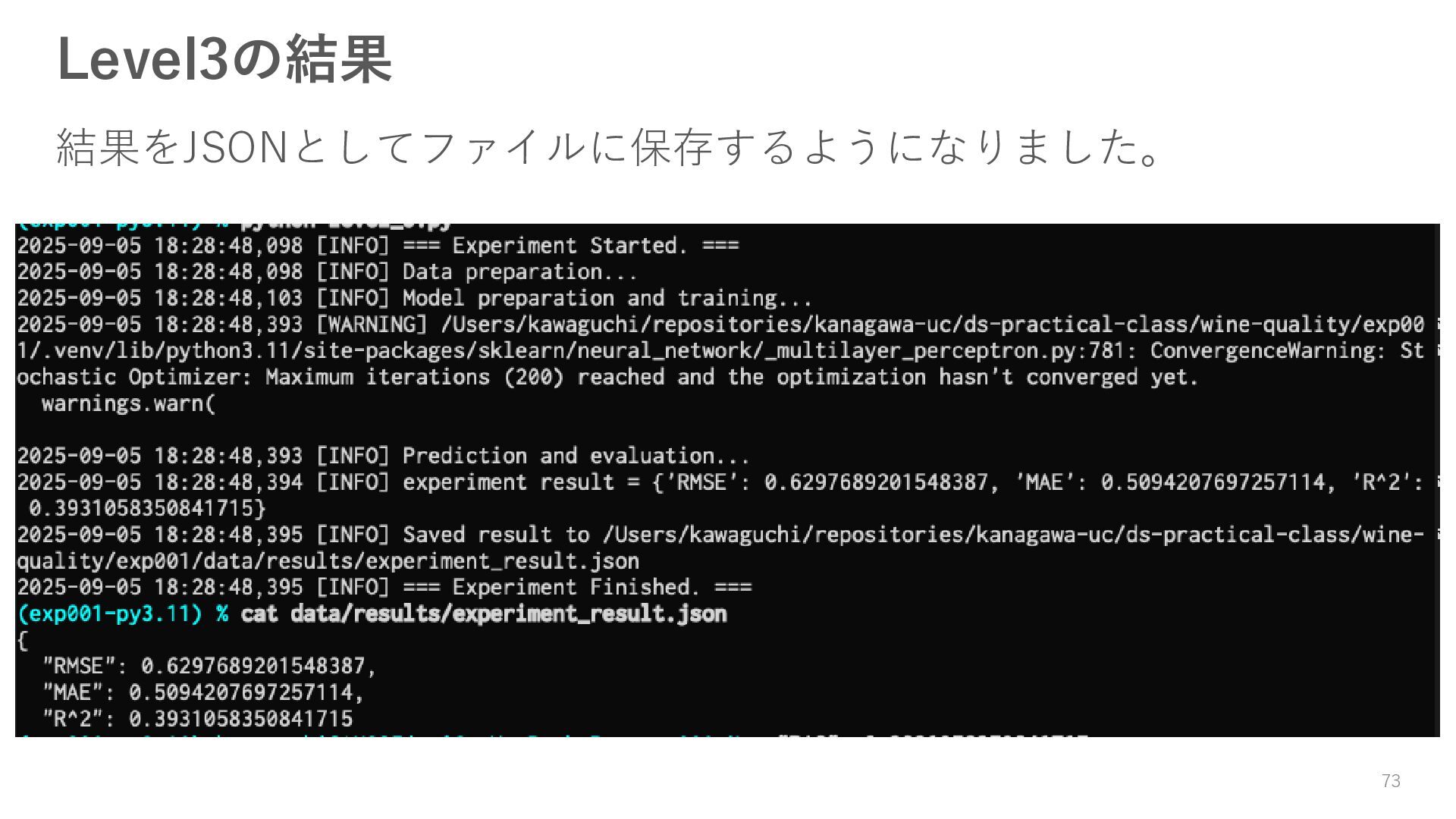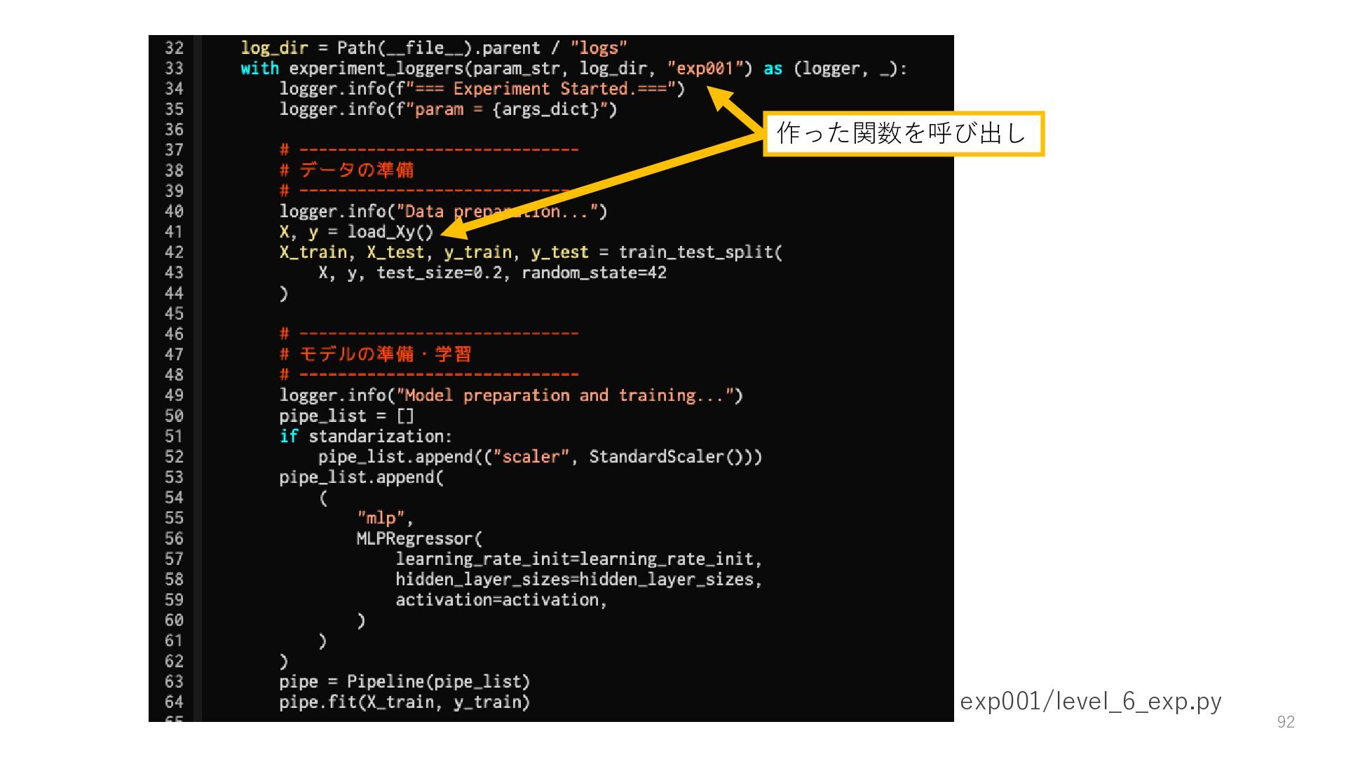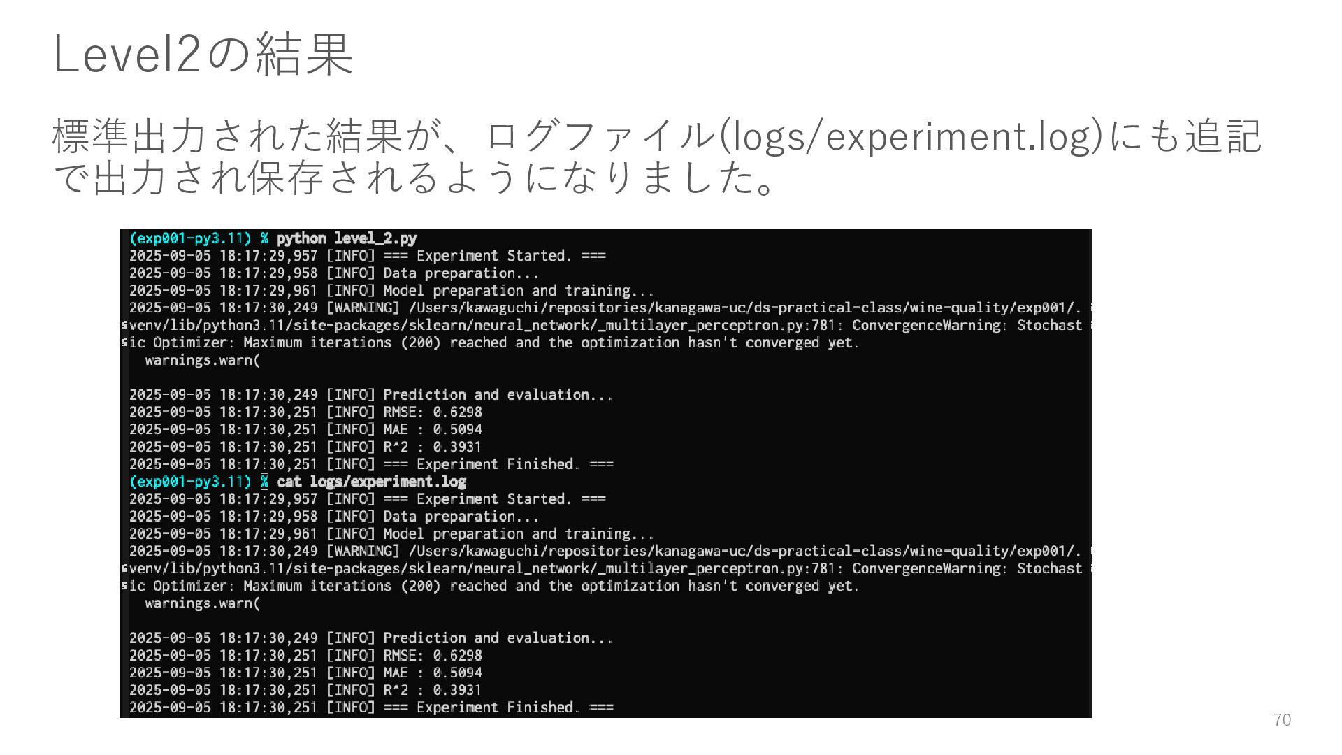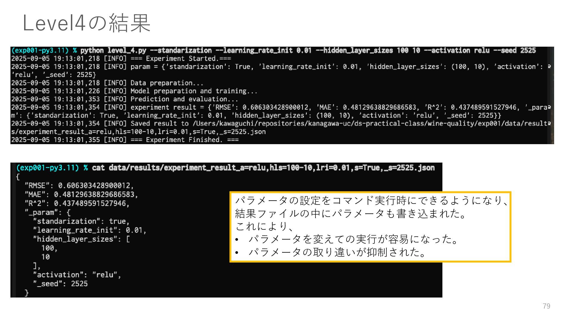 ロガーを使ってログを残す • 実験結果が取り出しやすい形で残っていない → Level3: JSON等の構造化された形式で結果を保存する • パラメータを変更・保存できない → Level4: パラメータを管理・保存する • 大量のパラメータに対応できていない → Level5: 色々なパターンのパラメータで大量に実行する • コードの再利用性が考慮されていない → Level6: 処理の一部を関数化する 59