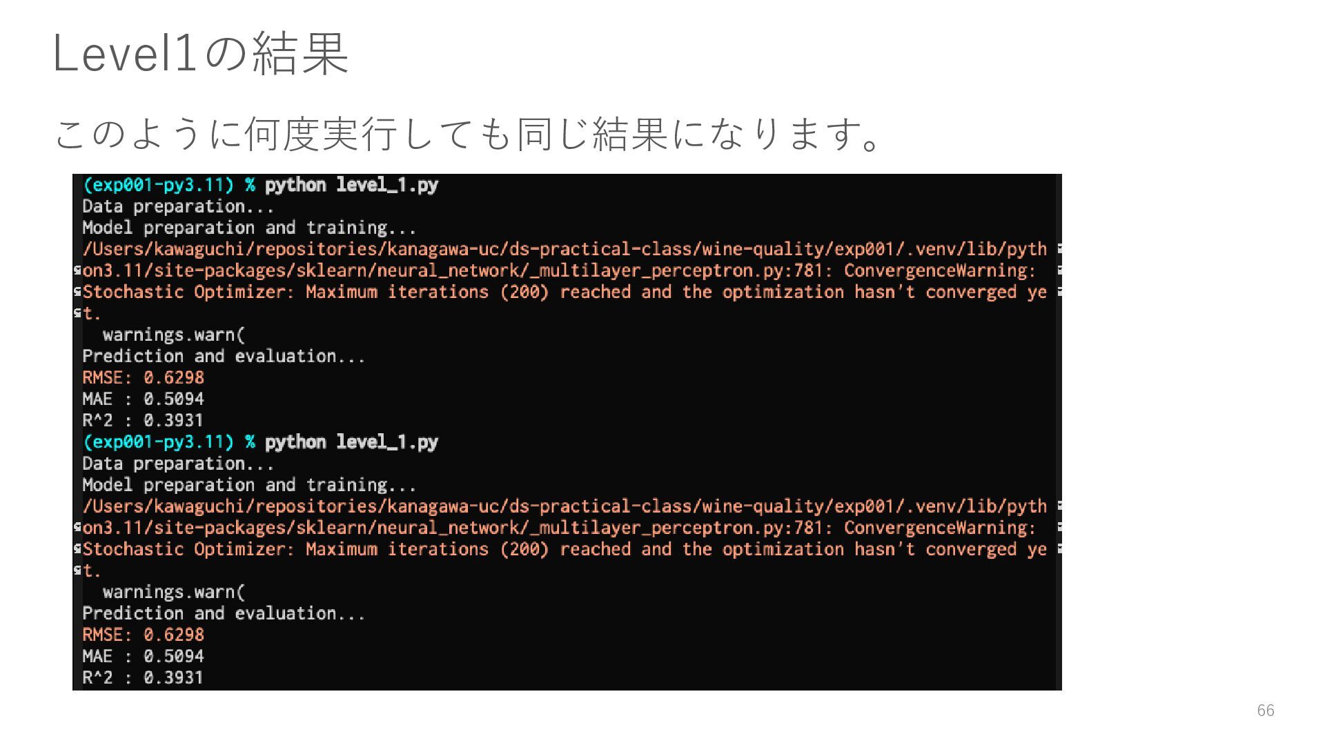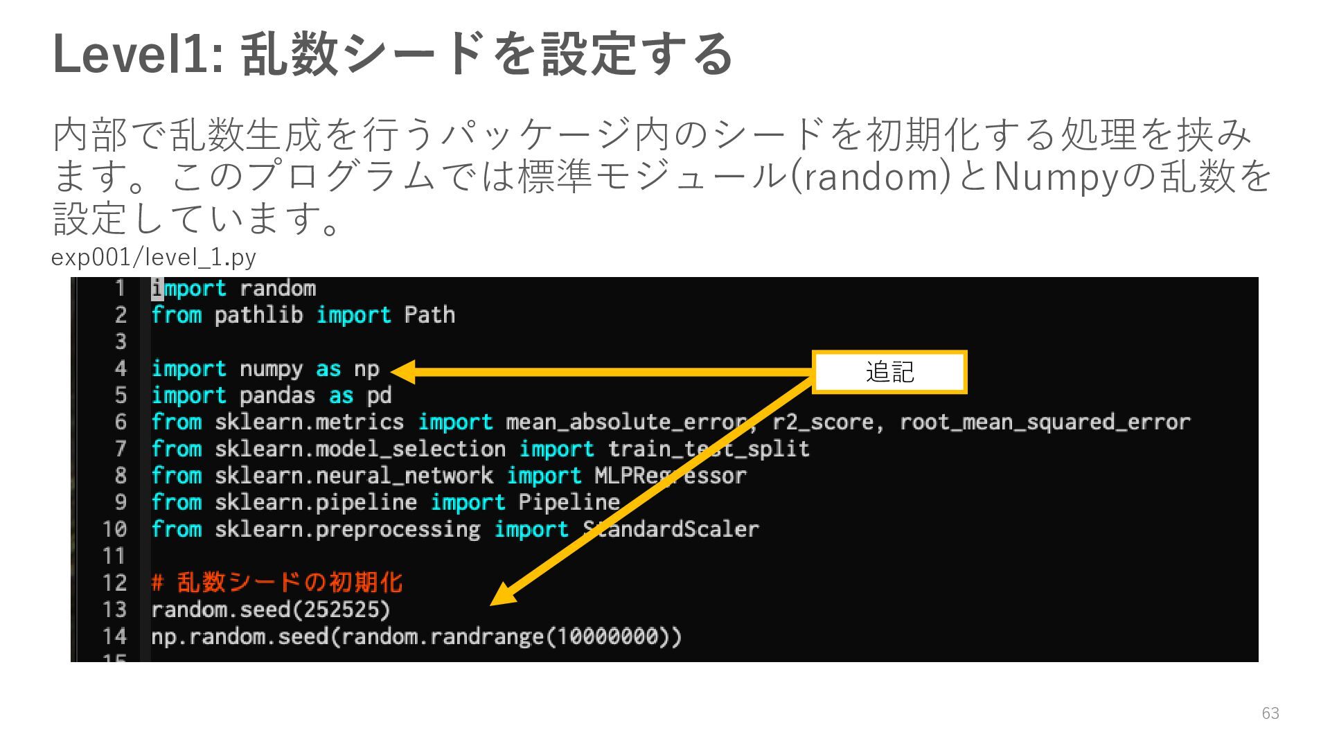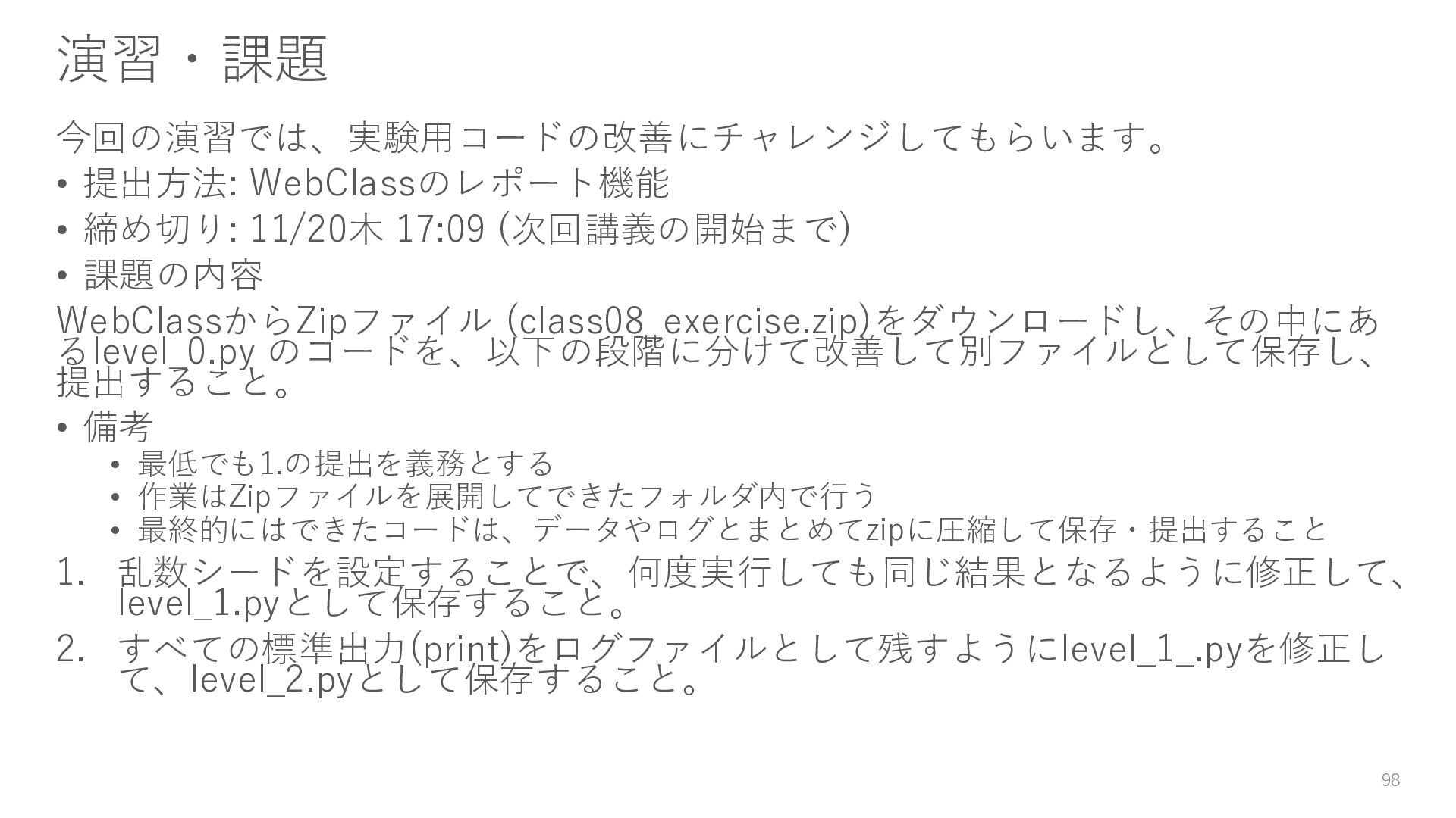 • 課題の内容 WebClassからZipファイル (class08_exercise.zip)をダウンロードし、その中にあ るlevel_0.py のコードを、以下の段階に分けて改善して別ファイルとして保存し、 提出すること。 • 備考 • 最低でも1.の提出を義務とする • 作業はZipファイルを展開してできたフォルダ内で行う • 最終的にはできたコードは、データやログとまとめてzipに圧縮して保存・提出すること 1. 乱数シードを設定することで、何度実行しても同じ結果となるように修正して、 level_1.pyとして保存すること。 2. すべての標準出力(print)をログファイルとして残すようにlevel_1_.pyを修正し て、level_2.pyとして保存すること。 98
