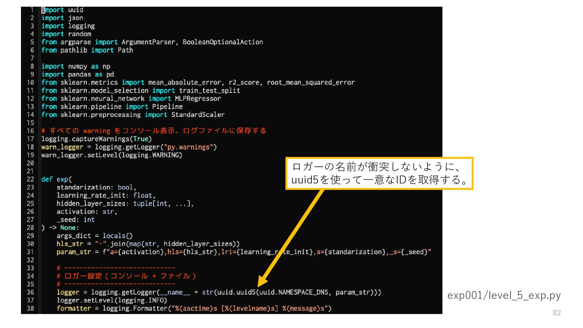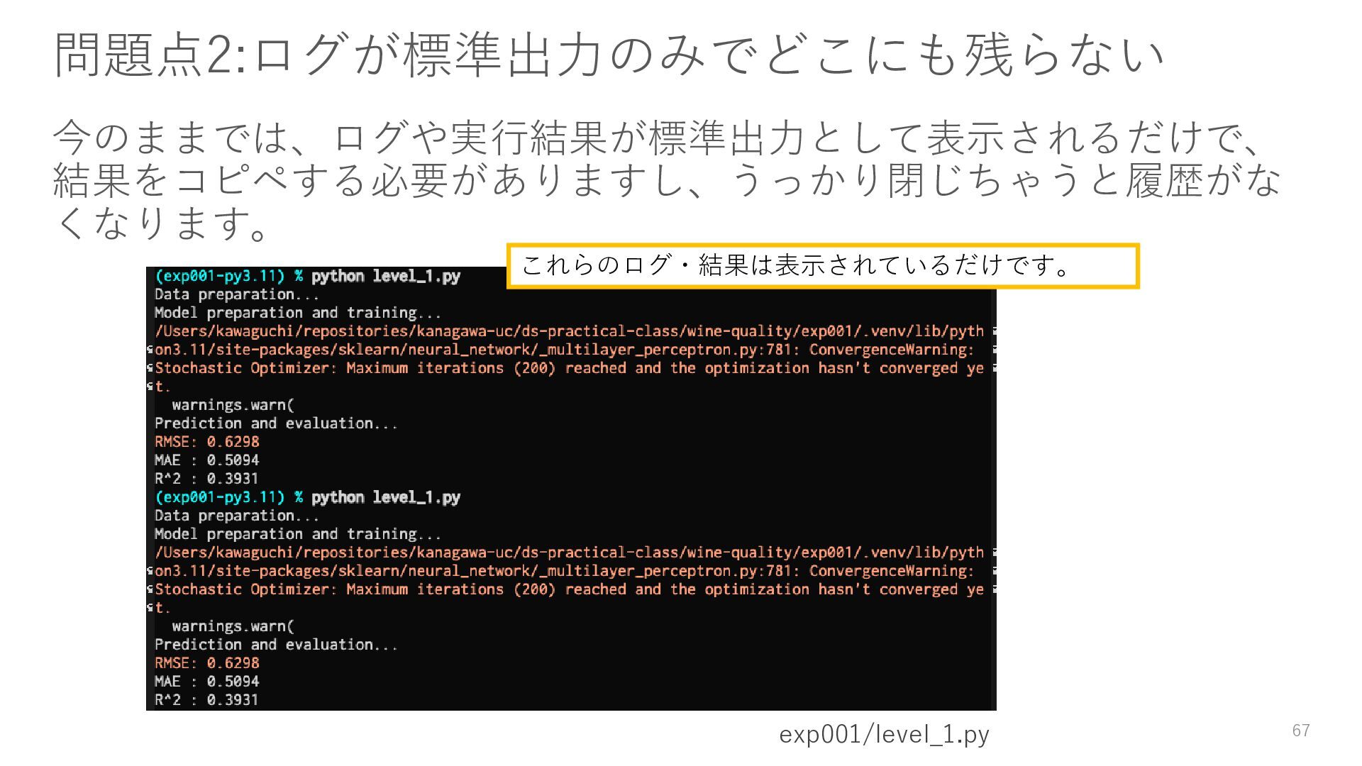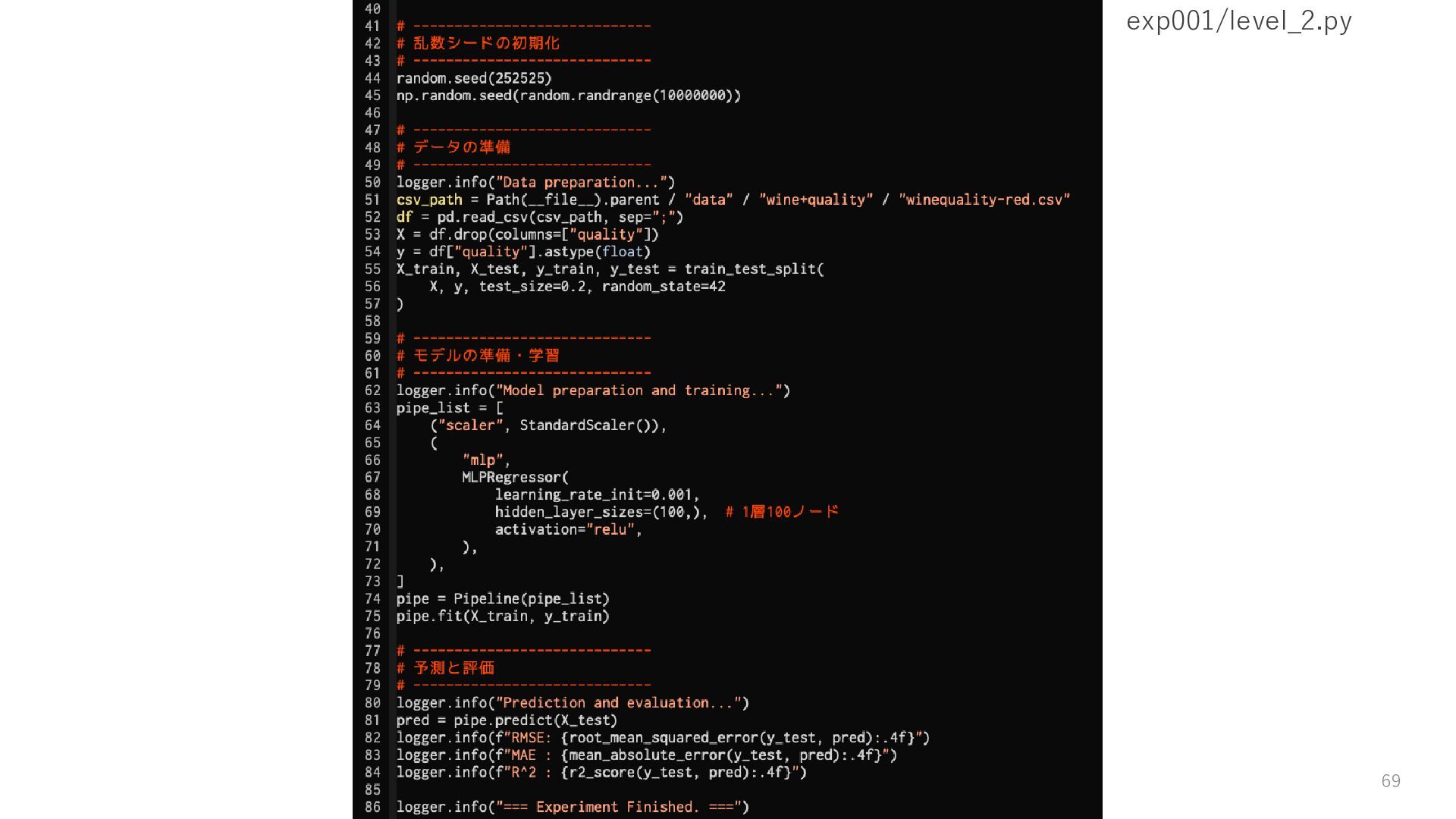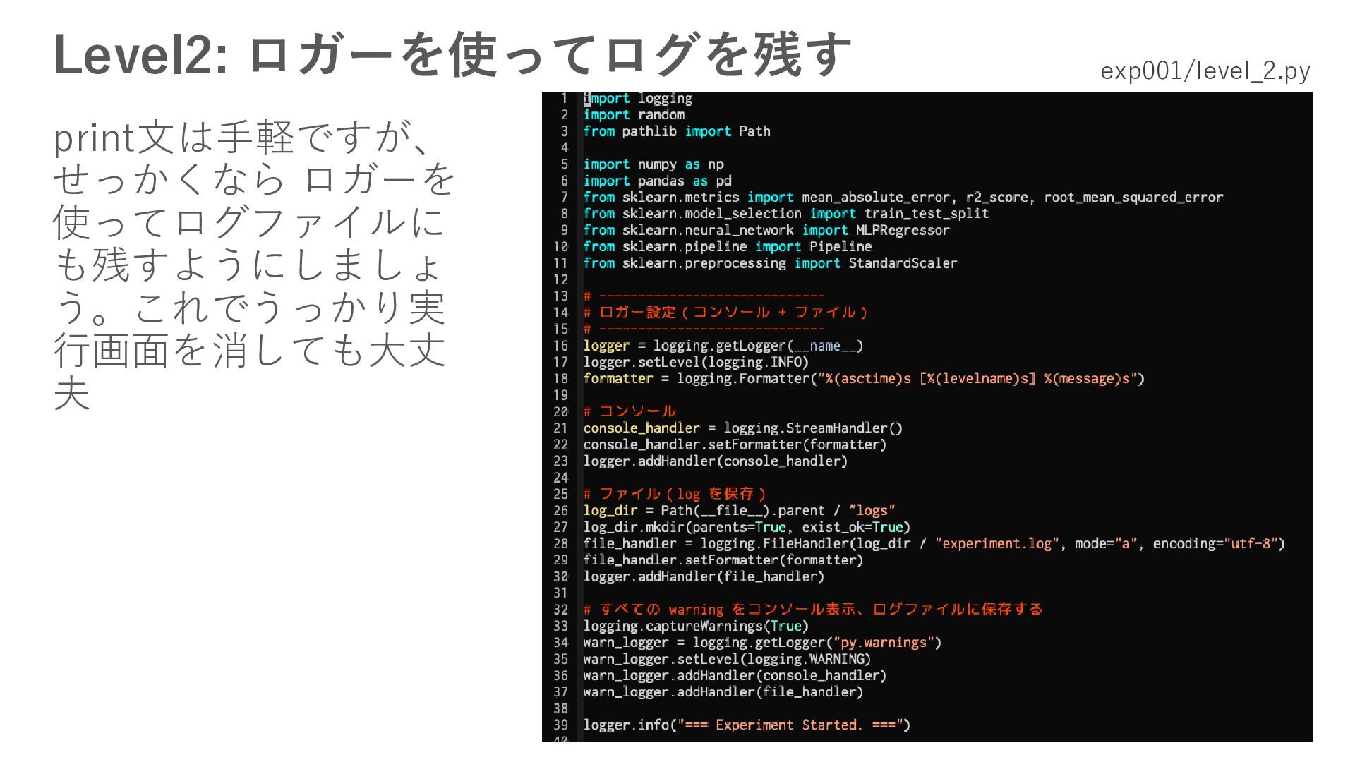 15. 残念な実験コードの改善 • 乱数で実行のたびに違う結果になる → Level1: 乱数シードを設定する • ログが標準出力のみでどこにも残らない → Level2: