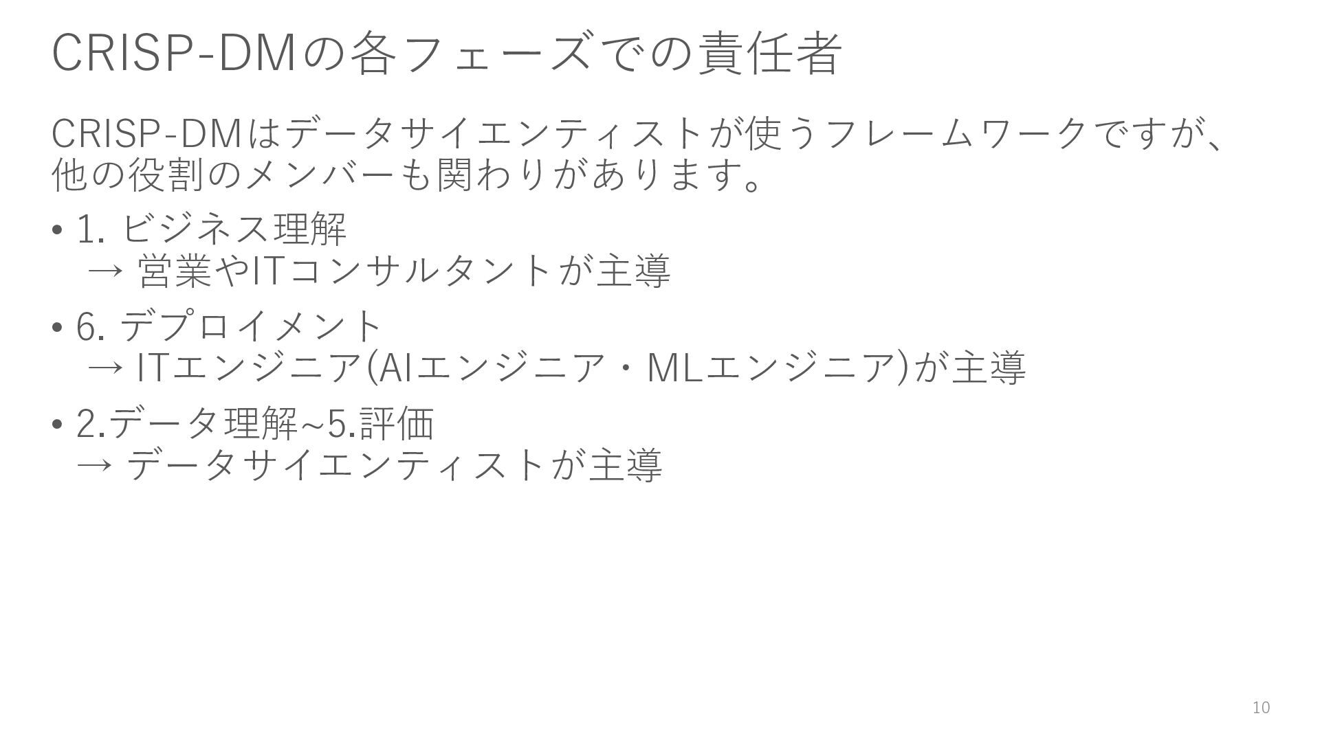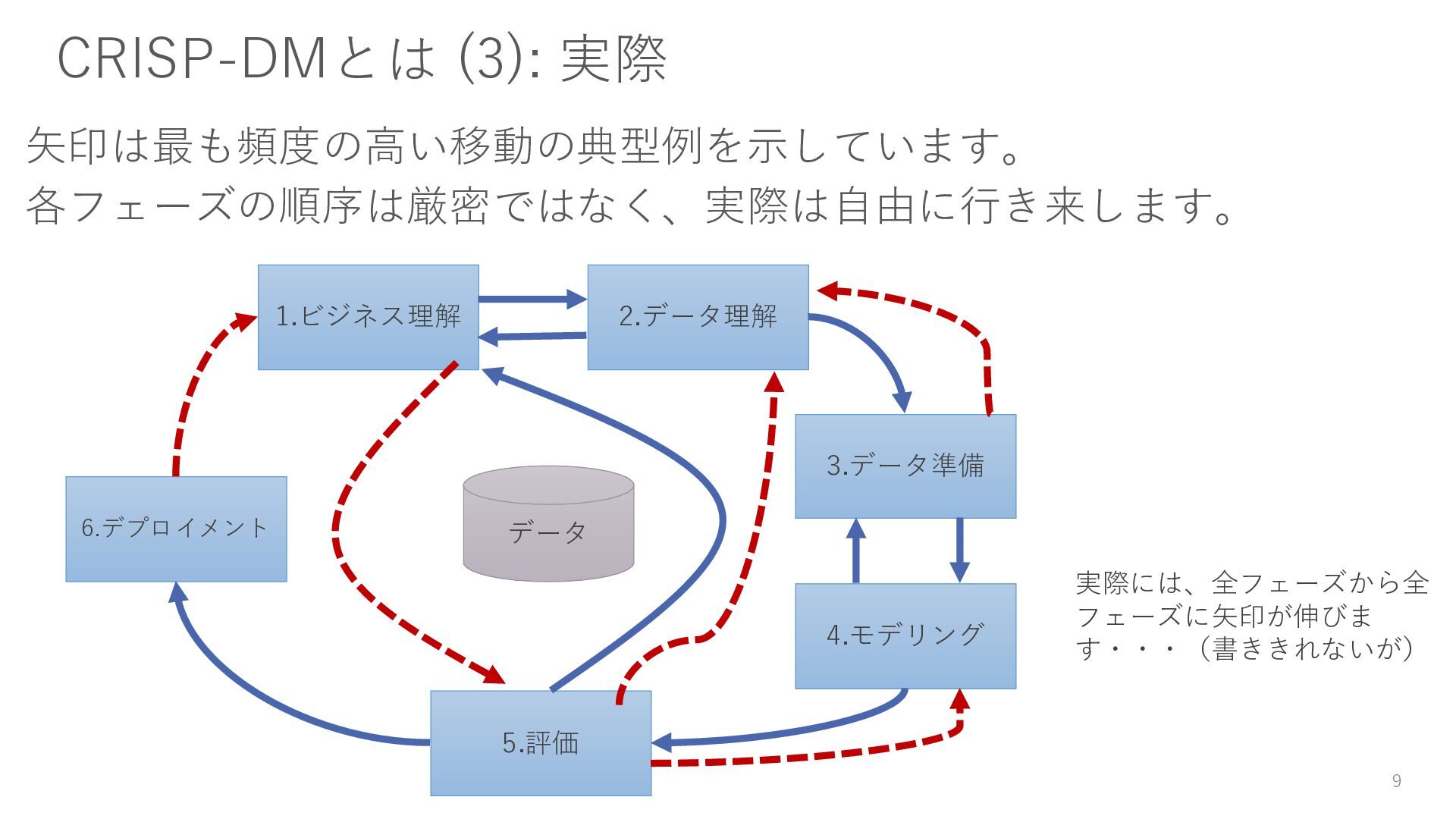 3. データ準備 必要なデータを収集・加工・クレンジングして、モデリングに適した形に 整える。 4. モデリング 機械学習や統計的手法を用いて、目的に合った モデルを構築する。 5. 評価 モデルの性能を評価し、ビジネス課題の 解決に十分かどうかを確認する。 6. デプロイメント 実運用に組み込むための開発作業 8 1.ビジネス理解 2.データ理解 3.データ準備 4.モデリング 5.評価 6.デプロイメント データ