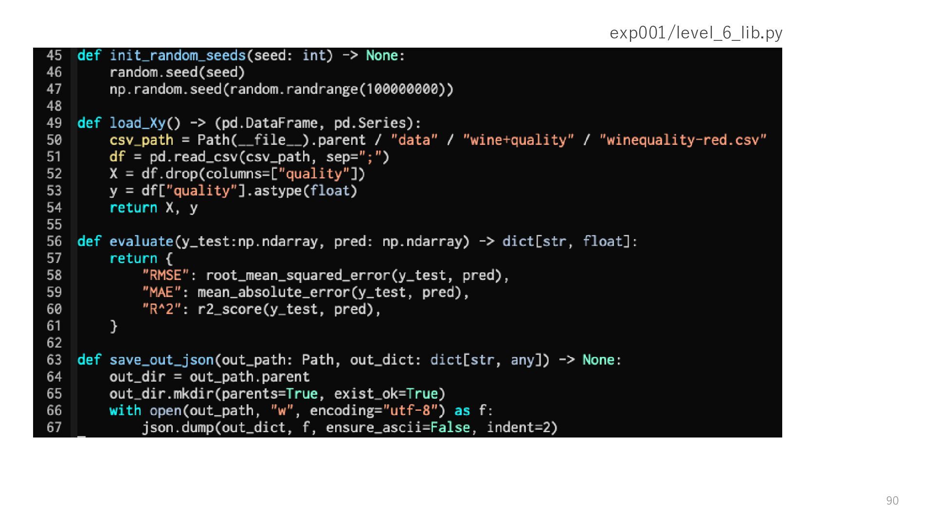 • load_Xy データセットを取得する • evaluate 正解データと予測結果から評価結果を算出する • save_out_json 出力結果をJSONとして保存する 88
