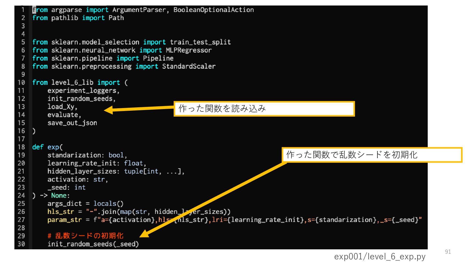 17. Level6: 処理の一部を関数化する 再利用する用の関数を別のファイルとする(level_6_lib.py)。 例えば今回だと、以下の関数を作成 • experiment_loggers 実験で使うロガーを返す • init_random_seed 乱数シードを初期化する