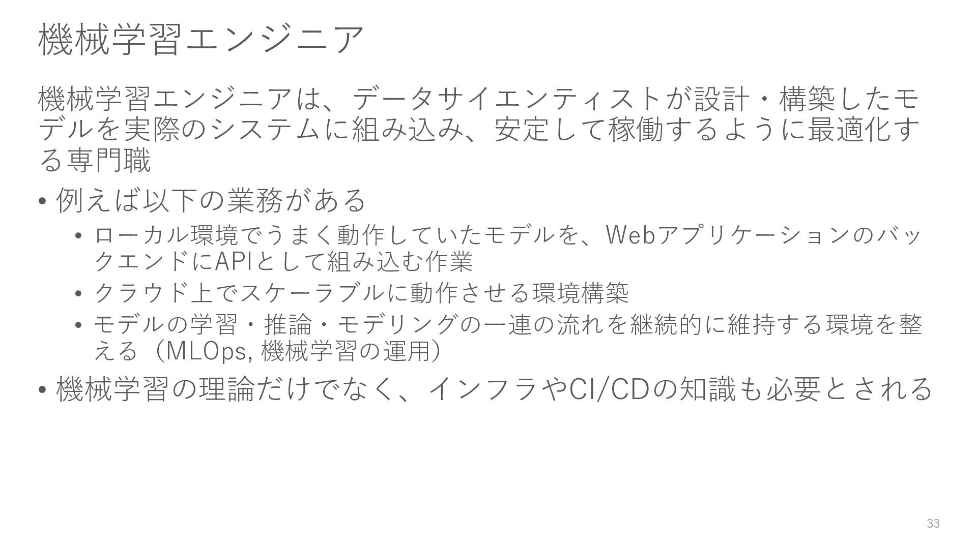 クラウド上でスケーラブルに動作させる環境構築 • モデルの学習・推論・モデリングの一連の流れを継続的に維持する環境を整 える(MLOps, 機械学習の運用) • 機械学習の理論だけでなく、インフラやCI/CDの知識も必要とされる 33