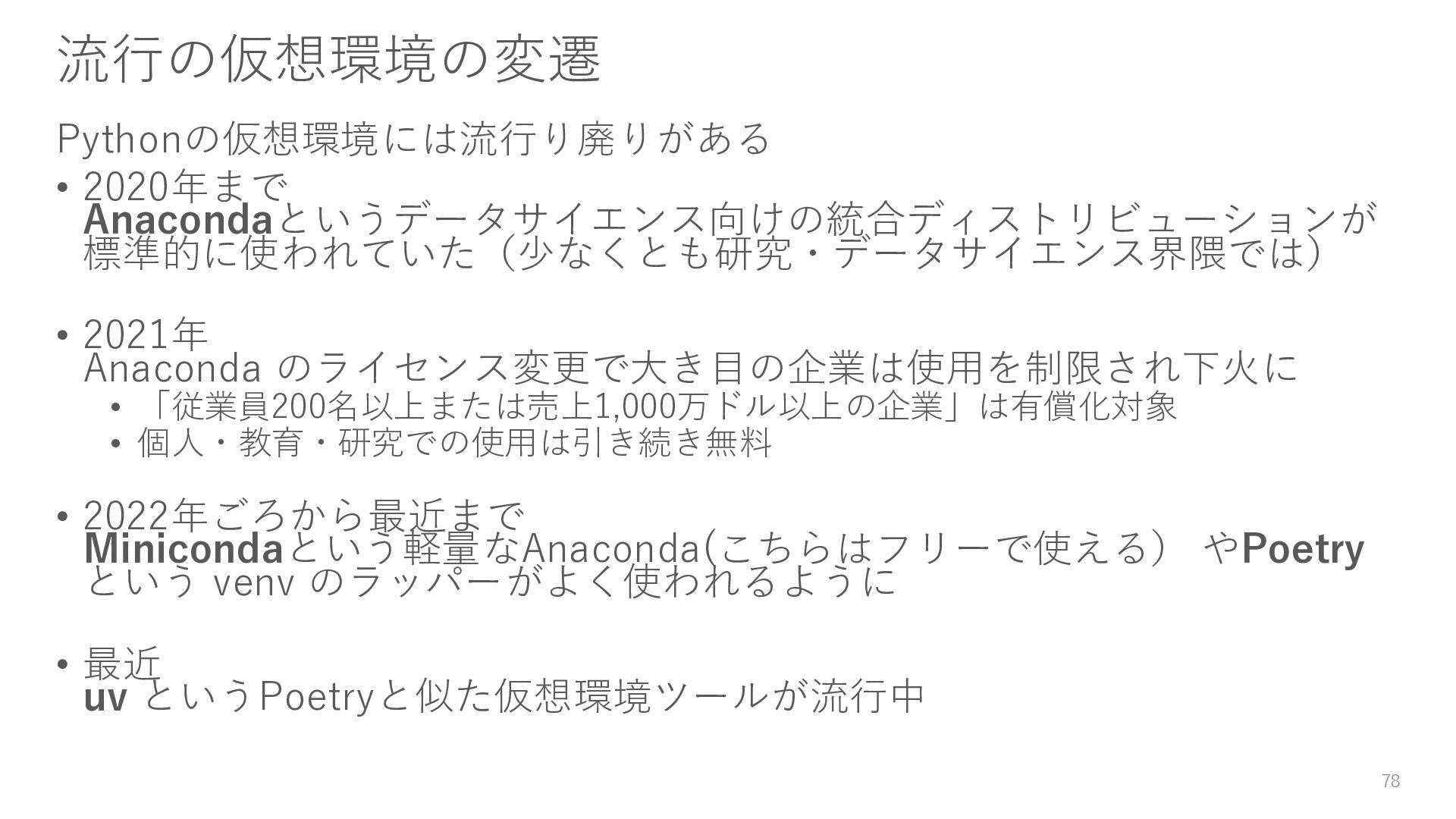 • 「従業員200名以上または売上1,000万ドル以上の企業」は有償化対象 • 個人・教育・研究での使用は引き続き無料 • 2022年ごろから最近まで Minicondaという軽量なAnaconda(こちらはフリーで使える) やPoetry という venv のラッパーがよく使われるように • 最近 uv というPoetryと似た仮想環境ツールが流行中 78