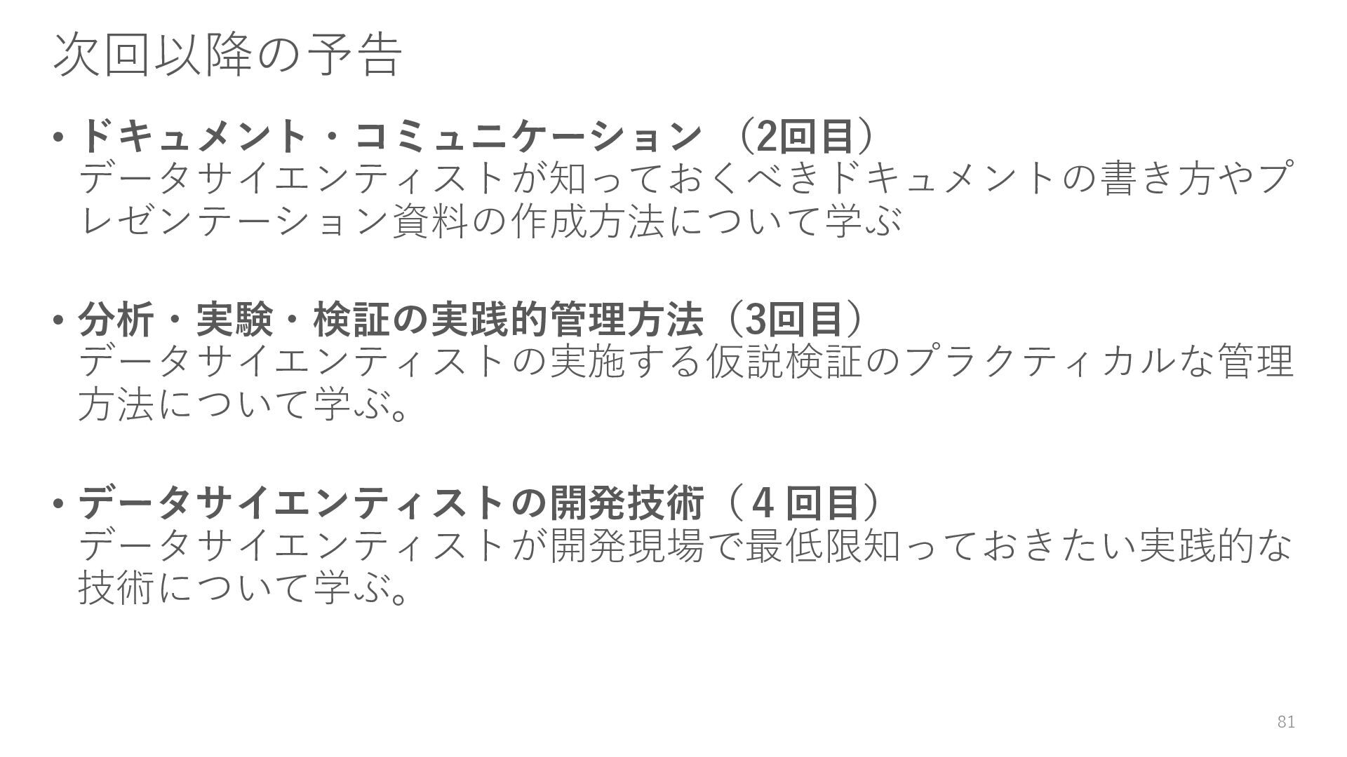 ITベンダーのデータサイエンティストと周囲の人々 • 営業・ITコンサルタント・ITエンジニア・研究者がいる • データサイエンティストは、コードも書くがドキュメントを成果として重視し、顧客の ニーズドリブンで働く • [後半] 2回目以降の講義のためのセットアップ・前提知識 • Pythonのバージョン管理 • pyenv の使い方は覚えておこう • 仮想環境の管理 • Venv の使い方は覚えておこう 80