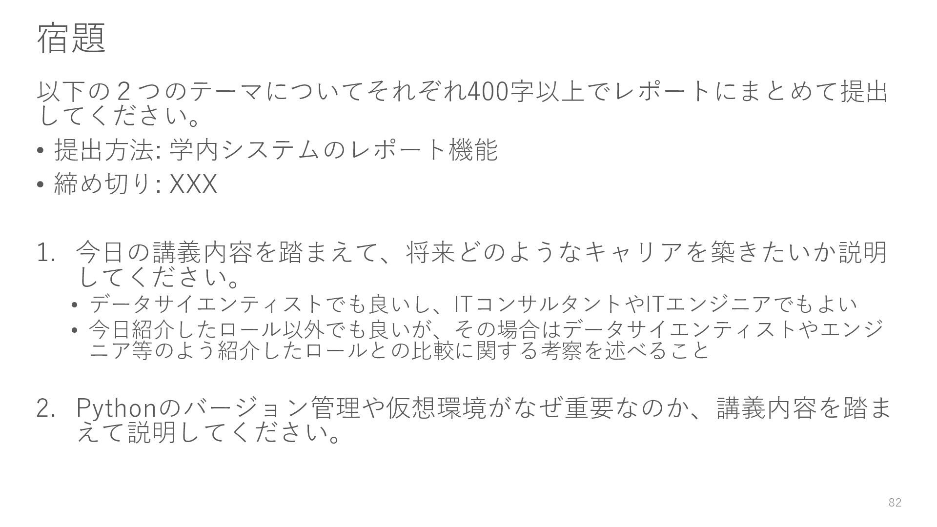 今日の講義内容を踏まえて、将来どのようなキャリアを築きたいか説明 してください。 • データサイエンティストでも良いし、ITコンサルタントやITエンジニアでもよい • 今日紹介したロール以外でも良いが、その場合はデータサイエンティストやエンジ ニア等のよう紹介したロールとの比較に関する考察を述べること 2. Pythonのバージョン管理や仮想環境がなぜ重要なのか、講義内容を踏ま えて説明してください。 82