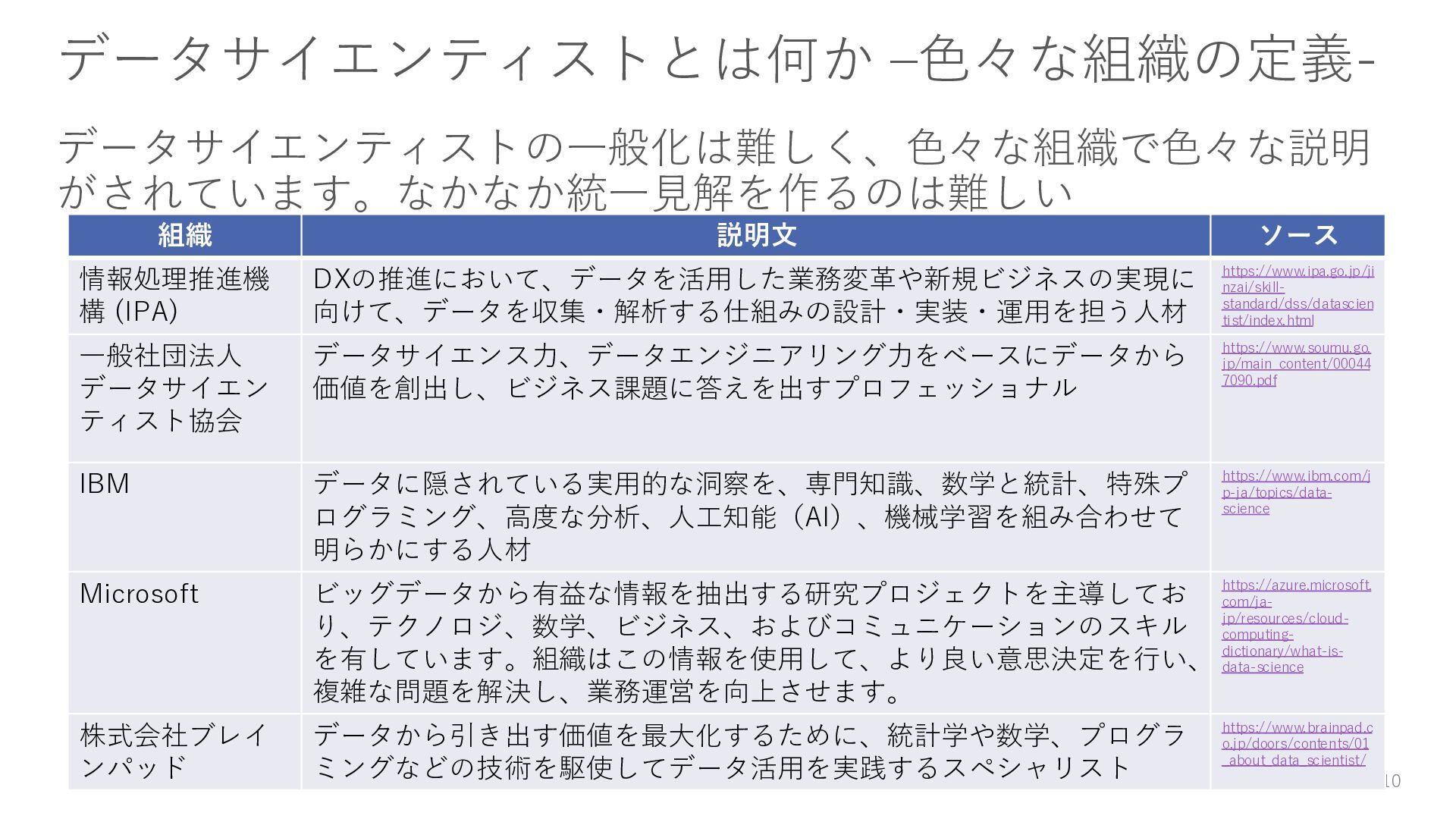 (IPA) DXの推進において、データを活用した業務変革や新規ビジネスの実現に 向けて、データを収集・解析する仕組みの設計・実装・運用を担う人材 https://www.ipa.go.jp/ji nzai/skill- standard/dss/datascien tist/index.html 一般社団法人 データサイエン ティスト協会 データサイエンス力、データエンジニアリング力をベースにデータから 価値を創出し、ビジネス課題に答えを出すプロフェッショナル https://www.soumu.go. jp/main_content/00044 7090.pdf IBM データに隠されている実用的な洞察を、専門知識、数学と統計、特殊プ ログラミング、高度な分析、人工知能(AI)、機械学習を組み合わせて 明らかにする人材 https://www.ibm.com/j p-ja/topics/data- science Microsoft ビッグデータから有益な情報を抽出する研究プロジェクトを主導してお り、テクノロジ、数学、ビジネス、およびコミュニケーションのスキル を有しています。組織はこの情報を使用して、より良い意思決定を行い、 複雑な問題を解決し、業務運営を向上させます。 https://azure.microsoft. com/ja- jp/resources/cloud- computing- dictionary/what-is- data-science 株式会社ブレイ ンパッド データから引き出す価値を最大化するために、統計学や数学、プログラ ミングなどの技術を駆使してデータ活用を実践するスペシャリスト https://www.brainpad.c o.jp/doors/contents/01 _about_data_scientist/