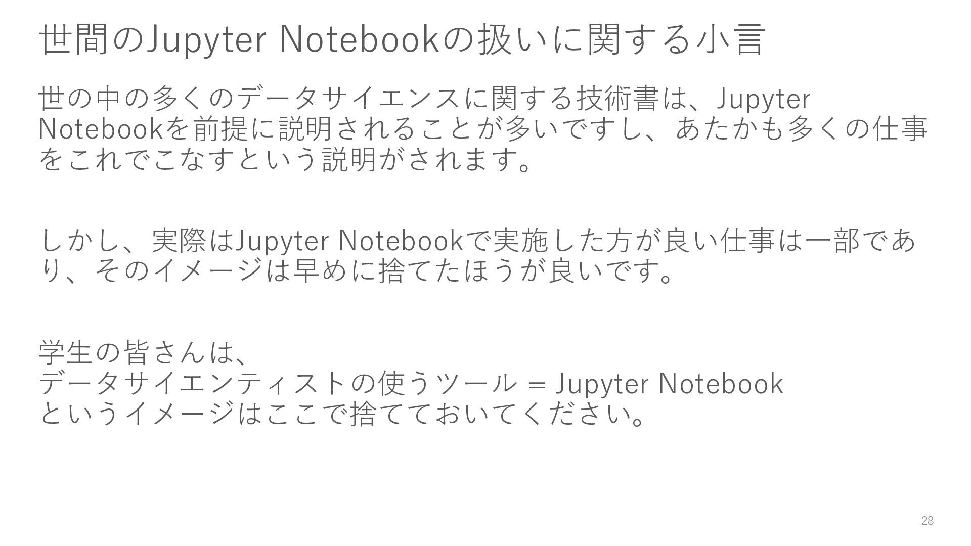 この講義では、機械学習アルゴリズムそのものの詳細よりも、データサイエンティストとして実務で成果を出すための基礎的かつ実践的な技能を重視しています。