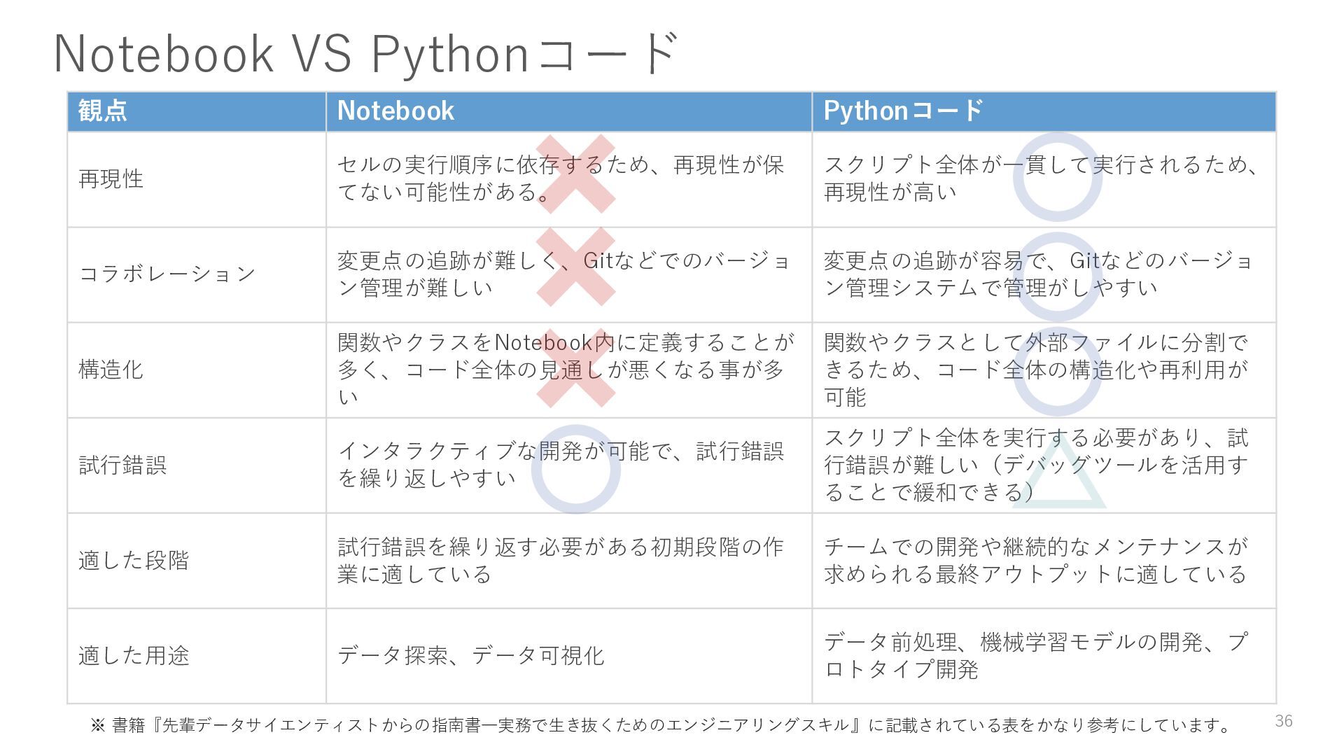 ン管理が難しい 変更点の追跡が容易で、Gitなどのバージョ ン管理システムで管理がしやすい 構造化 関数やクラスをNotebook内に定義することが 多く、コード全体の見通しが悪くなる事が多 い 関数やクラスとして外部ファイルに分割で きるため、コード全体の構造化や再利用が 可能 試行錯誤 インタラクティブな開発が可能で、試行錯誤 を繰り返しやすい スクリプト全体を実行する必要があり、試 行錯誤が難しい(デバッグツールを活用す ることで緩和できる) 適した段階 試行錯誤を繰り返す必要がある初期段階の作 業に適している チームでの開発や継続的なメンテナンスが 求められる最終アウトプットに適している 適した用途 データ探索、データ可視化 データ前処理、機械学習モデルの開発、プ ロトタイプ開発 Notebook VS Pythonコード 36 ※ 書籍『先輩データサイエンティストからの指南書―実務で生き抜くためのエンジニアリングスキル』に記載されている表をかなり参考にしています。