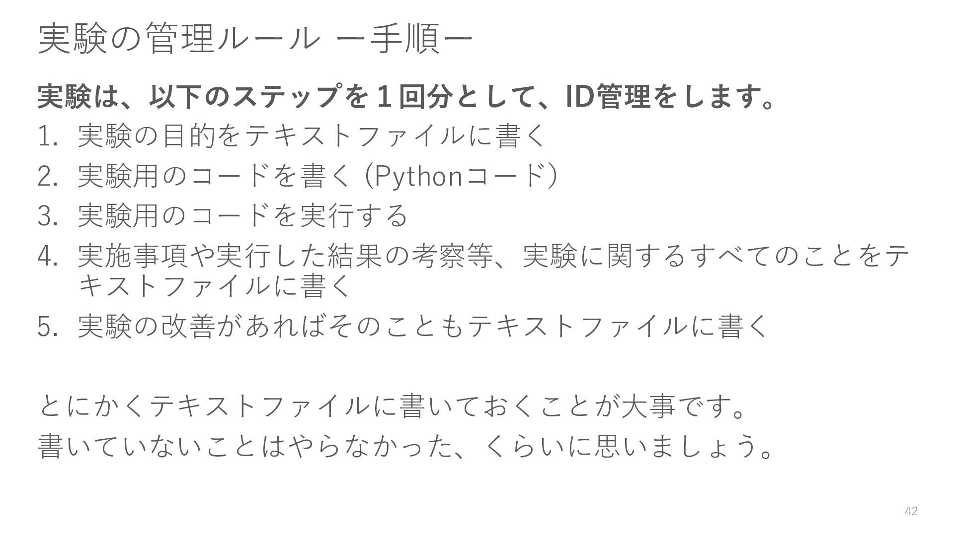 4. 実施事項や実行した結果の考察等、実験に関するすべてのことをテ キストファイルに書く 5. 実験の改善があればそのこともテキストファイルに書く とにかくテキストファイルに書いておくことが大事です。 書いていないことはやらなかった、くらいに思いましょう。 42