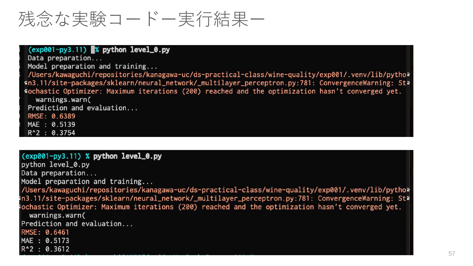 どんな些細な修正でも、それは別の実験として実施する。このとき過 去のコードはコピペしてOK。ただしこれは、ソフトウェアエンジニ アリングにおいてはNGな行為であり、データサイエンティスト特有 のこととして理解してください。再利用できるコードを書く方が望ま しいです。 43