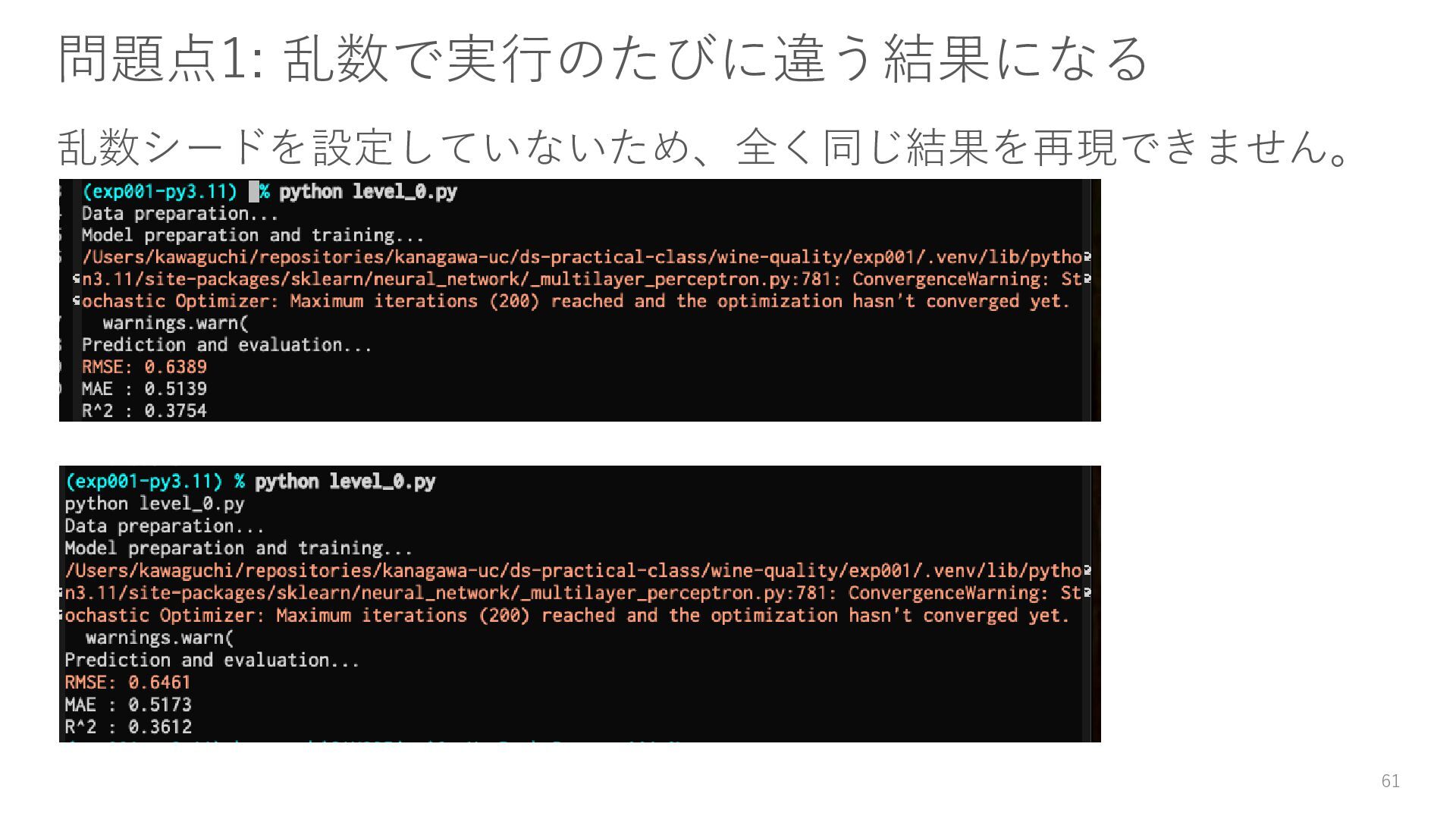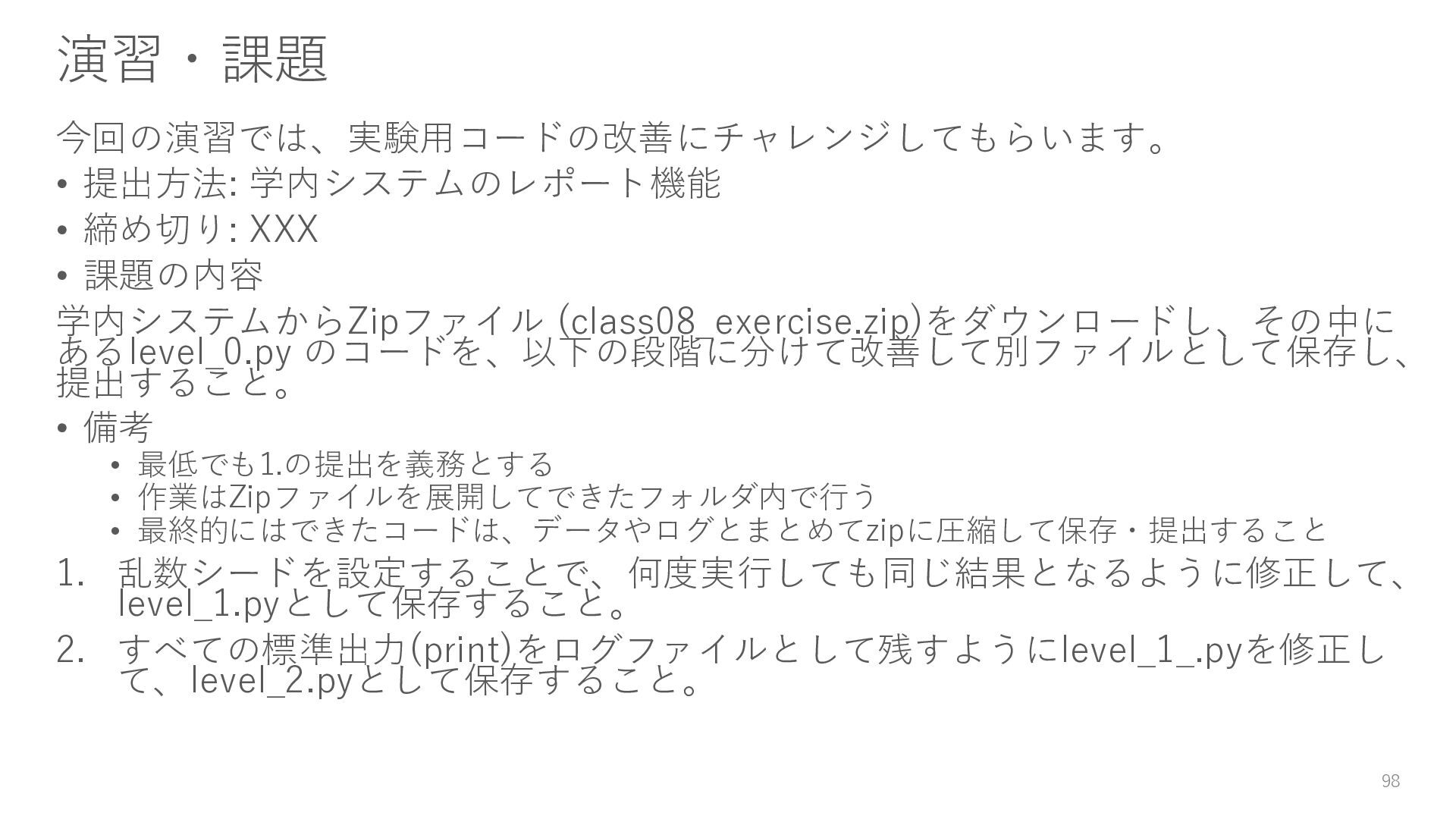 学内システムからZipファイル (class08_exercise.zip)をダウンロードし、その中に あるlevel_0.py のコードを、以下の段階に分けて改善して別ファイルとして保存し、 提出すること。 • 備考 • 最低でも1.の提出を義務とする • 作業はZipファイルを展開してできたフォルダ内で行う • 最終的にはできたコードは、データやログとまとめてzipに圧縮して保存・提出すること 1. 乱数シードを設定することで、何度実行しても同じ結果となるように修正して、 level_1.pyとして保存すること。 2. すべての標準出力(print)をログファイルとして残すようにlevel_1_.pyを修正し て、level_2.pyとして保存すること。 98