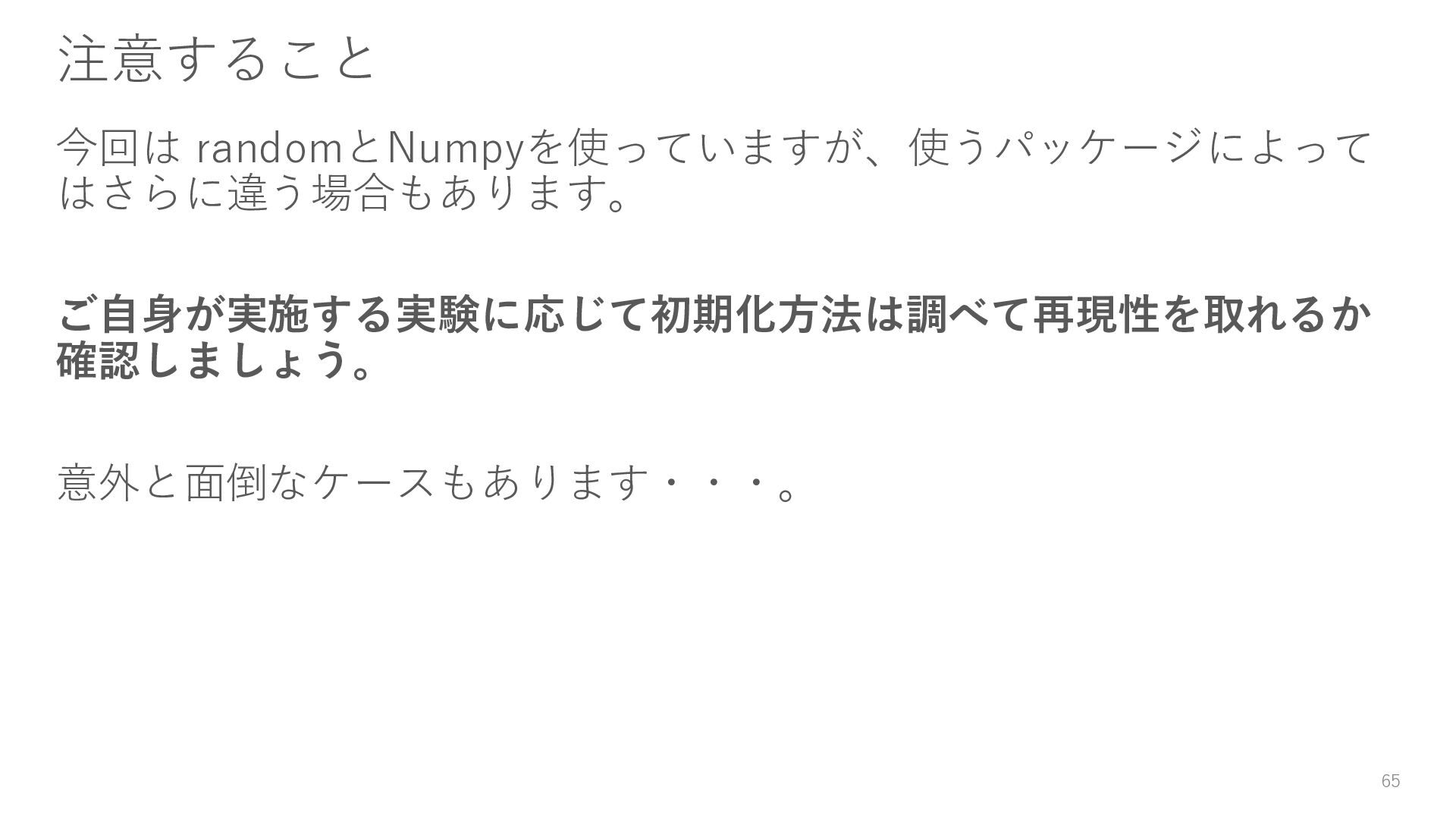 18. 残念な実験コードの改善(再掲) • 乱数で実行のたびに違う結果になる → Level1: 乱数シードを設定する • ログが標準出力のみでどこにも残らない → Level2: