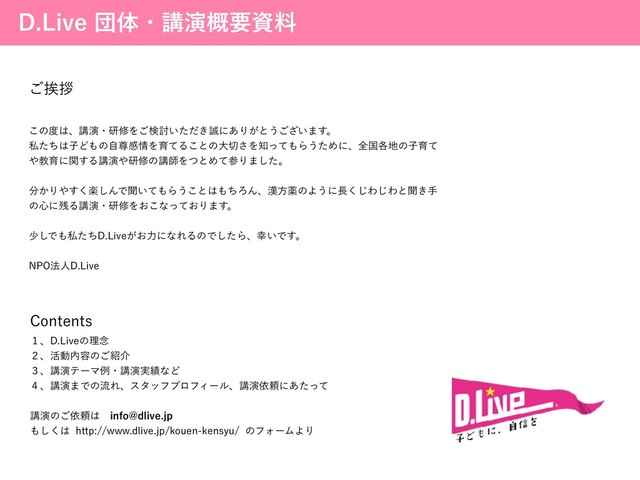 )ࠃཱ੨গڭҭৼڵػߏௐࠪΑΓ ࢠͲʹؔ͢Δ༷ʑͳௐ͔ࠪΒɺকདྷʹରͯ͠ر ͕ͳ͍ࢠͲ͕ଟ͍͜ͱ͕ࢦఠ͞Ε͍ͯΔɻ ͳͥʁ ࣗμϝͩͱࢥ͏ࢠͲ͕ ͍Δɻઐ༻ޠͰ ࣗଚײͷԼͱݴΘΕΔɻ എܠʹ ҬͷେਓͱͷؔΘΓͷݮগʹͱ ͳ͍ʮࣗΛݟͯ͘Ε͍ͯΔʯ ͱ͍͏ײ֮ͷগͳ͞ ใԽࣾձͷൃలͱՁ؍ͷଟ༷ ԽʹΑΔཧ૾ͱൺֱରͷ૿Ճ 4/4ͷීٴʹΑΔʮଞऀ͔ΒݟΒ ΕΔࣗʯΛڧ͘ҙࣝ͢Δڥ ͔ͩΒ େࣄʹͯ͘͠ΕΔ҆৺ײ Ͱ͖ͨʂͱ͍͏ܦݧ ࣗͷ͜ͱΛཧղͯ͘͠ΕΔେ ਓ͕͍Δ҆৺Ͱ͖ΔډॴΛ Ҭʹͭ͘Δ͜ͱ͕ඞཁͩͱ%-JWF ߟ͑·͢ɻ কདྷʹر͕࣋ͯΔͨΊʹɺࢠ Ͳʹ߹Θͤͨখ͞ͳޭମݧ ΛॏͶΔ͜ͱ͕ॏཁͩͱ%-JWF ߟ͑·͢ɻ ϝσΟΞ ܝࡌ /),ʮ͓Α͏ؔʱɹژ৽ฉɹே৽ฉɹத৽ฉɹ ಡച৽ฉɹ'.࣎լɹ'.ɹHSFFO[KQɹͳͲ %-JWFͷཧ೦ ͡Ί·ͯ͠ɻදͷాத༸ีͰ͢ɻࢲɺߴߍੜͷͱ͖ෆొߍʹͳΓɺ େֶੜͷͱ͖ʹҾ͖͜ΓΛܦݧ͠·ͨ͠ɻΨϯόΓͨͯ͘ΨϯόΕͳ͍ɻ͢Δؾ࣋ͪɺࣗͰ͕ࣗΑ͔͘Βͳ͍ۤ͠Έɻ ͳʹ͕͠ΜͲ͍ͷ͔͢ΒΘ͔Βͳ͍ɺͦΜͳؾ࣋ͪͰͨ͠ɻ ʮ୭ࣗͷ͜ͱͳΜͯΘ͔ͬͯ͘Εͳ͍ʯͱɺຊؾͰࢥ͍ͬͯ·ͨ͠ɻ ͦΜͳؾ࣋ͪɺݽಠͳࢥ͍ΛࢠͲͨͪʹຯΘͬͯཉ͘͠ͳ͍ͷͰ͢ɻ ࠓɺࢠͲͨͪࣗʹࣗ৴͕࣋ͯͣɺখֶੜ͕ᓔʹͳͬͯපӃʹ௨͏͜ͱ͋͘͠Γ·ͤΜɻ ͲΜͳࢠͲͨͪʹՄೳੑ͕͋Δɻ ͦ͏৴͍ͯ͡Δ͔Βͦ͜ɺࢠͲͨͪͷͨΊʹɺͳʹ͔͍ͨ͠ͱࢥͬͯɺ͜ͷஂମΛ্ཱͪ͛· ͨ͠ɻ ஂମ֓ཁ ๏ਓ໊ɿ/10๏ਓ%-JWFʢυϥΠϒʣɹओͳ׆ಈɿ࣎լݝࢢɺେࢢɹɹɹɹ ๏ਓઃཱɿɹɹελοϑɿ໊ɹϘϥϯςΟΞ໊